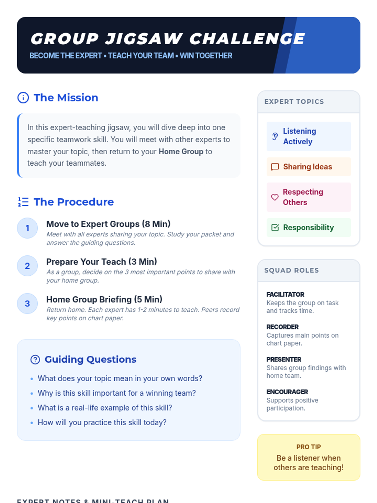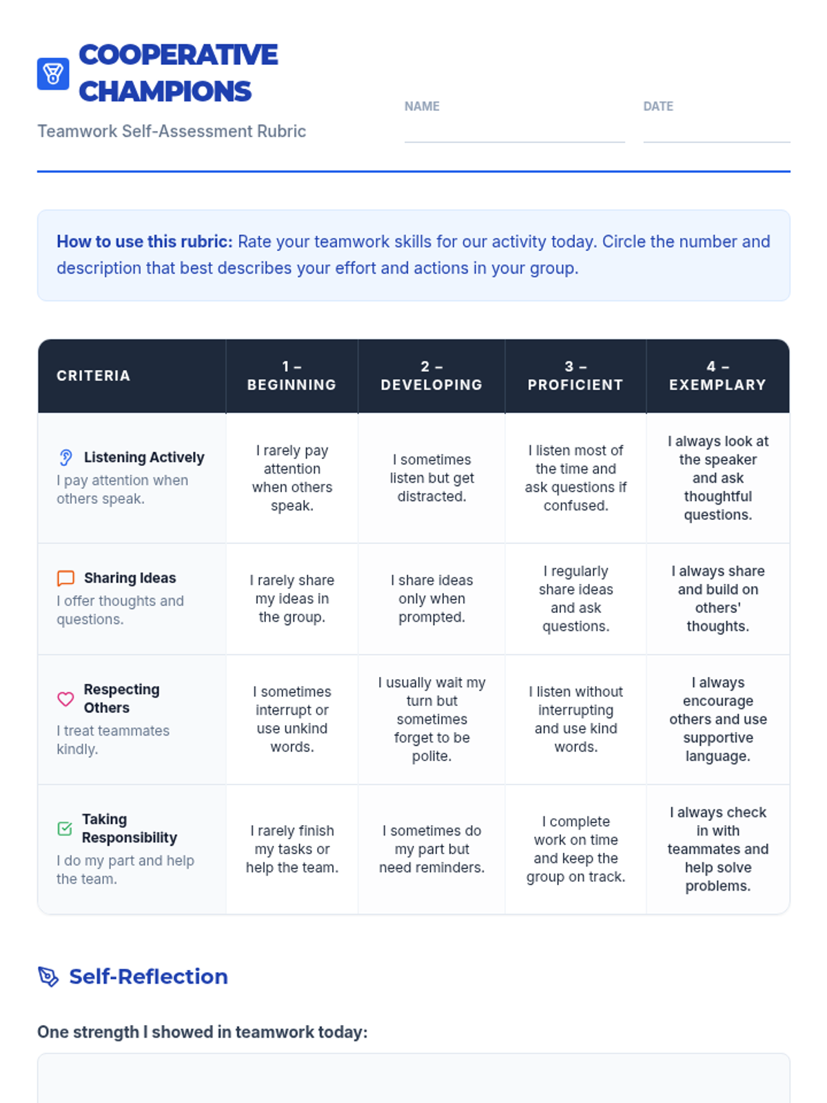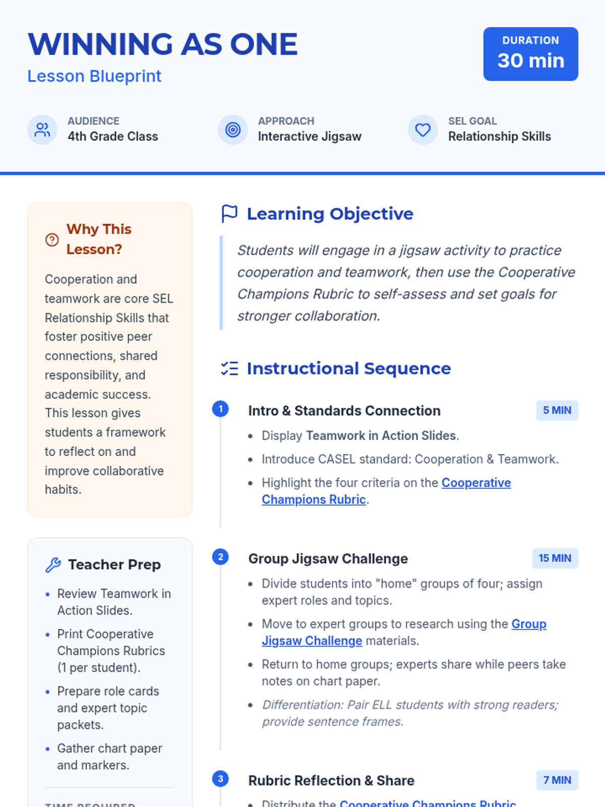A 30-minute Tier 1 SEL lesson for 4th graders focused on cooperation and teamwork through a jigsaw activity and self-assessment.