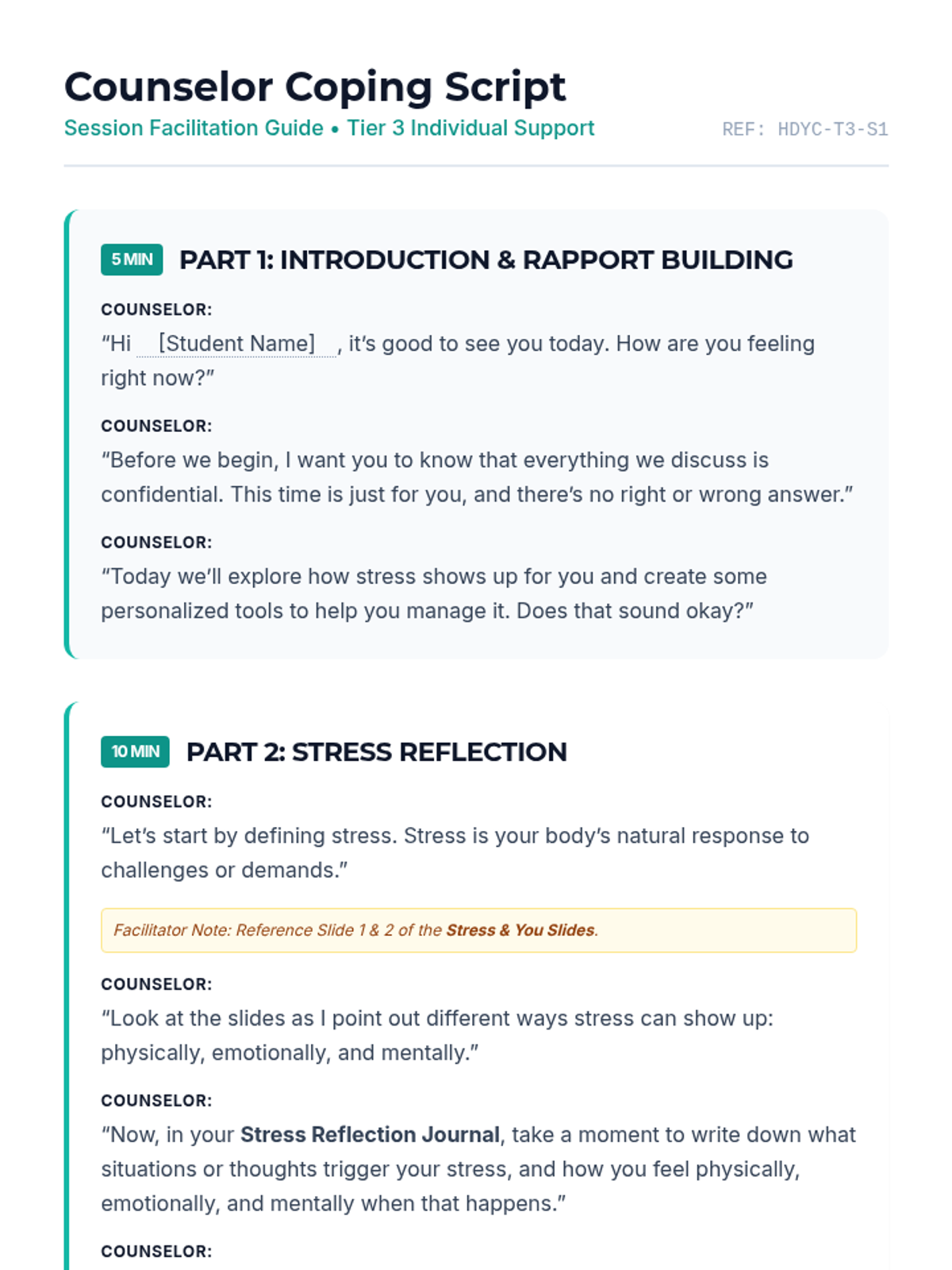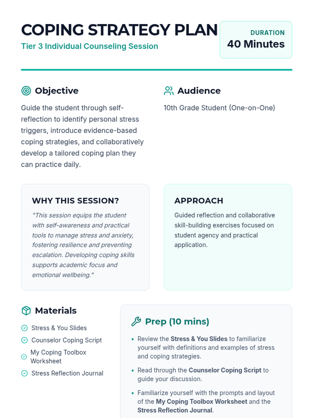 A one-on-one counseling session for 10th graders focused on identifying stress triggers and building a personalized toolkit of coping strategies. This session uses guided reflection and collaborative planning to foster emotional resilience.
