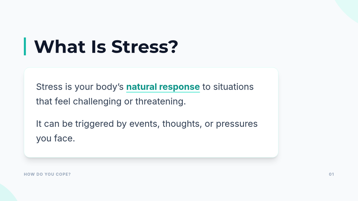 A high school counseling lesson designed to help students identify stressors, understand the physiological response to stress, and build a personalized toolkit of healthy coping strategies. Aligned with Massachusetts Health and Social Emotional Learning standards.