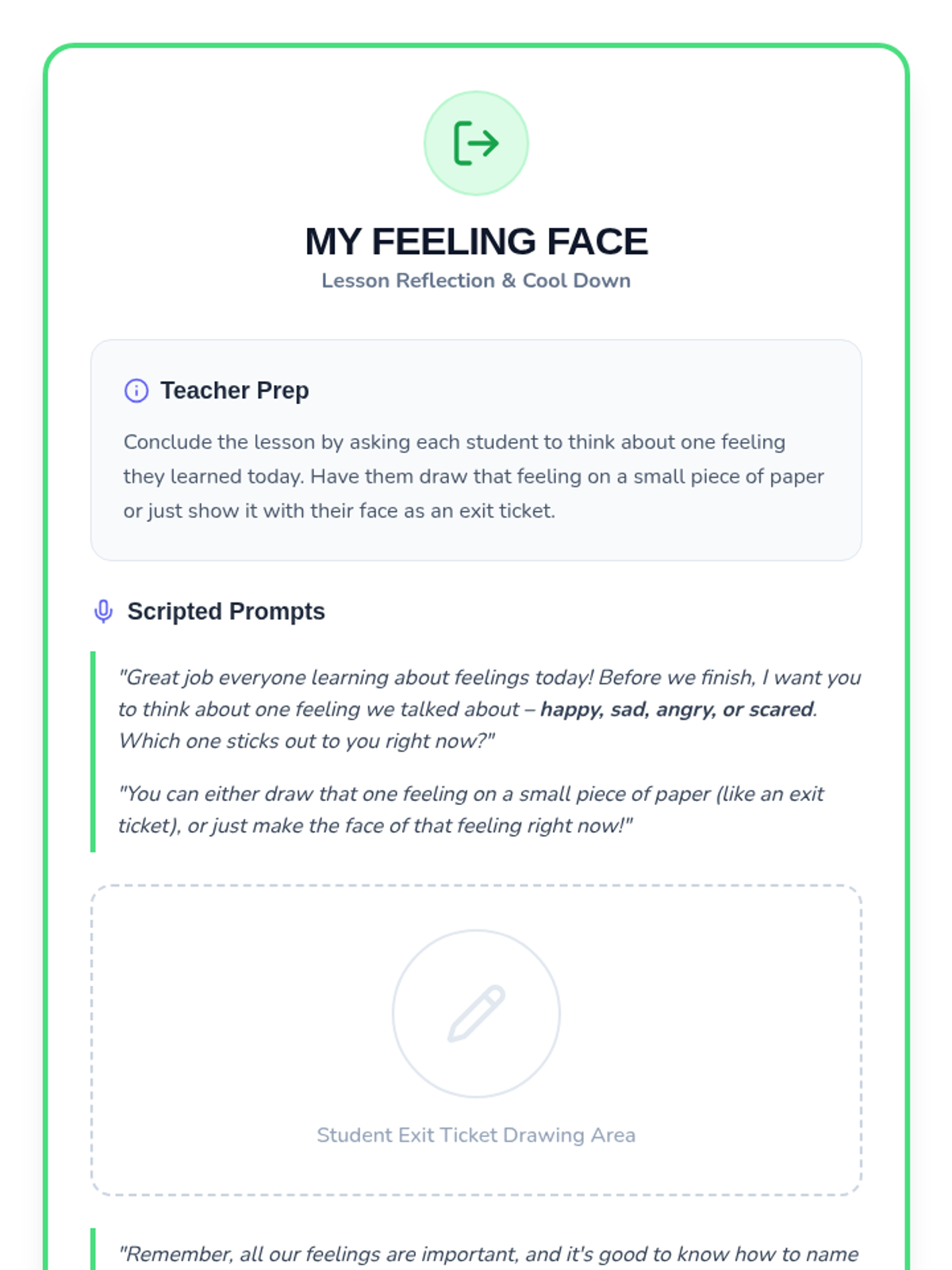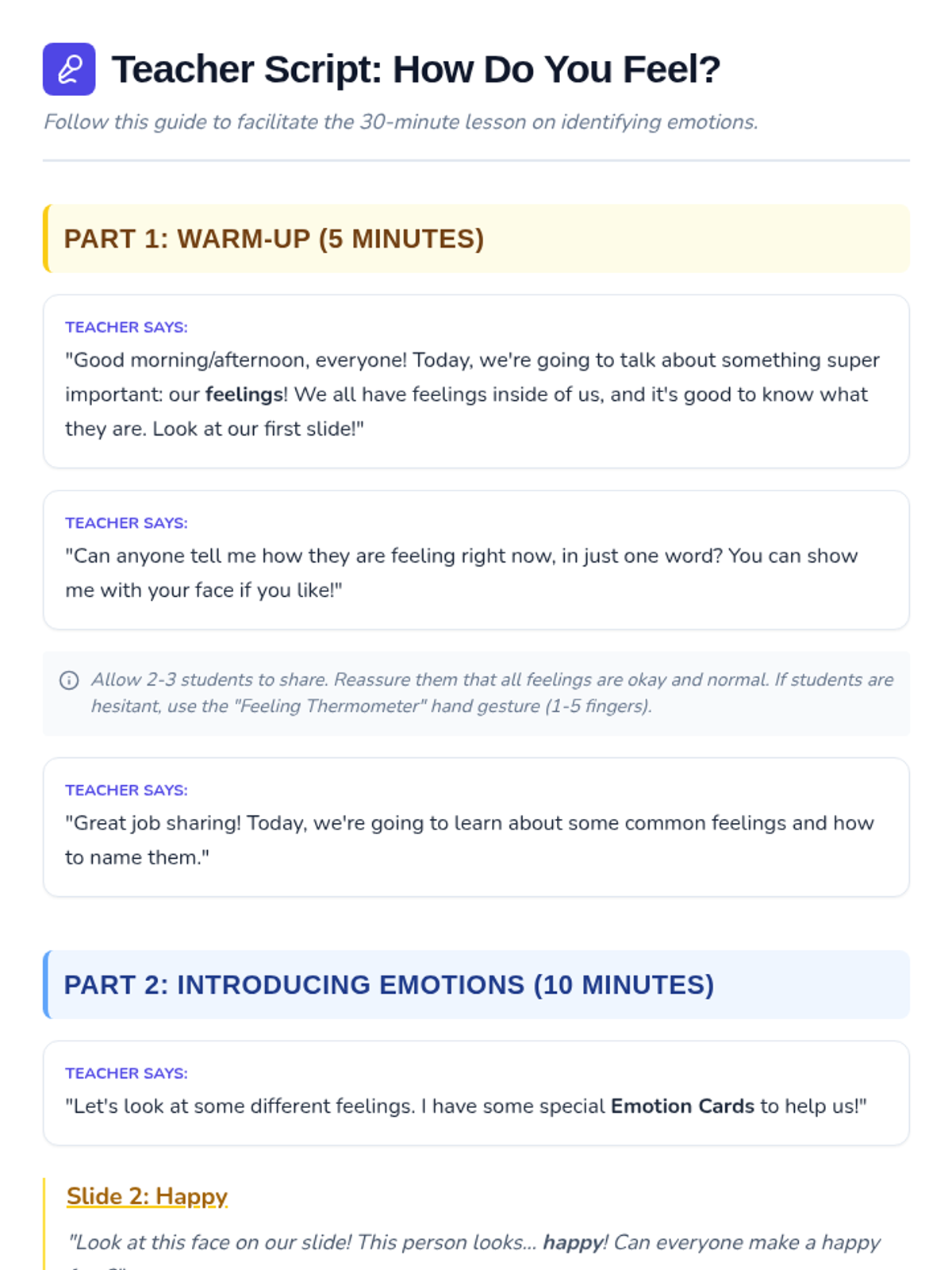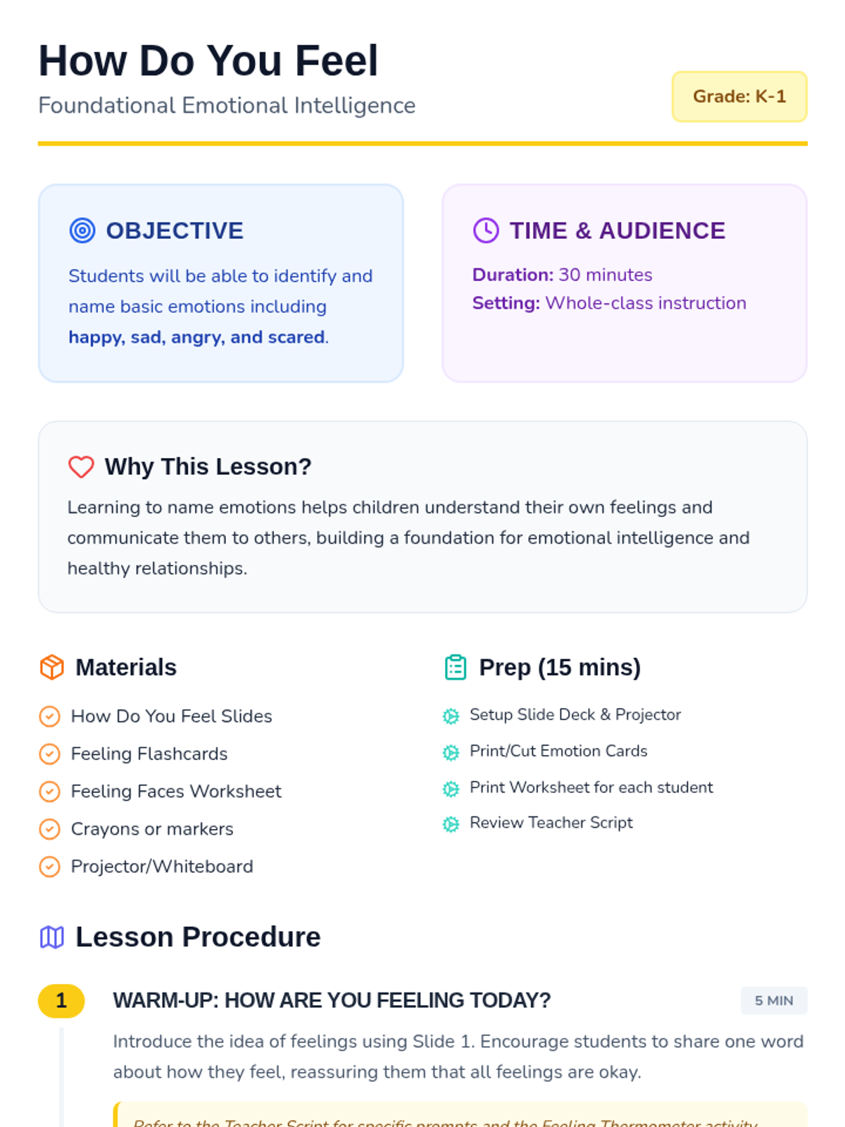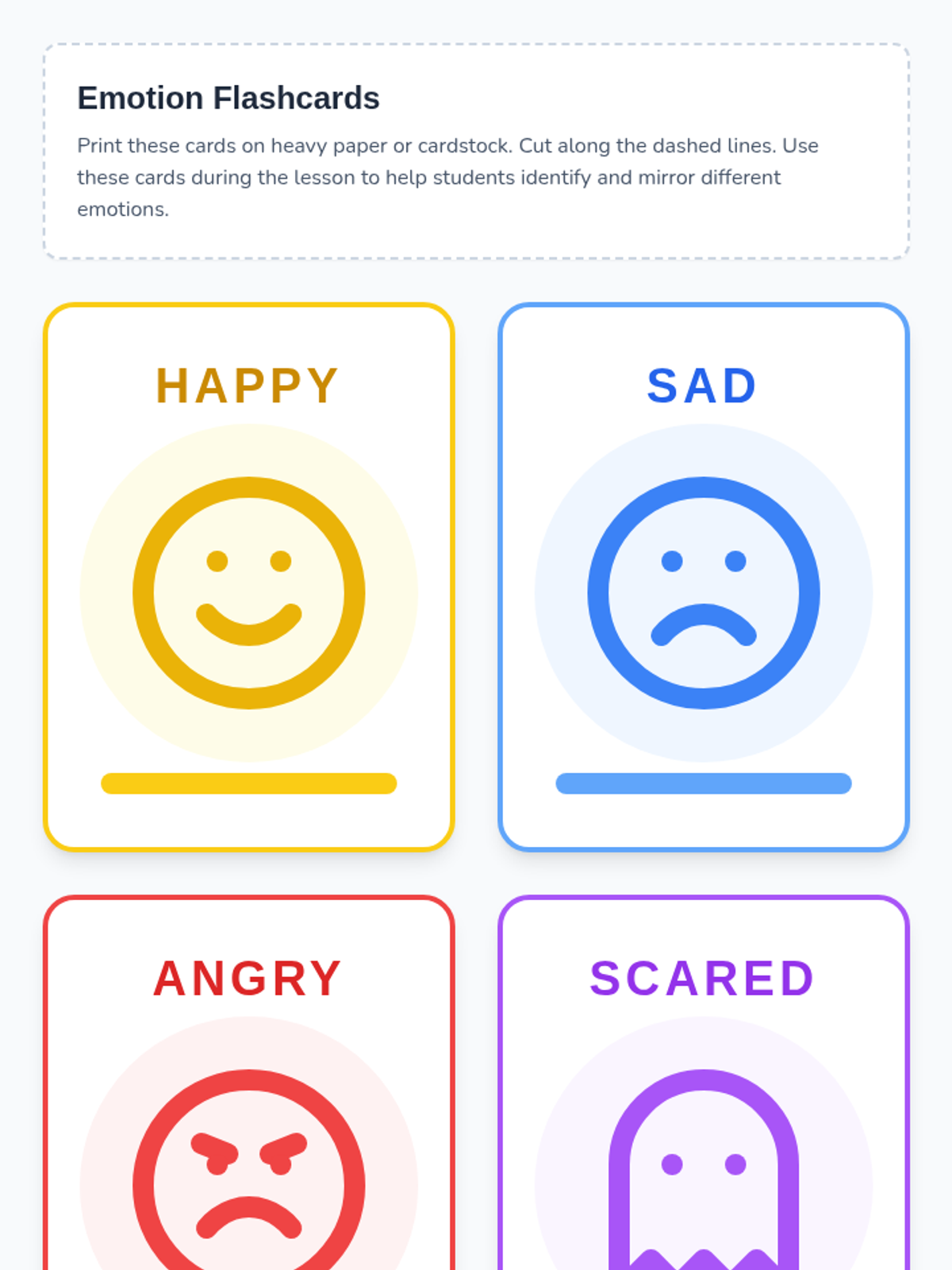 This lesson helps K-1 students identify and name basic emotions through interactive slides, flashcards, and a drawing worksheet. It provides a foundation for emotional intelligence and communication.