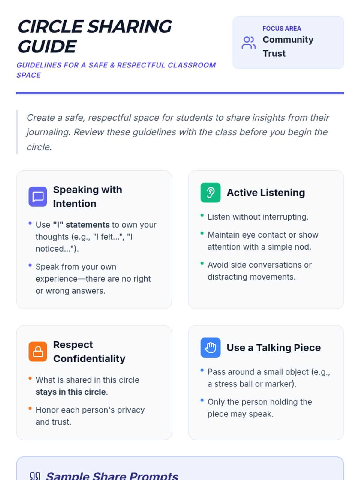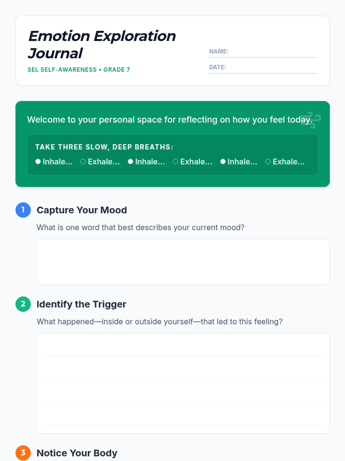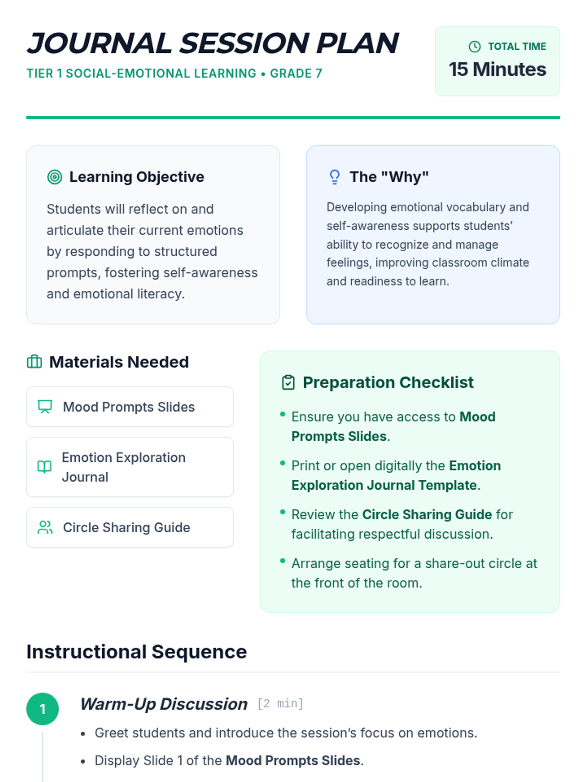 A 15-minute Tier 1 SEL lesson designed to help 7th graders explore and articulate their emotions through guided journaling and a supportive share-out circle.
