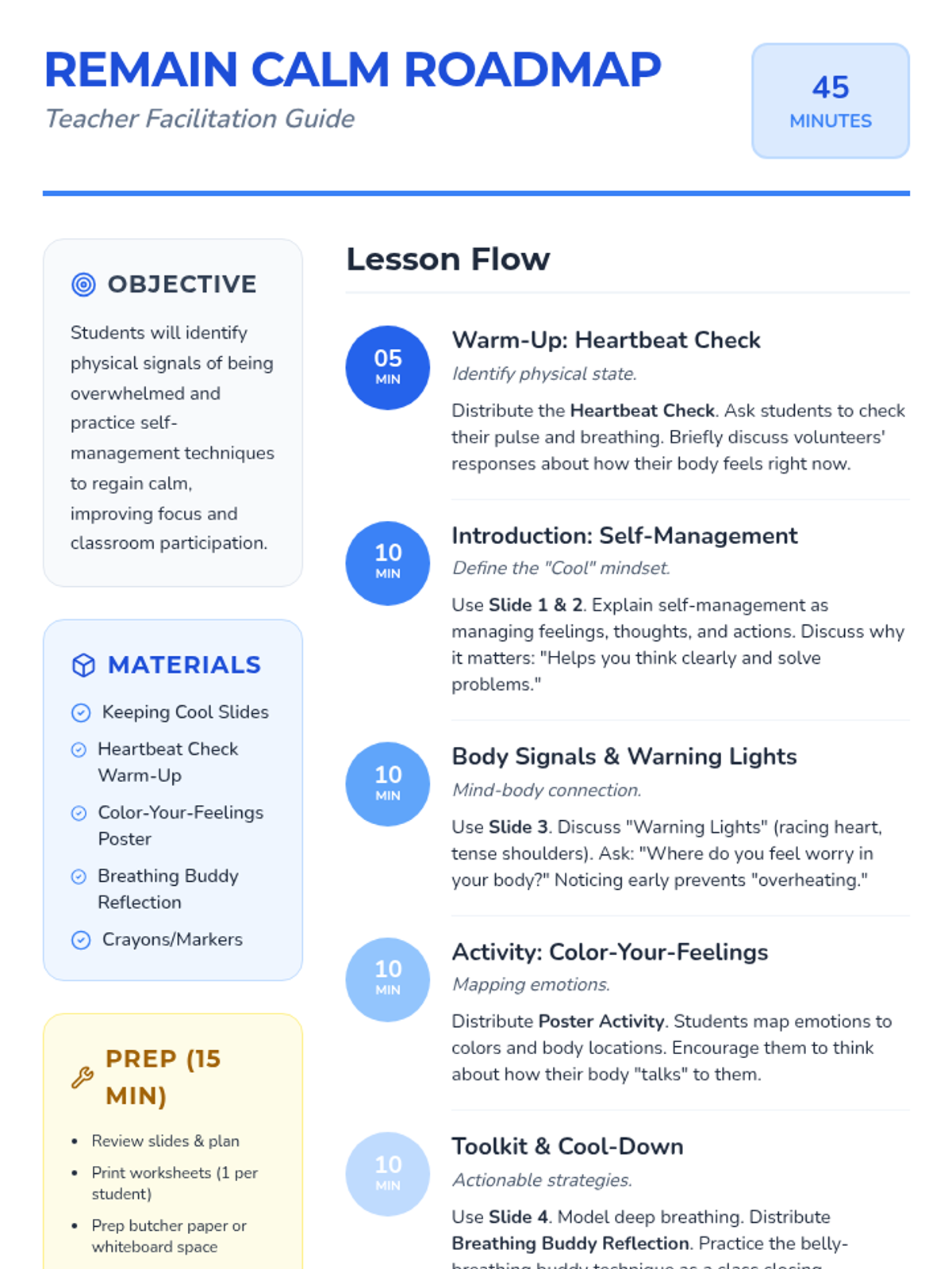 A 45-minute whole-class lesson for 4th graders to introduce self-management, identifying physical signals of emotions, and building a 'Calm Toolkit'.