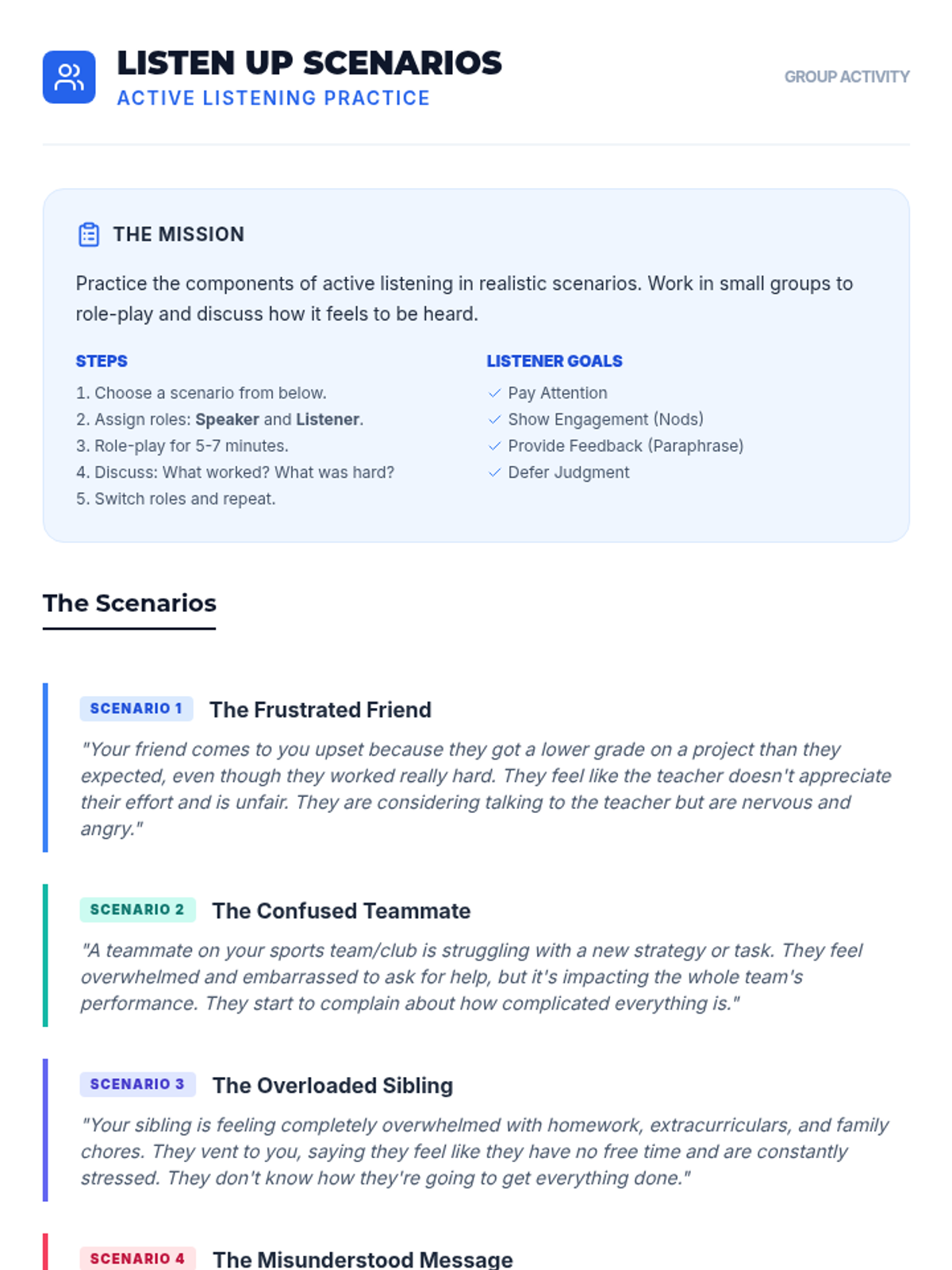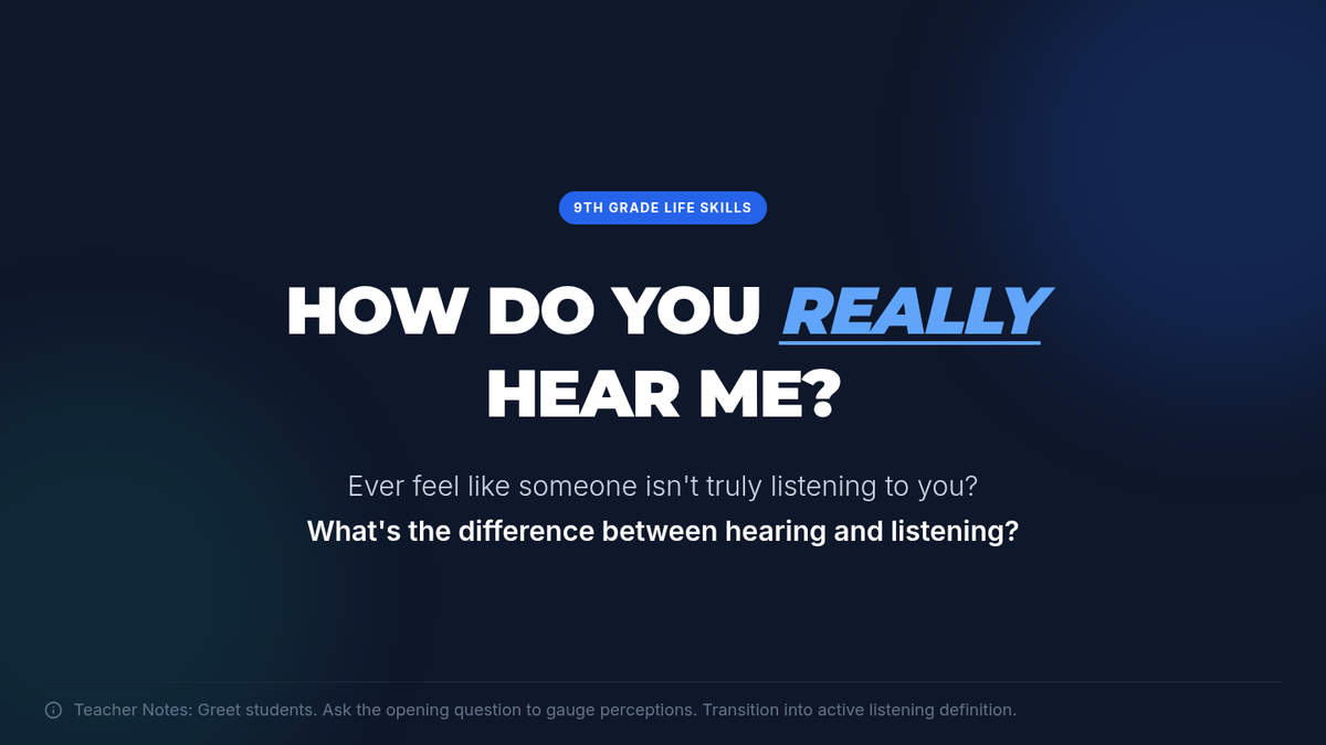 This lesson equips 9th-grade students with active listening skills—paying attention, showing engagement, providing feedback, and deferring judgment—to build stronger relationships and resolve conflicts.