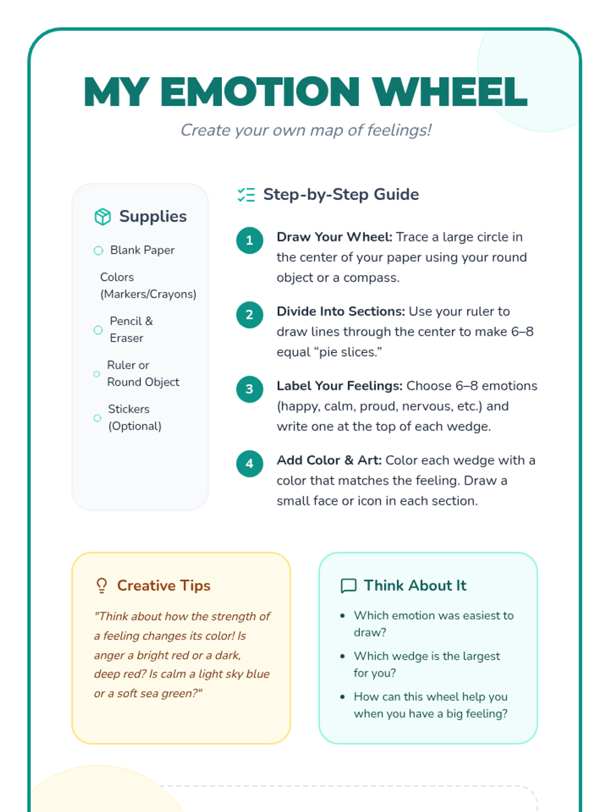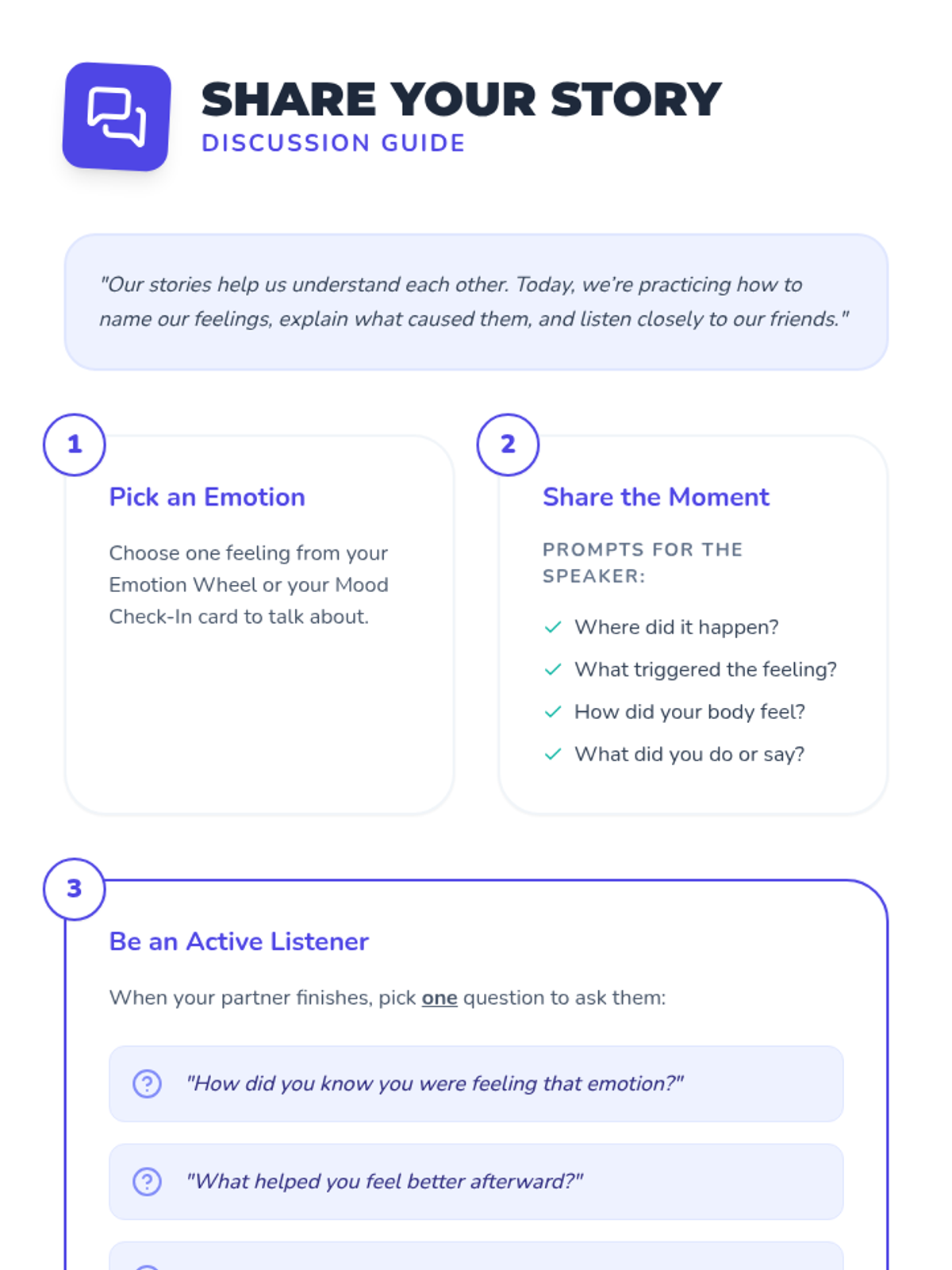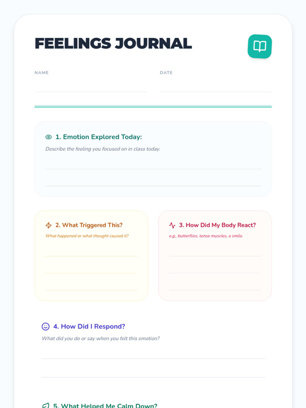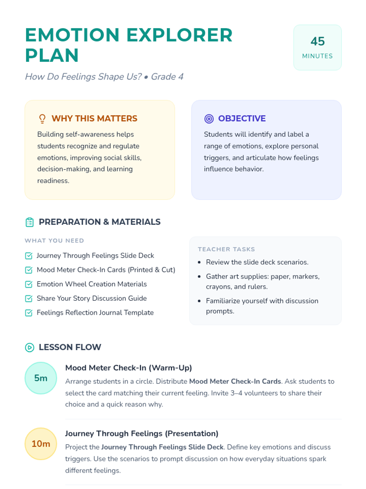 A 45-minute Tier 1 SEL lesson for 4th graders focused on identifying emotions, understanding triggers, and recognizing how feelings influence behavior. Students engage in interactive slides, create an emotion wheel, and participate in peer discussions to build self-awareness.