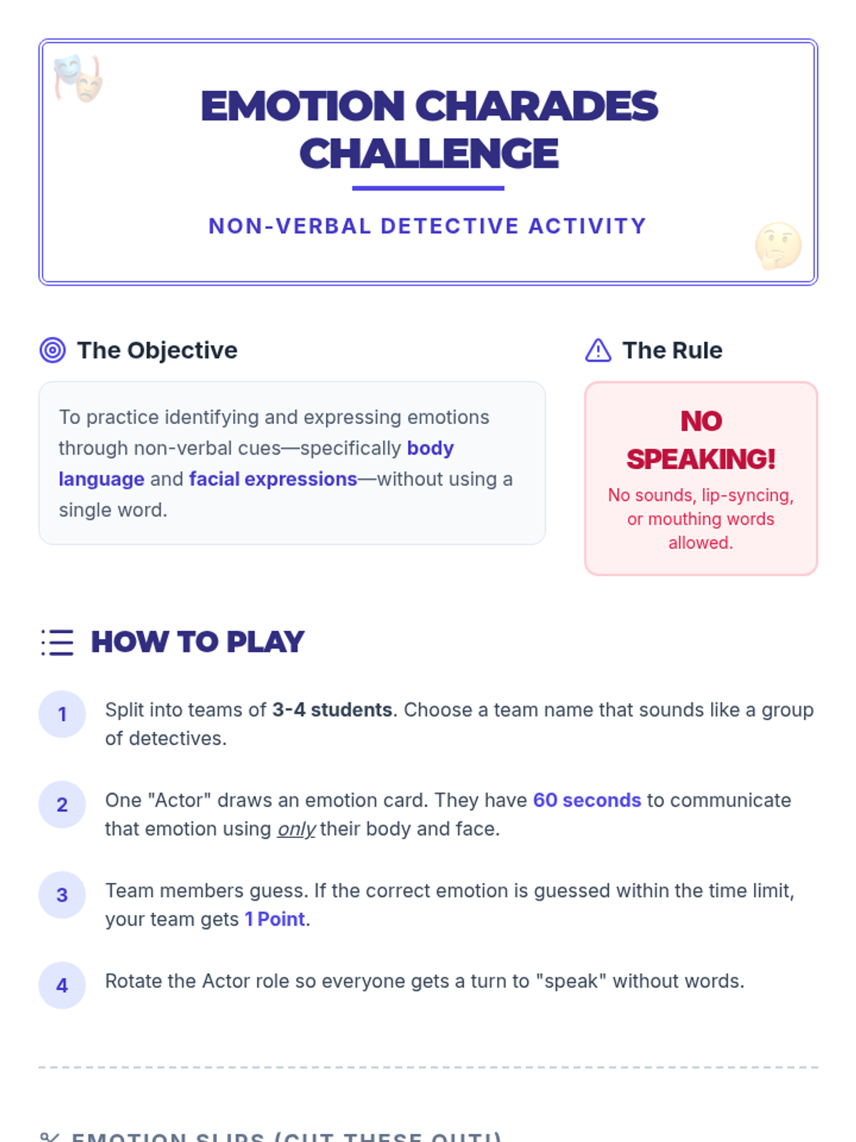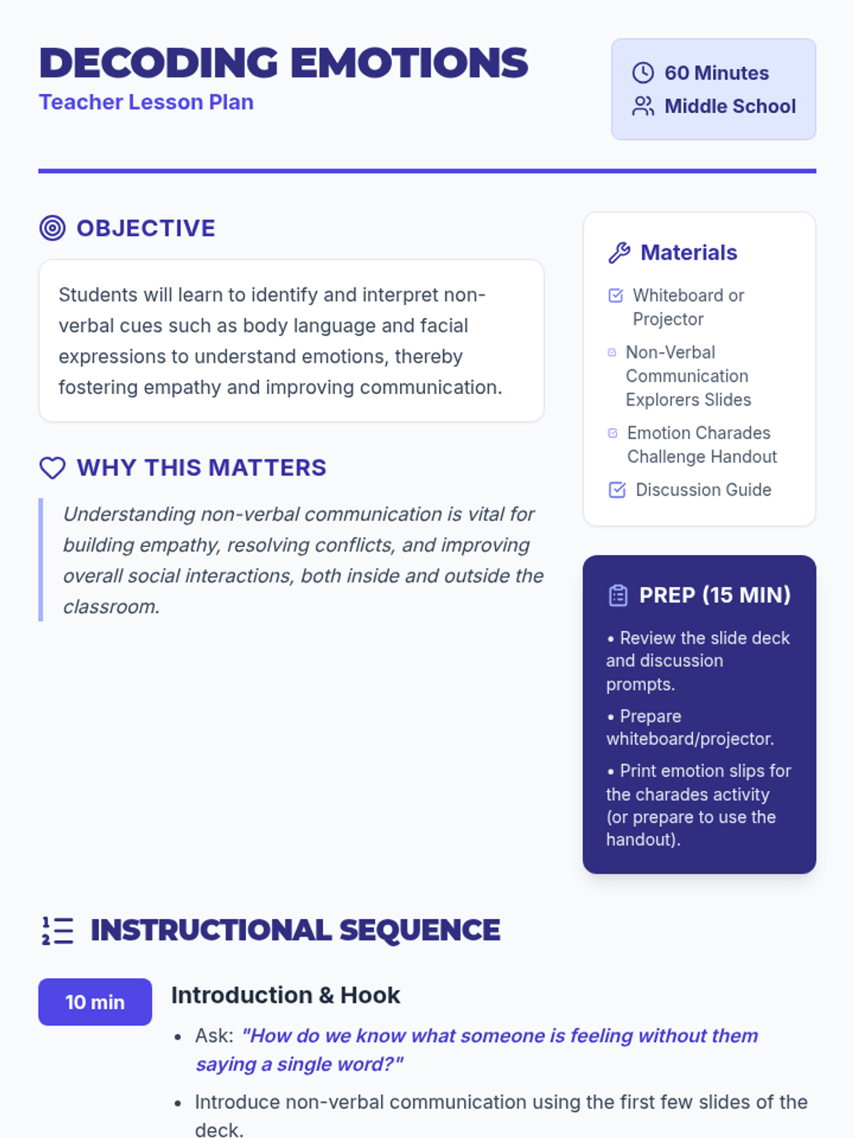 This lesson helps middle school students decode non-verbal cues and understand the powerful language of body language and facial expressions to foster empathy and improve communication.