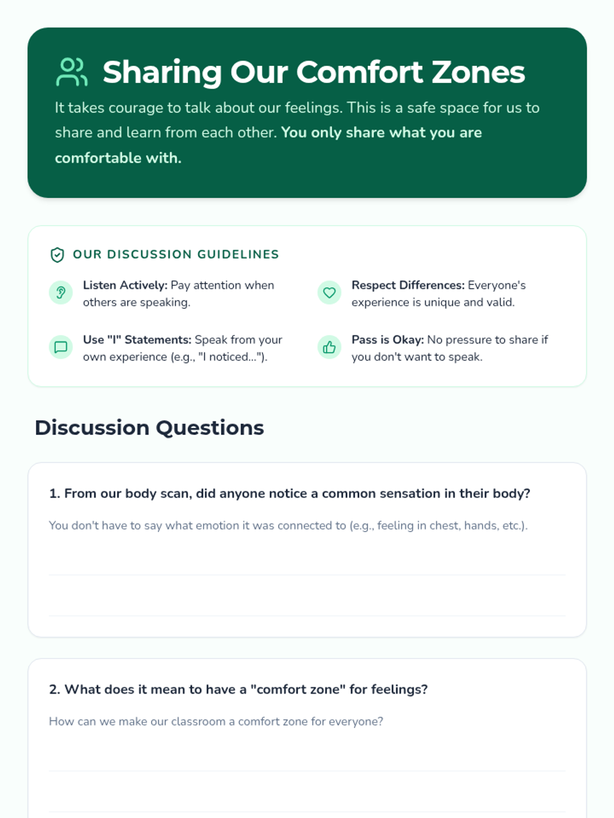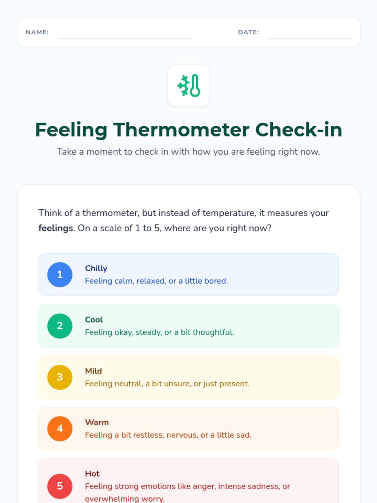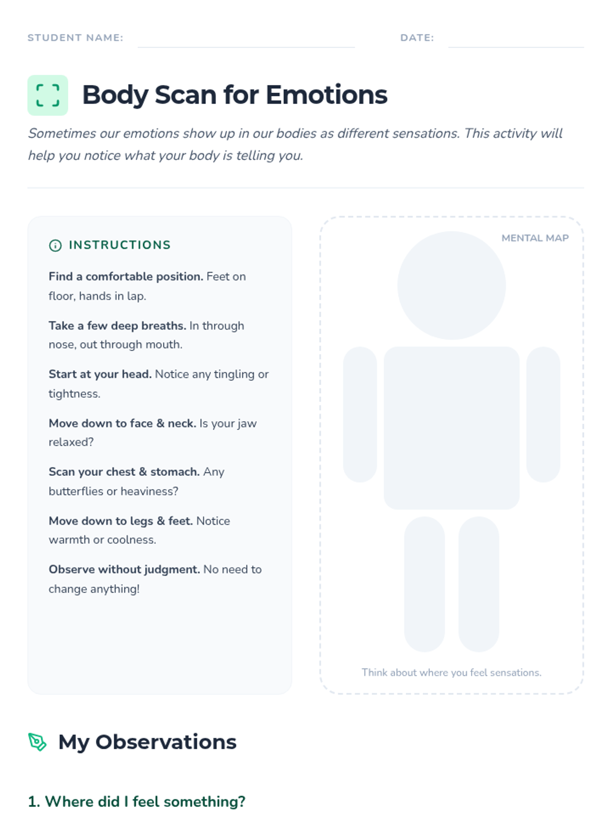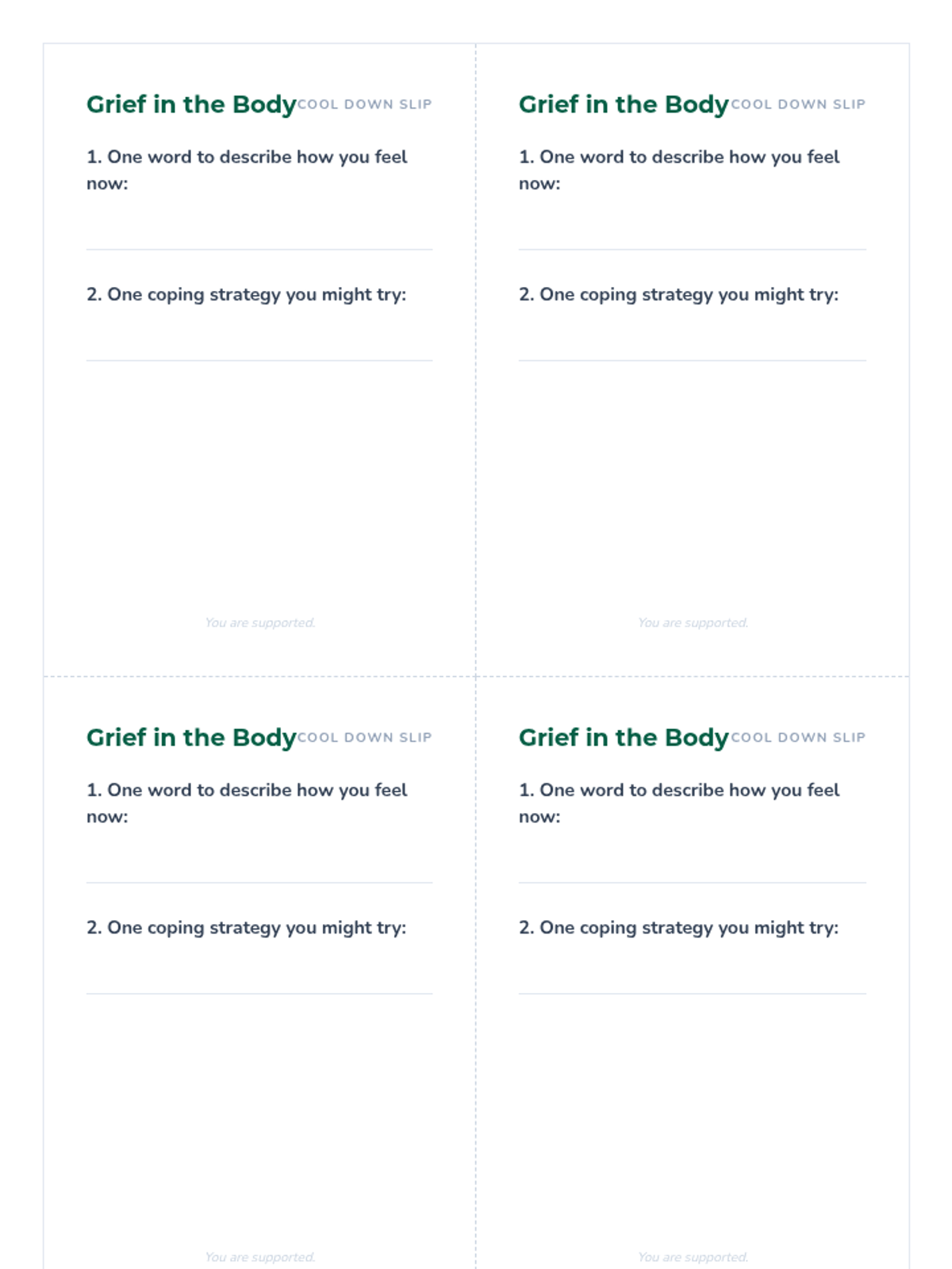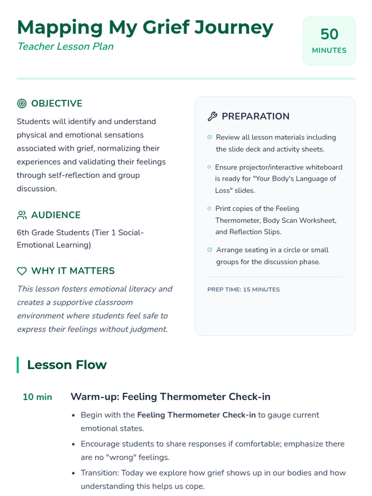 This lesson helps 6th-grade students identify and understand the physical sensations of grief, normalizing their experiences through a body-centered approach. Students will participate in a feeling thermometer check-in, a body scan activity, and a supportive group discussion.