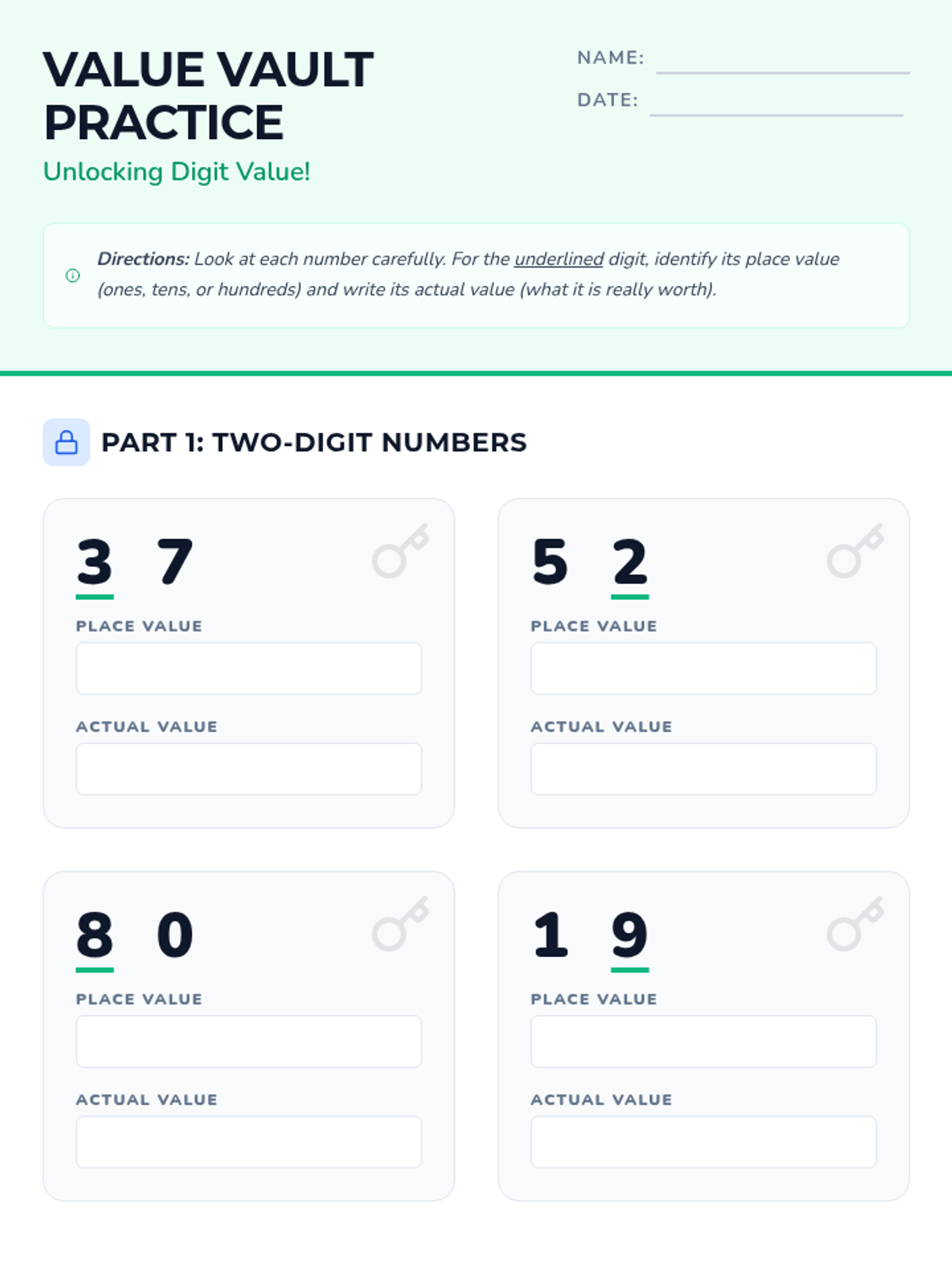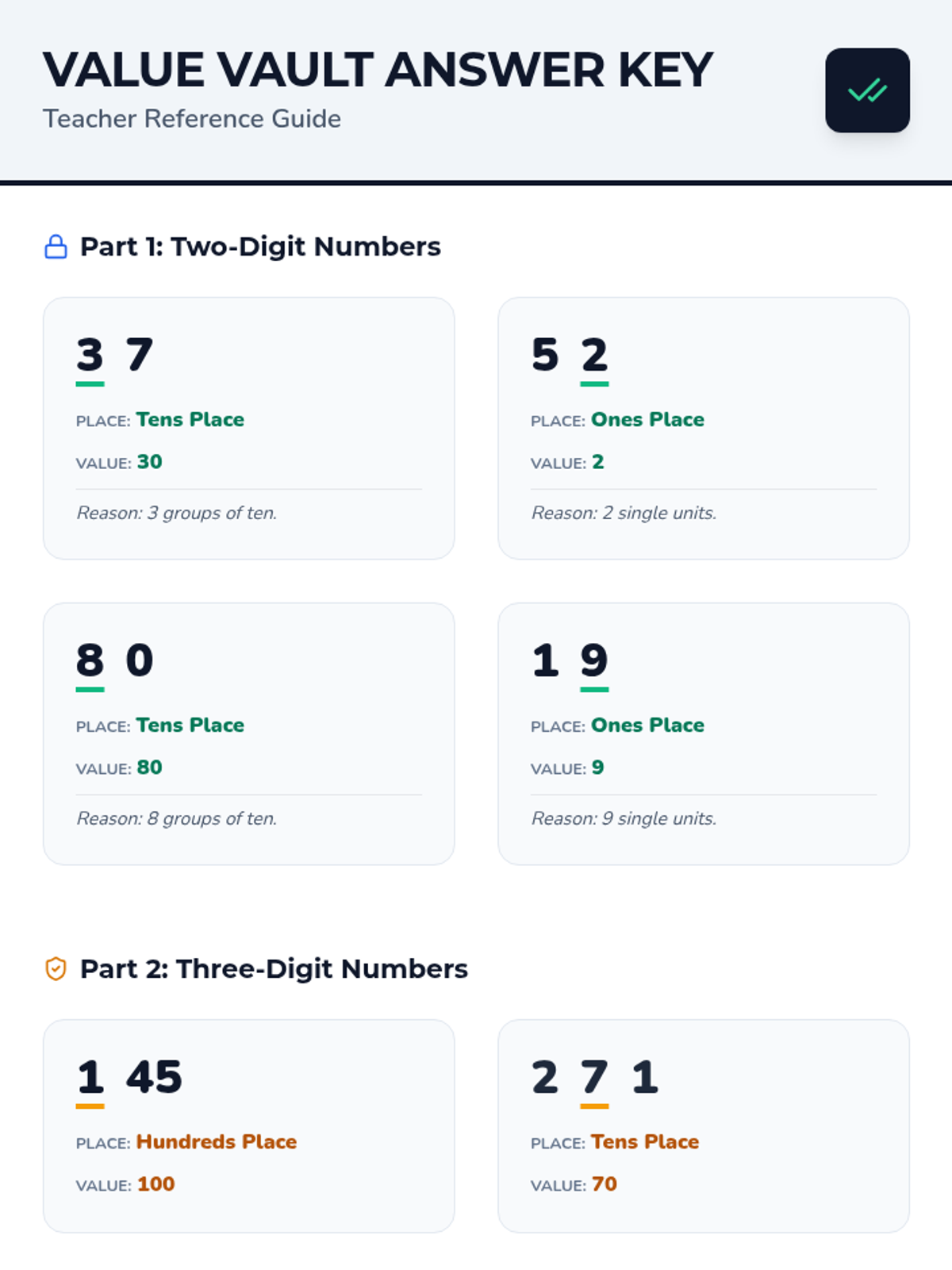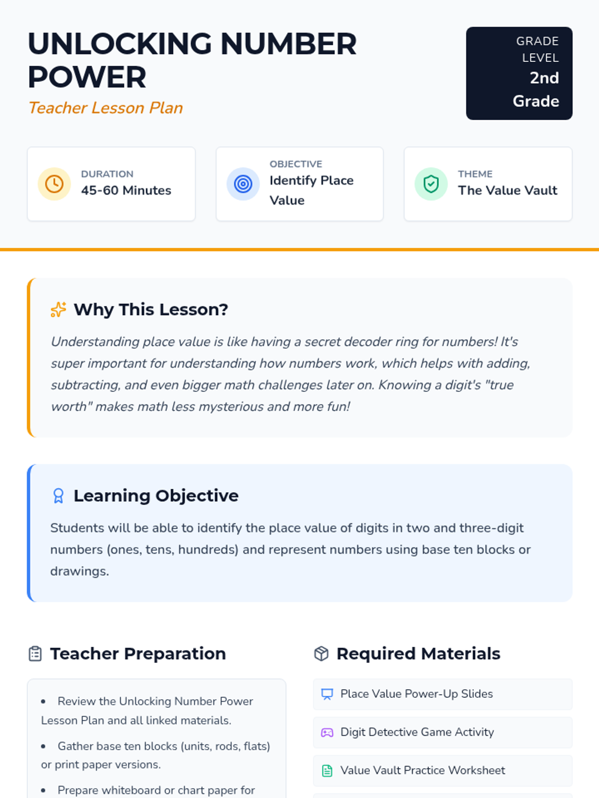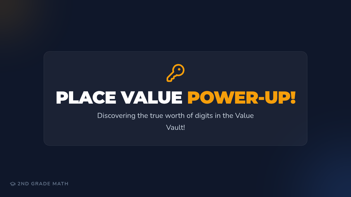 A 2nd-grade math lesson that explores the concept of place value using a 'Value Vault' theme. Students will learn to identify the true worth of digits in two and three-digit numbers through interactive slides, a game, and focused practice.