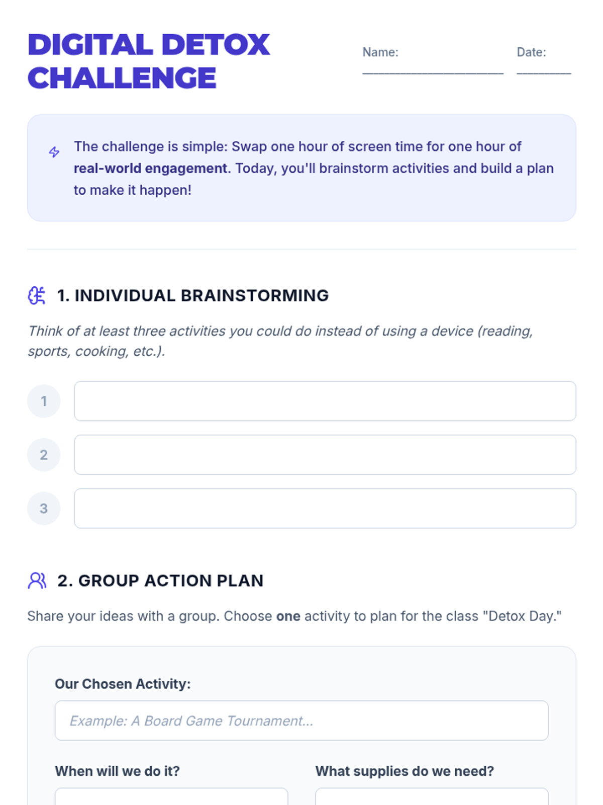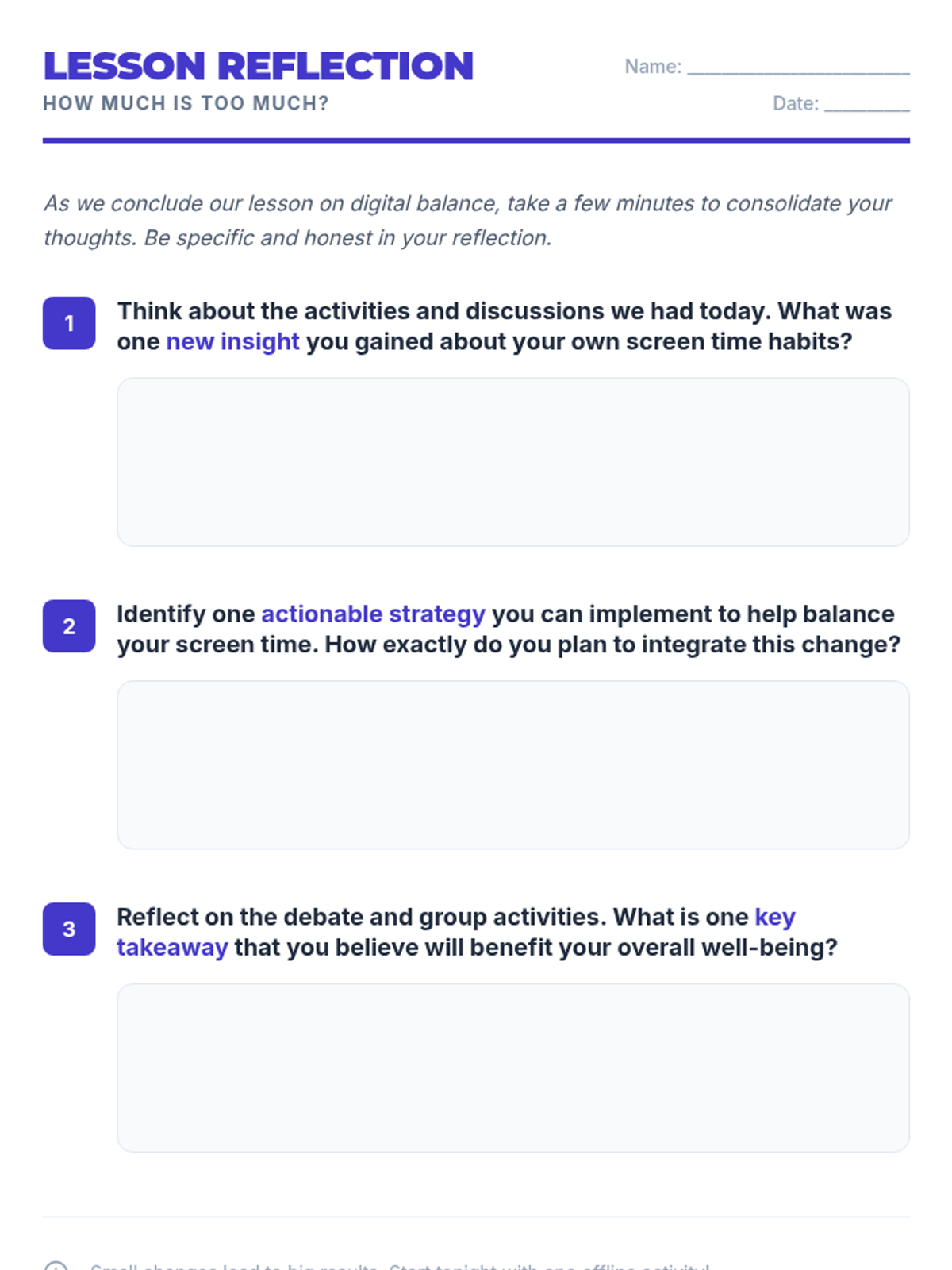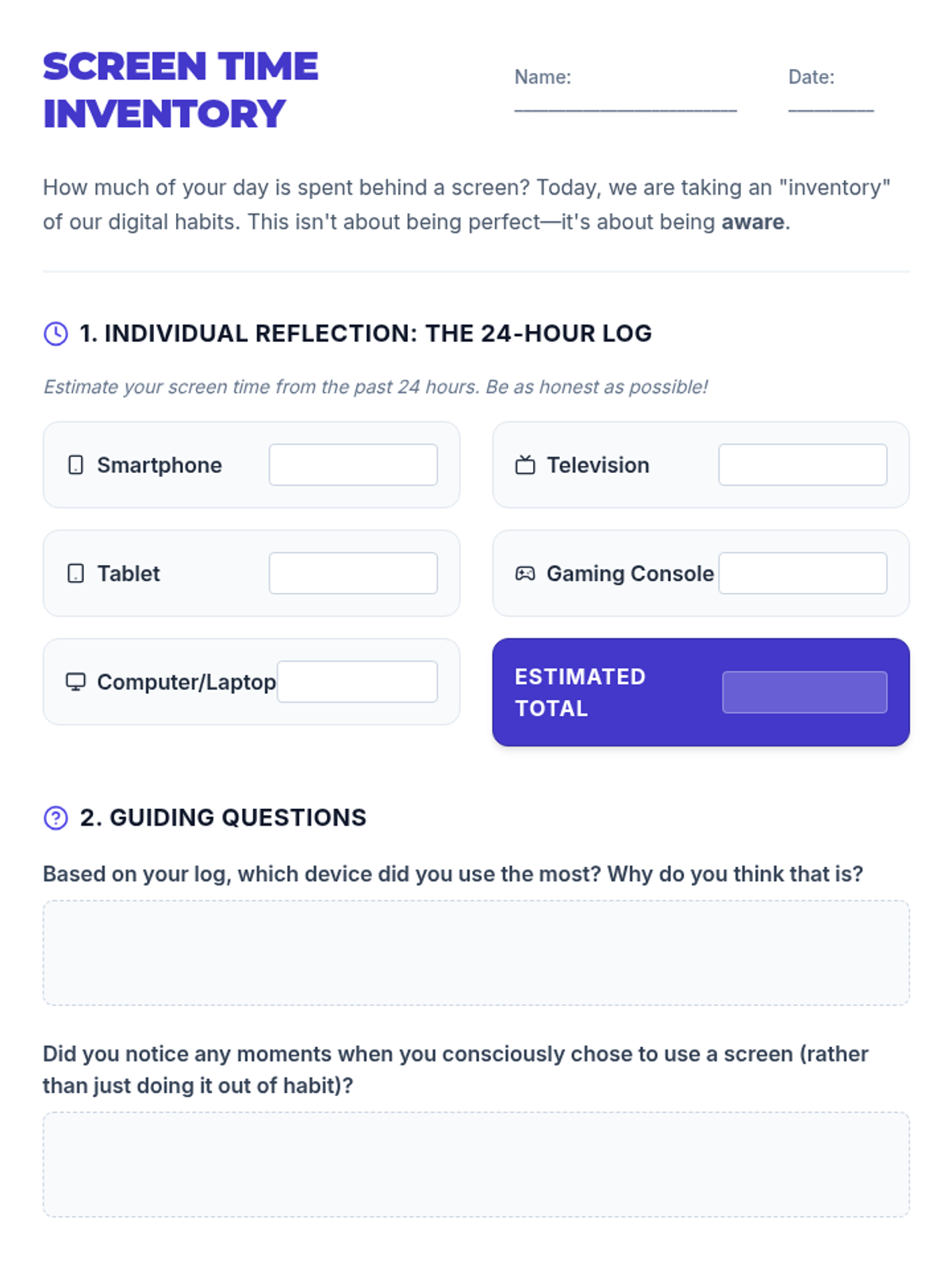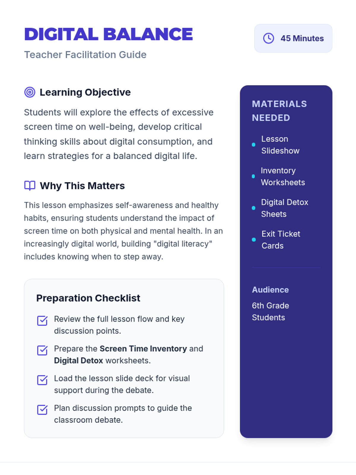 This lesson explores the impact of screen time on students' health and well-being, encouraging them to critically assess their own screen time habits and develop strategies for digital balance.