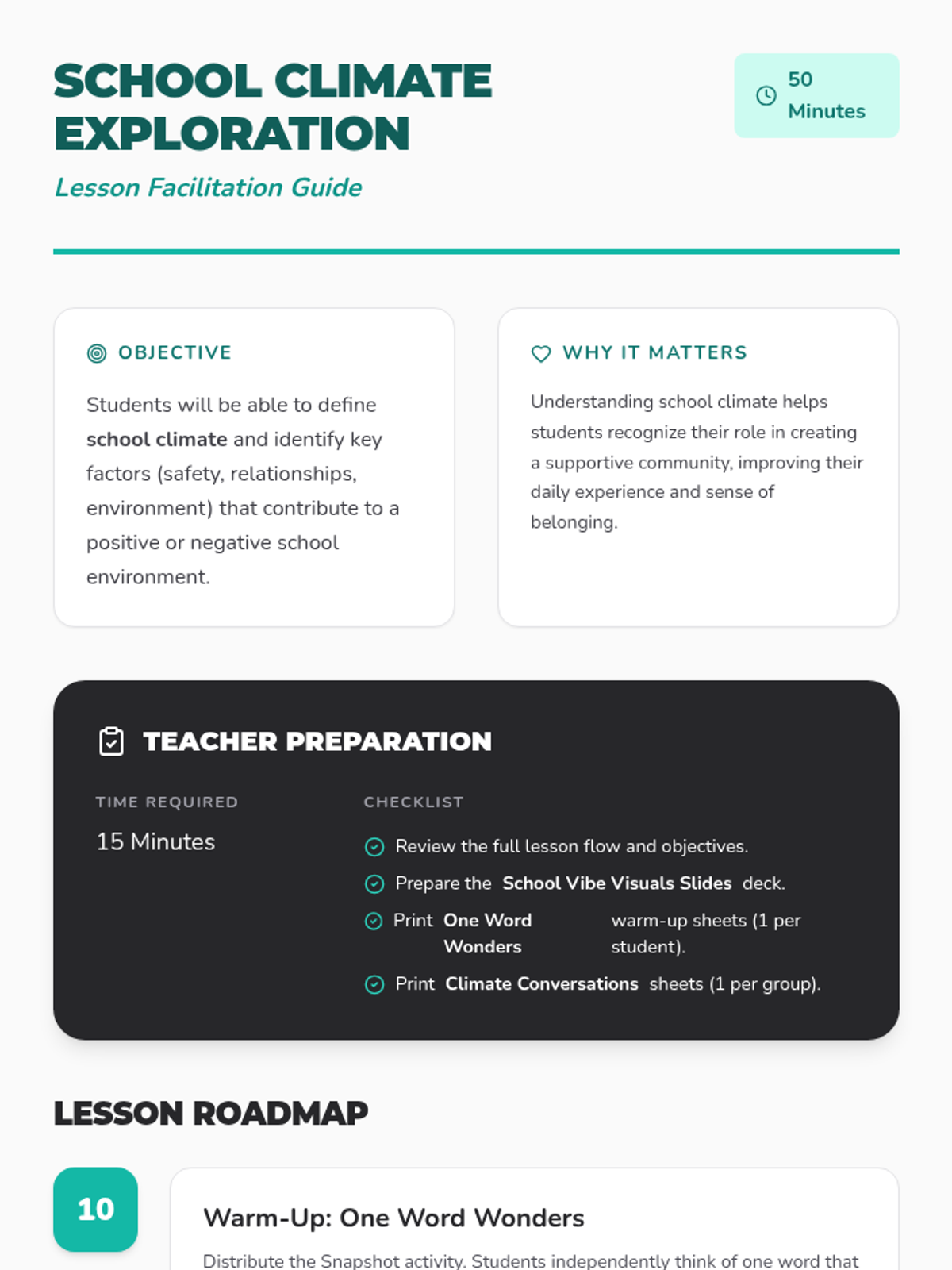This lesson introduces 6th-grade students to the concept of school climate, exploring how safety, relationships, and environment impact their daily well-being and sense of community.