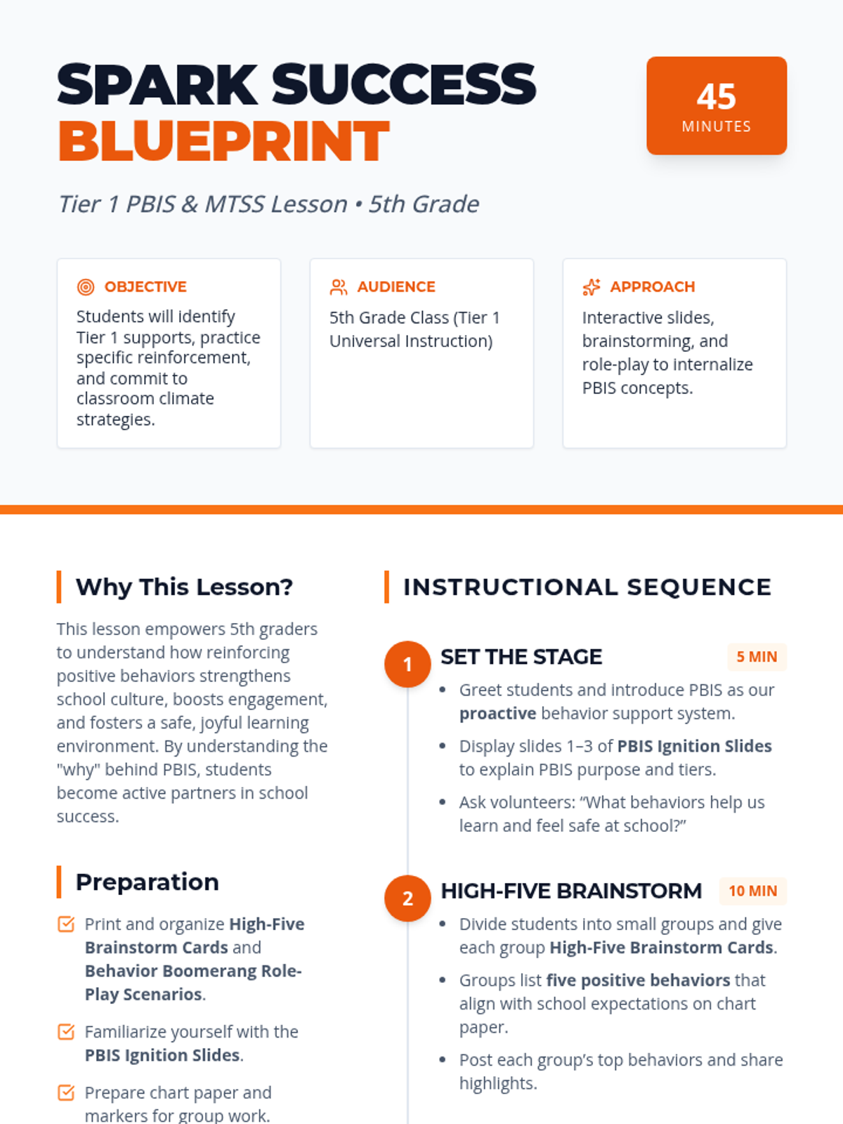 A 45-minute Tier 1 PBIS & MTSS lesson for 5th graders that explores how positive behavior supports ignite school-wide achievement and a thriving classroom climate. Students will learn about the three tiers of PBIS, practice specific reinforcement, and commit to proactive behavior strategies.