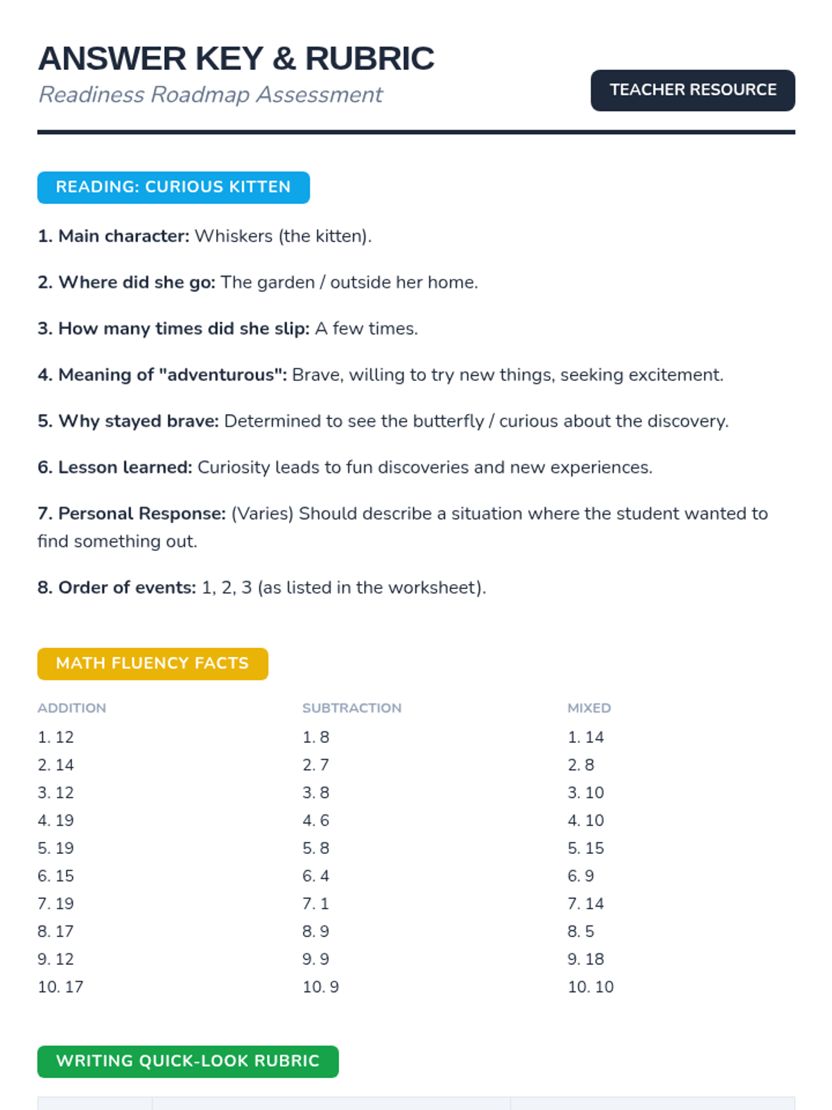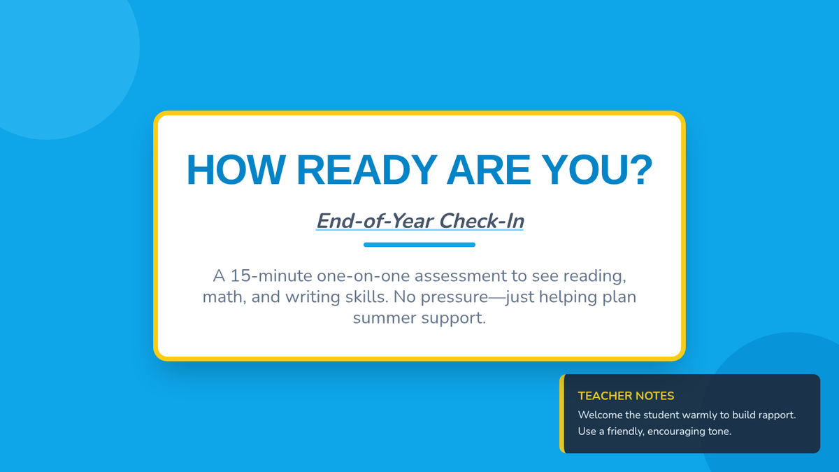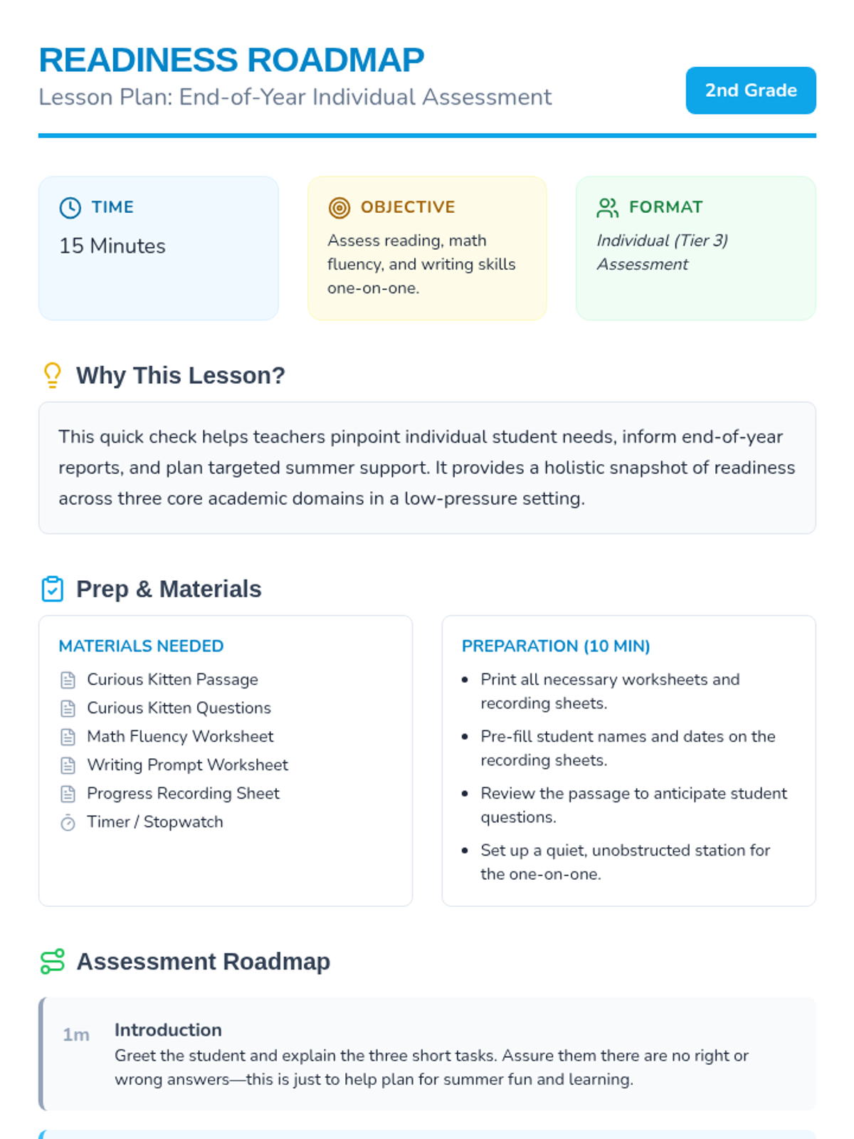 A quick, 15-minute one-on-one end-of-year progress assessment for 2nd graders to evaluate reading, math, and writing readiness for summer.