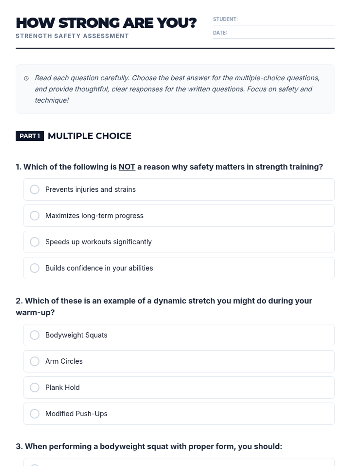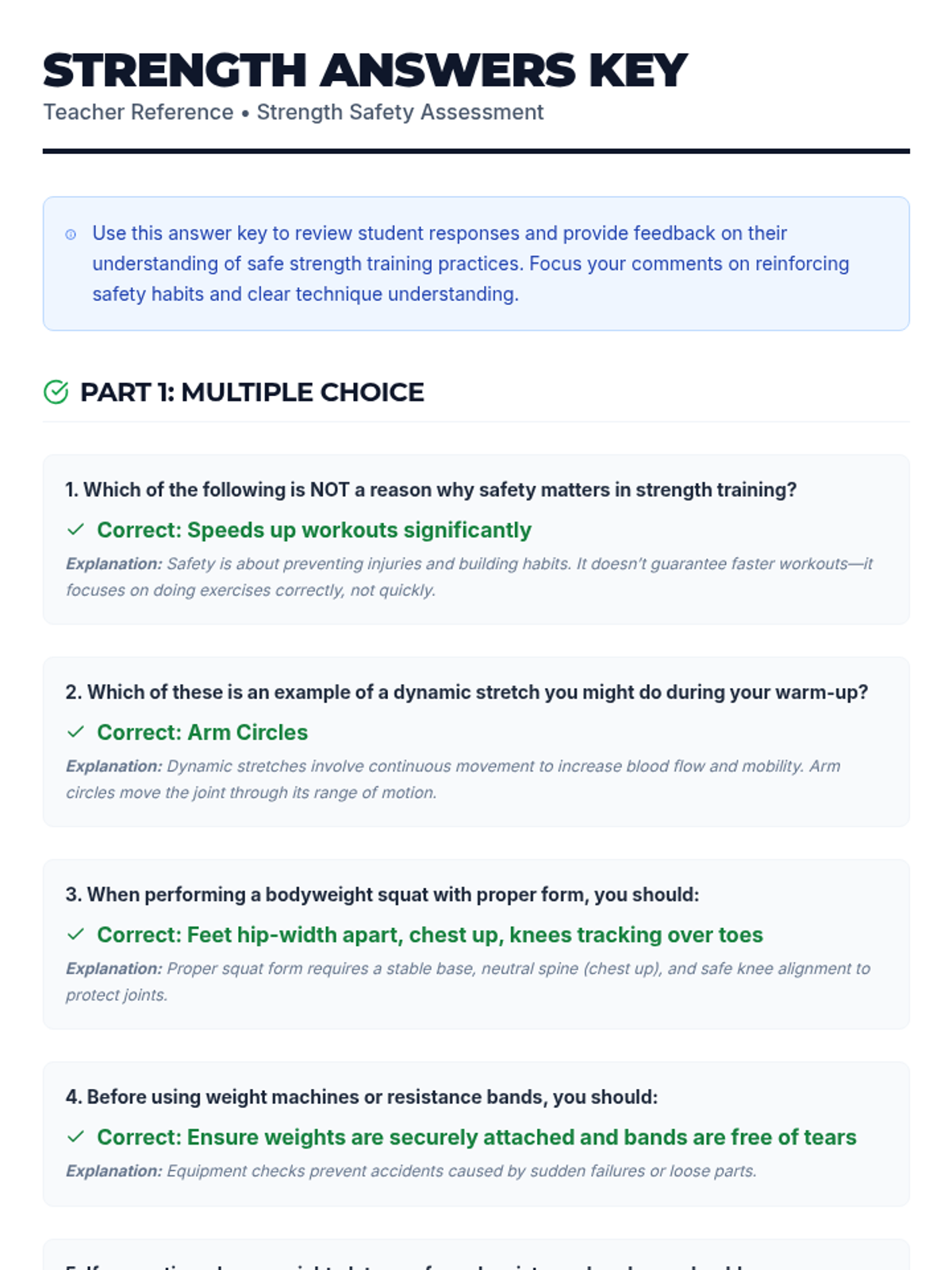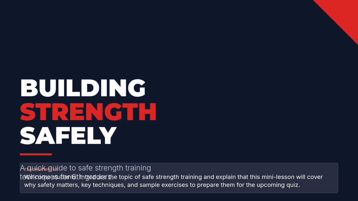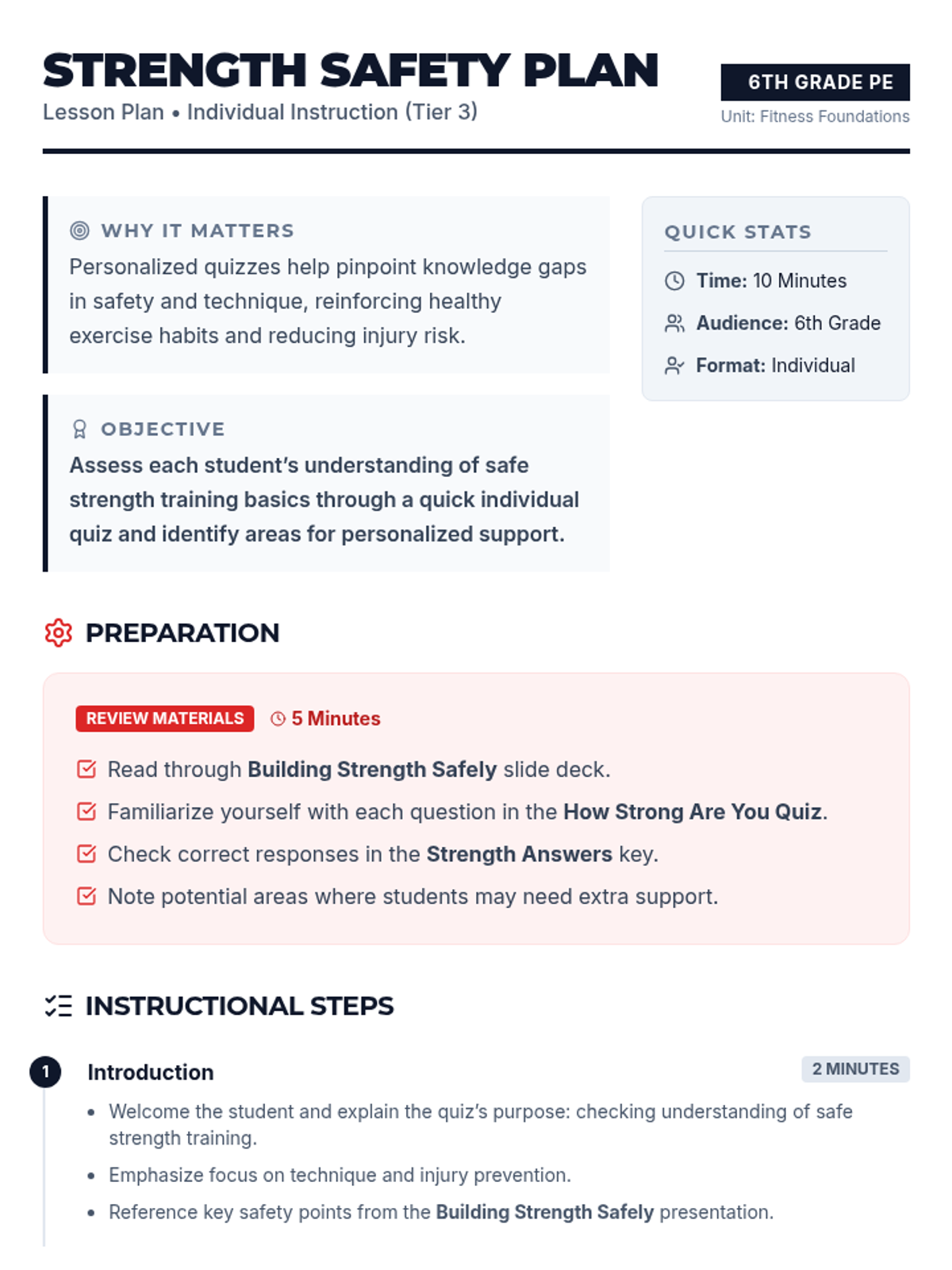 A personalized Tier 3 lesson for 6th graders focusing on strength training basics, safety techniques, and injury prevention through a 10-minute quiz and feedback session.