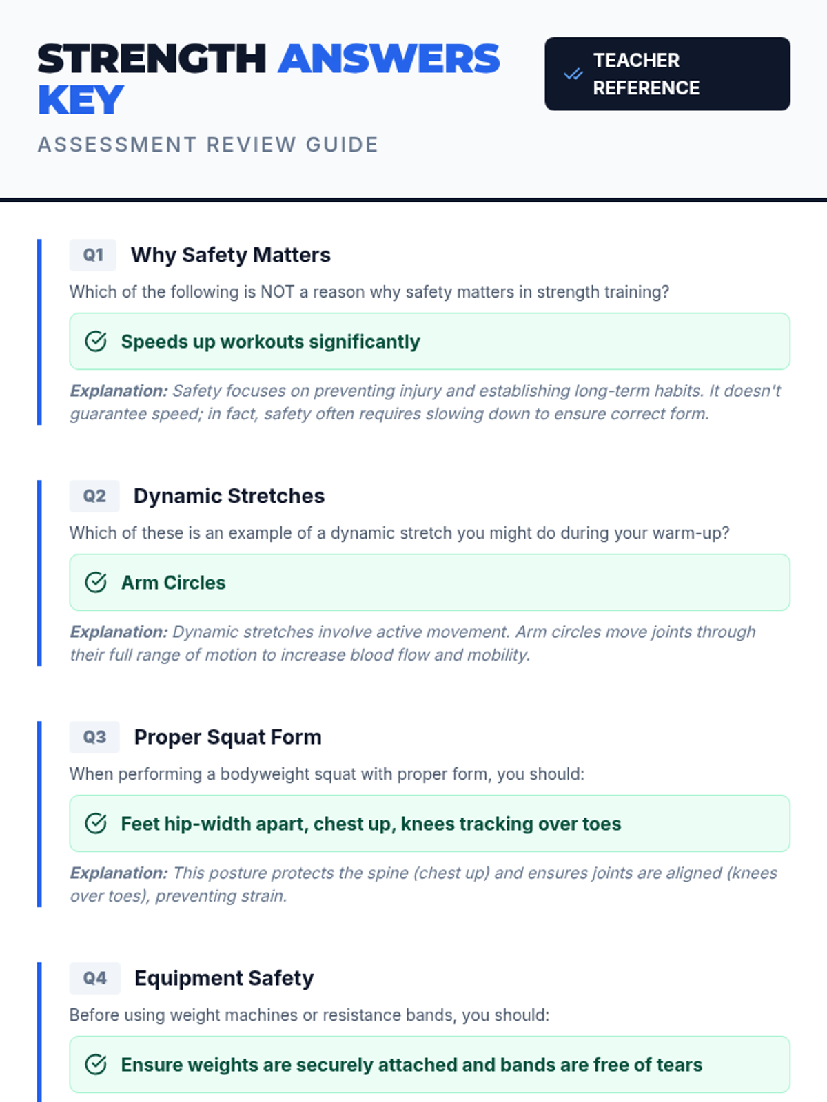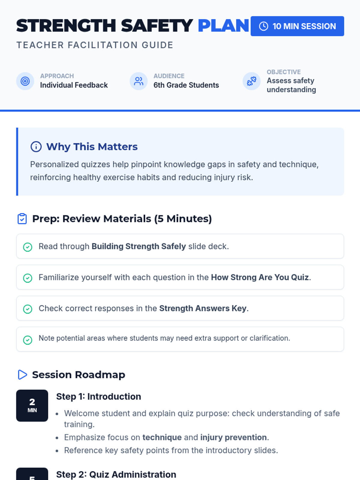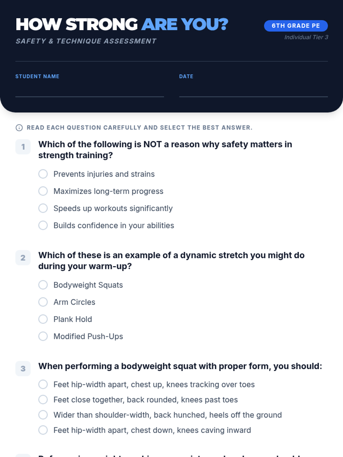 An individual assessment for 6th graders to check their understanding of strength training safety and technique. This lesson uses a quick quiz format to identify personal knowledge gaps and reinforce injury prevention.