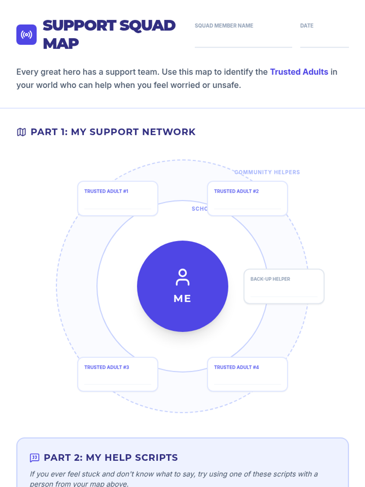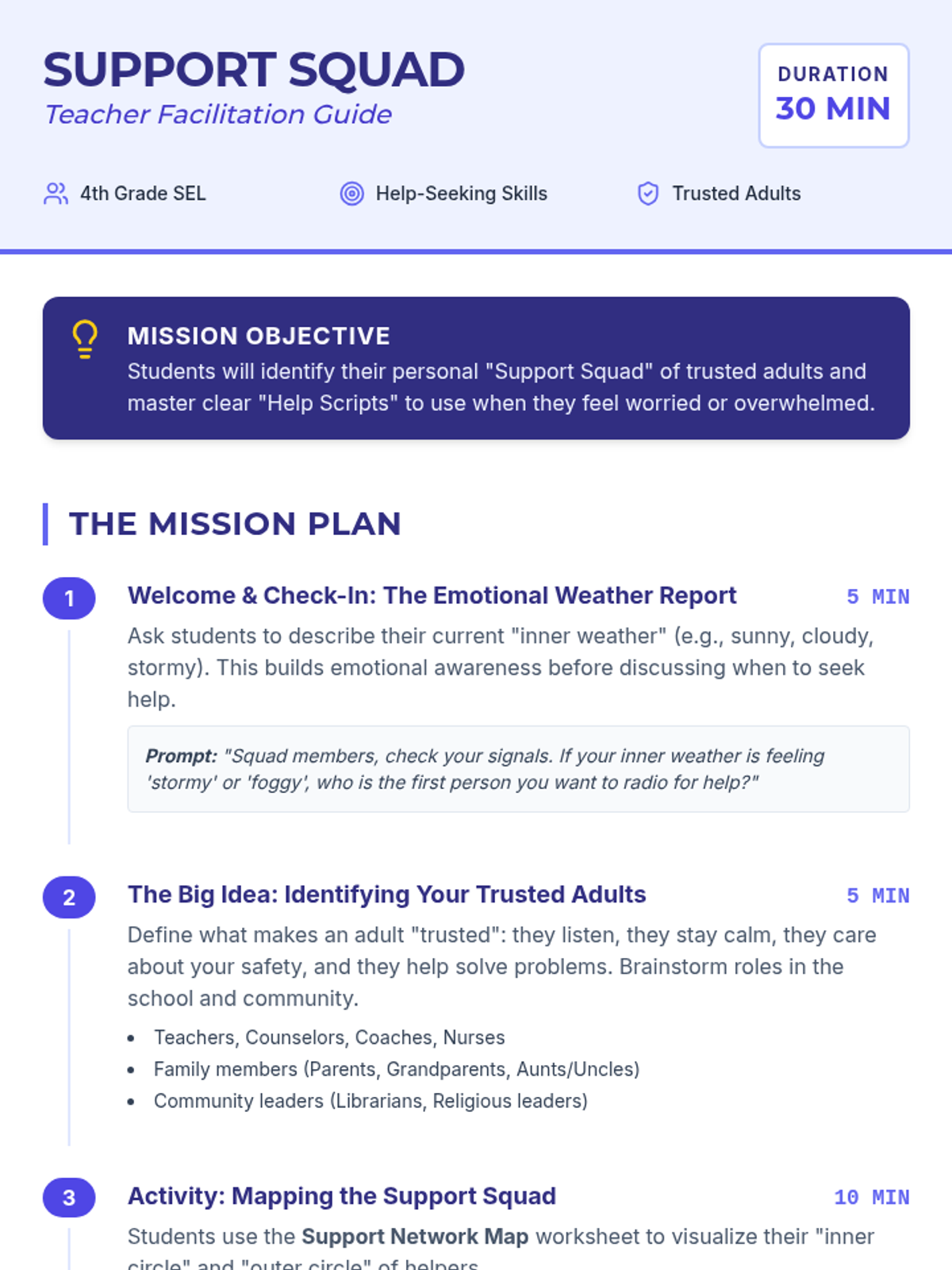 A 30-minute lesson for 4th graders on identifying trusted adults and practicing scripts to ask for help when feeling worried. Students will map their support network and practice advocacy skills.