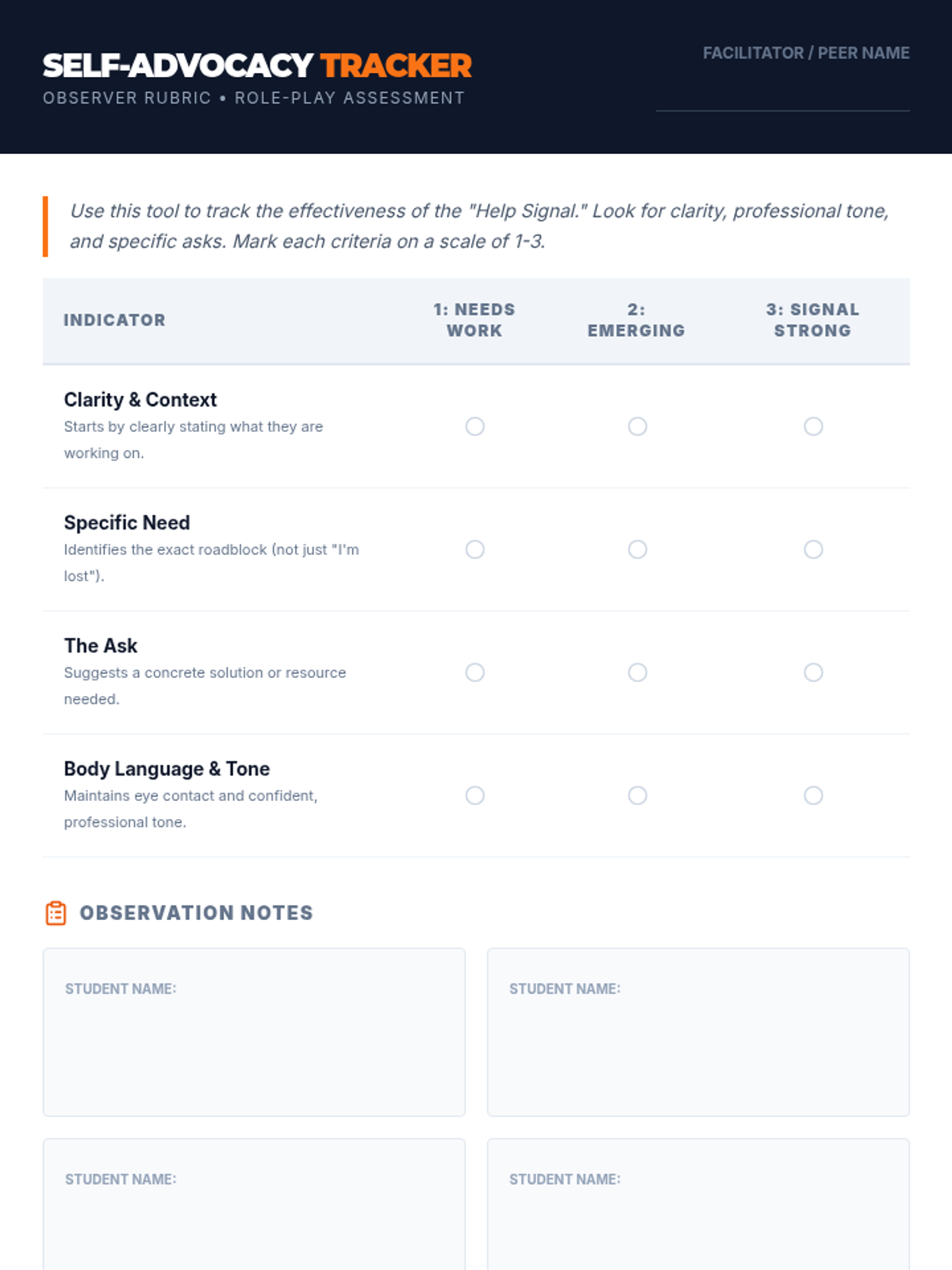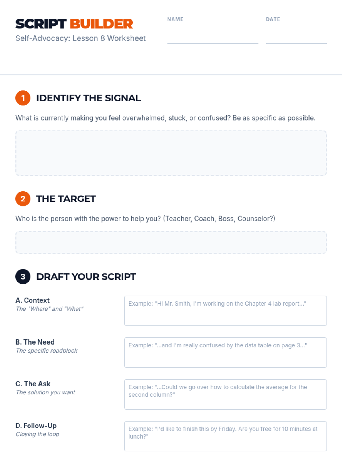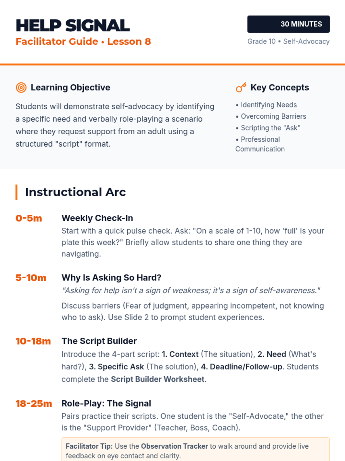 A 30-minute lesson for 10th graders on self-advocacy, focusing on identifying barriers to asking for help and practicing a structured script for requesting support from adults.