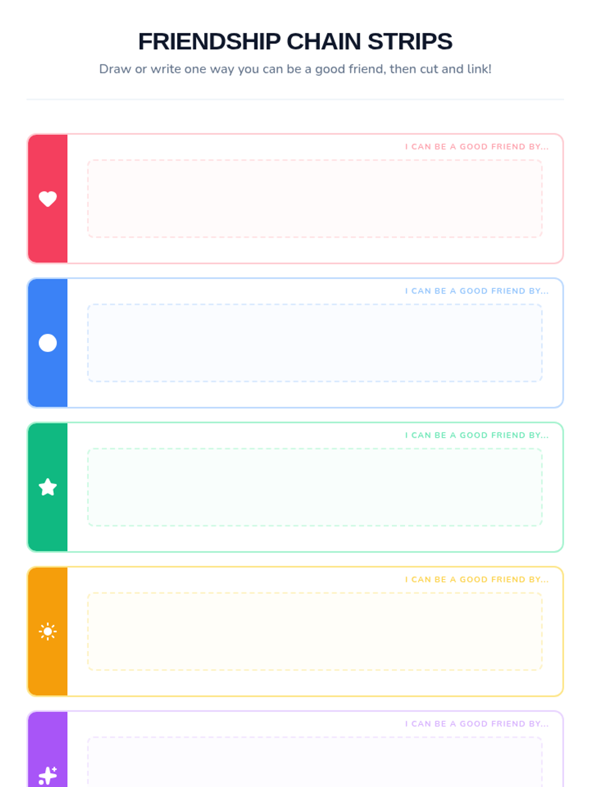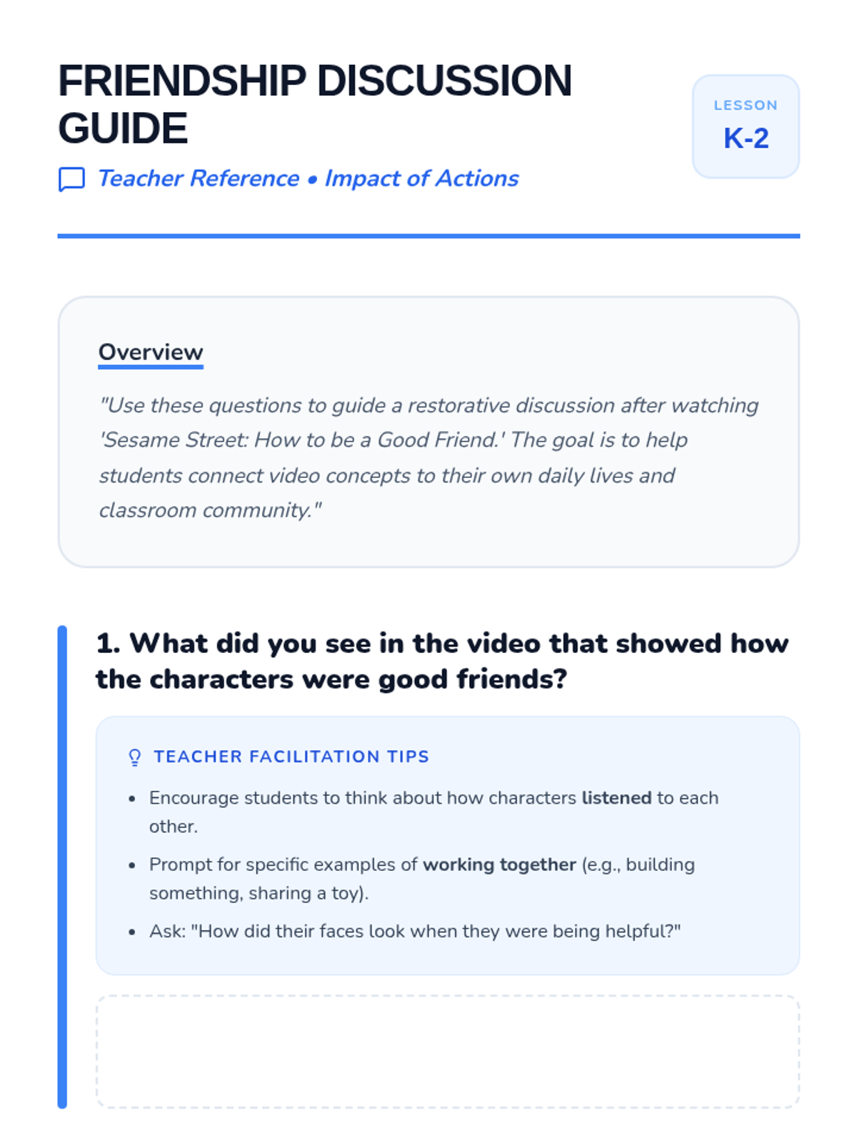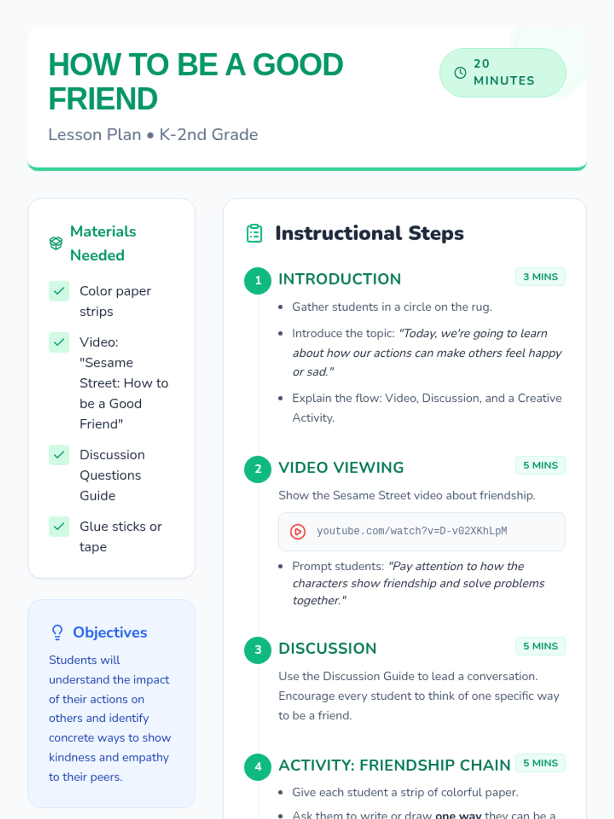 This lesson helps young students understand how their actions can impact others through a video, discussion, and a creative 'Friendship Chain' activity. students will learn the importance of kindness and empathy, fostering a supportive classroom environment.