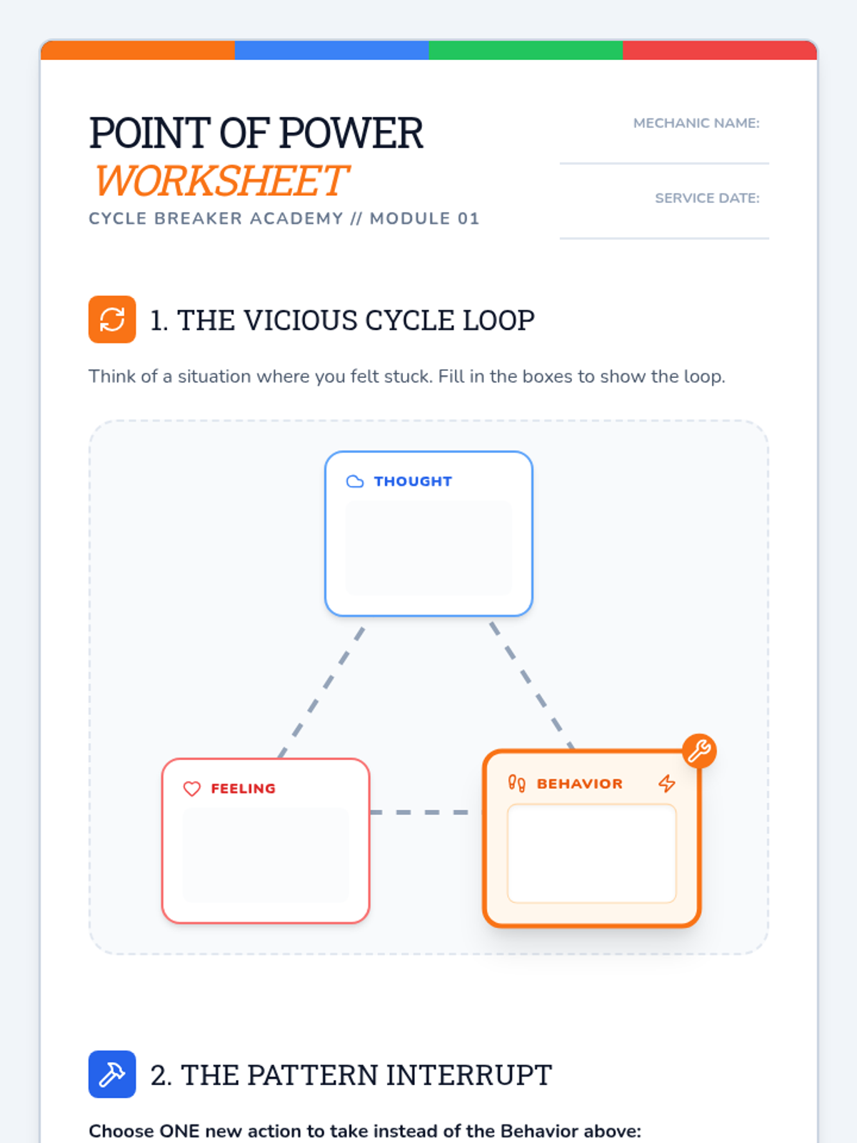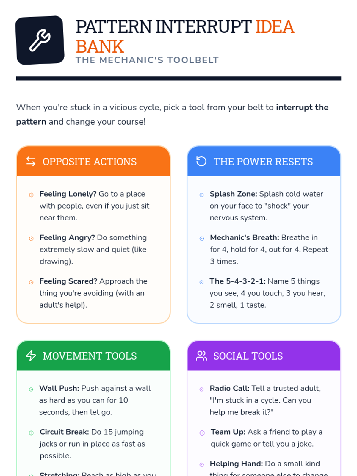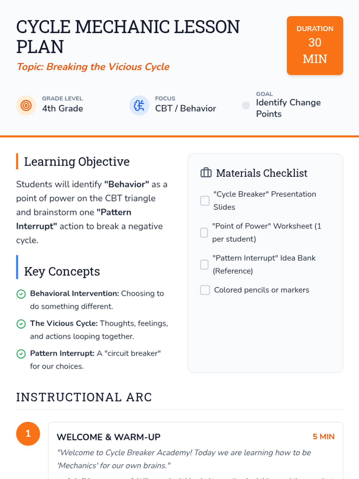 A 30-minute social-emotional learning lesson for 4th graders focusing on the CBT triangle. Students learn to identify behaviors as a 'point of power' where they can interrupt negative cycles through 'Pattern Interrupt' actions.