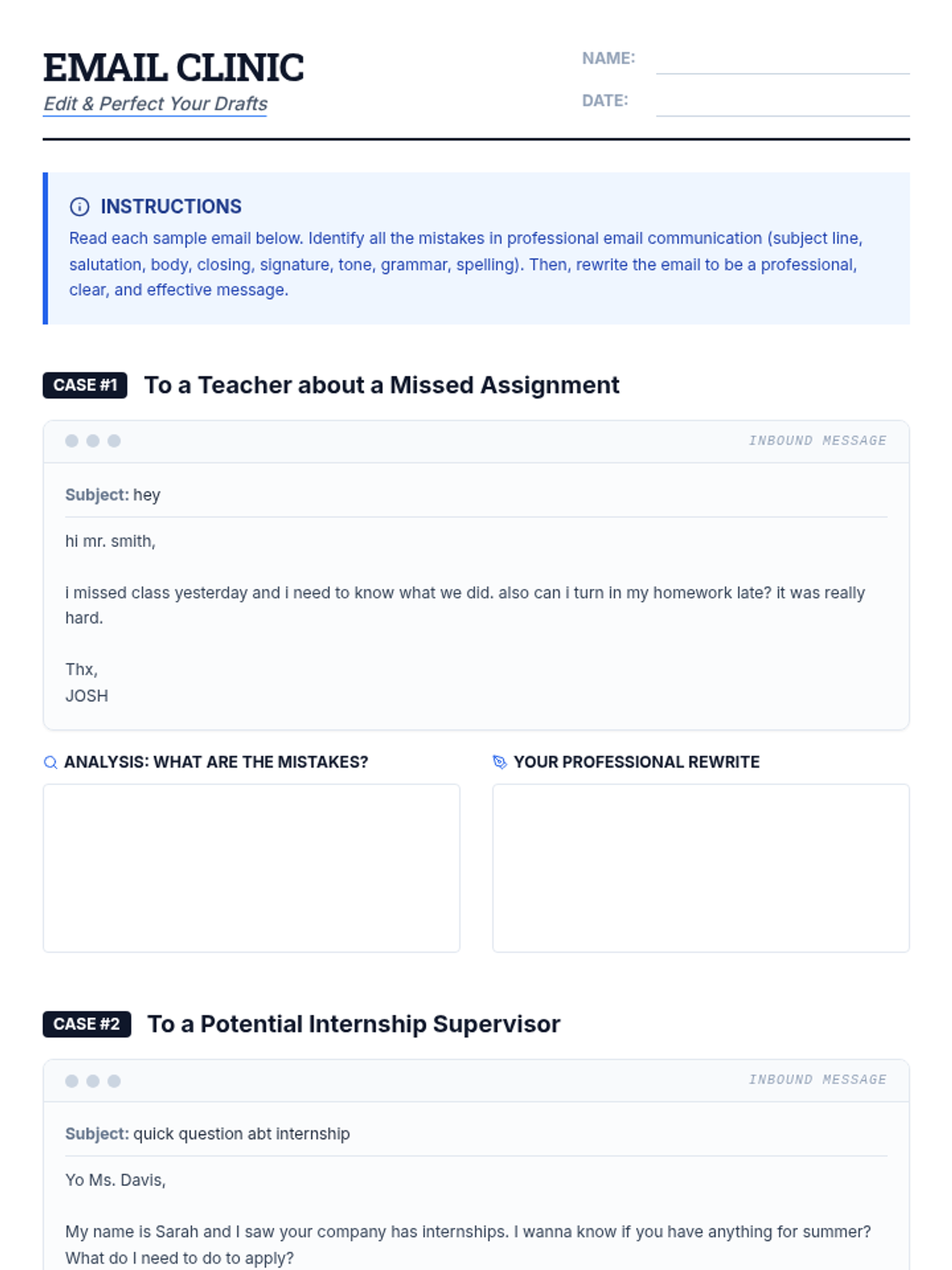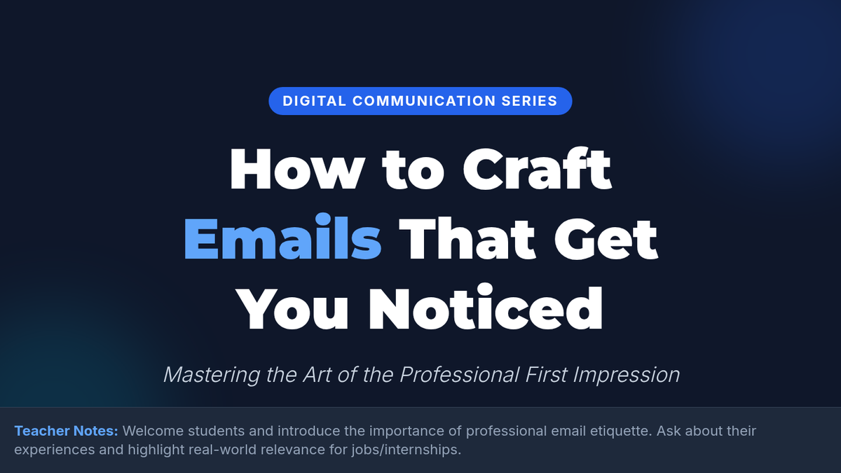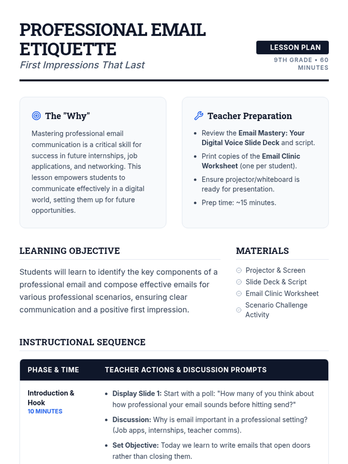 This 60-minute lesson for 9th graders focuses on mastering professional email etiquette. Students learn the essential components of a formal email, analyze common mistakes through an 'Email Clinic,' and practice drafting their own messages for various real-world scenarios.