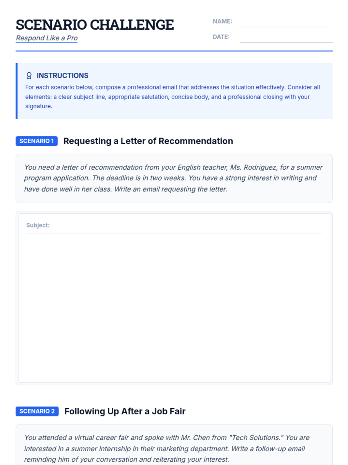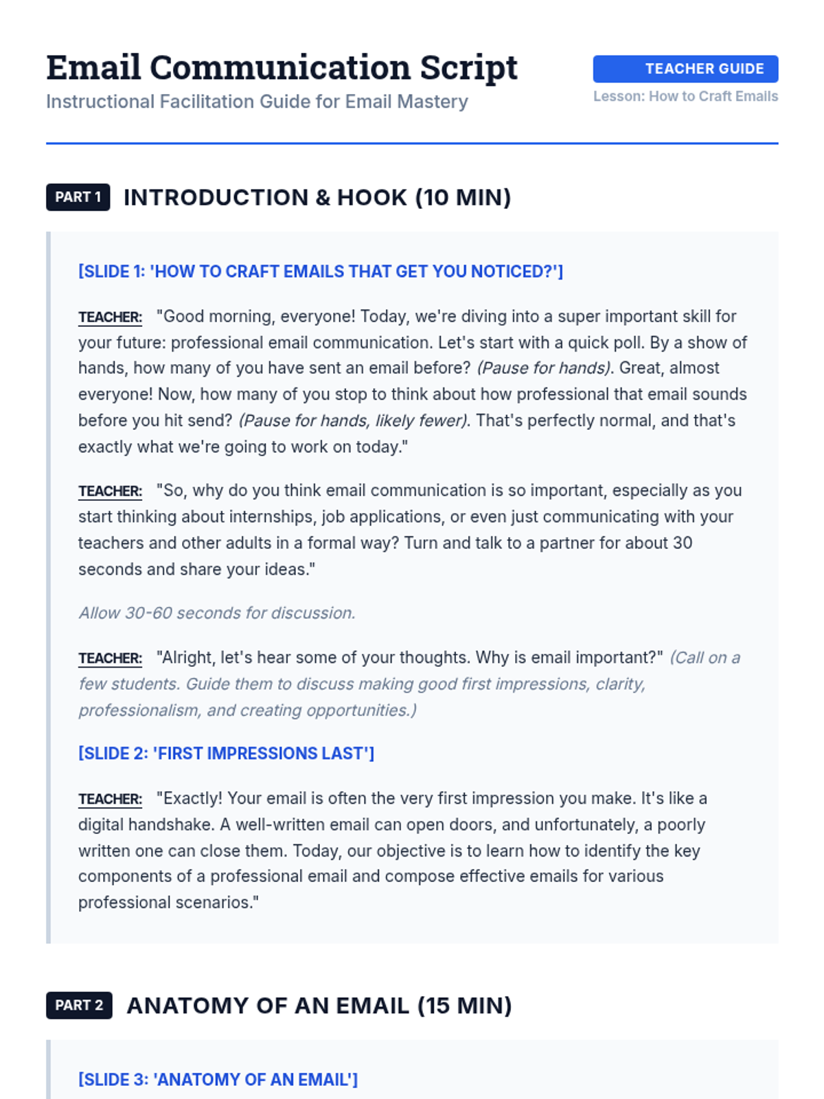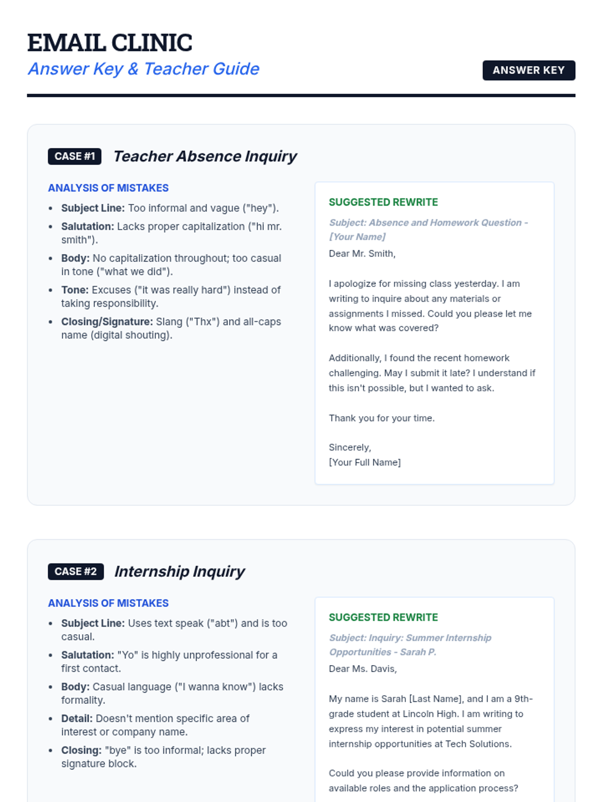 This 60-minute lesson for 9th graders focuses on mastering professional email etiquette. Students learn the essential components of a formal email, analyze common mistakes through an 'Email Clinic,' and practice drafting their own messages for various real-world scenarios.