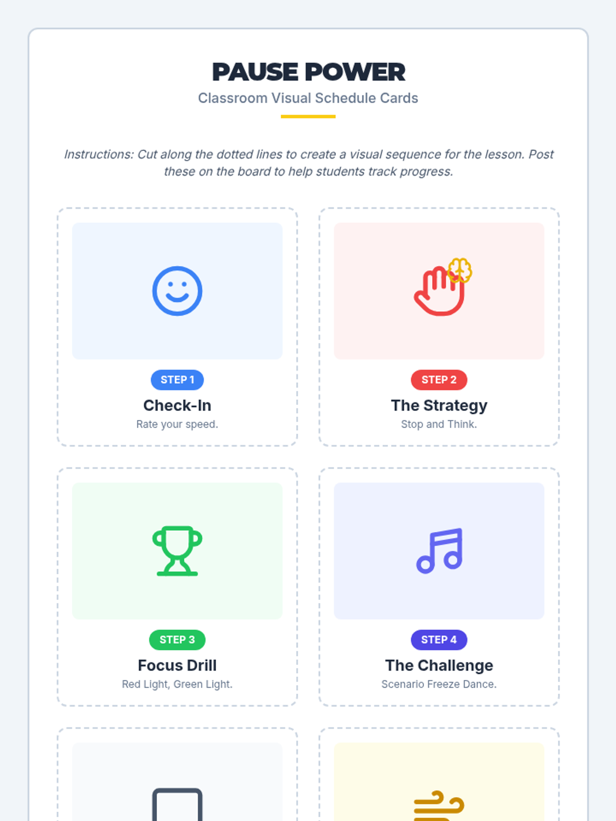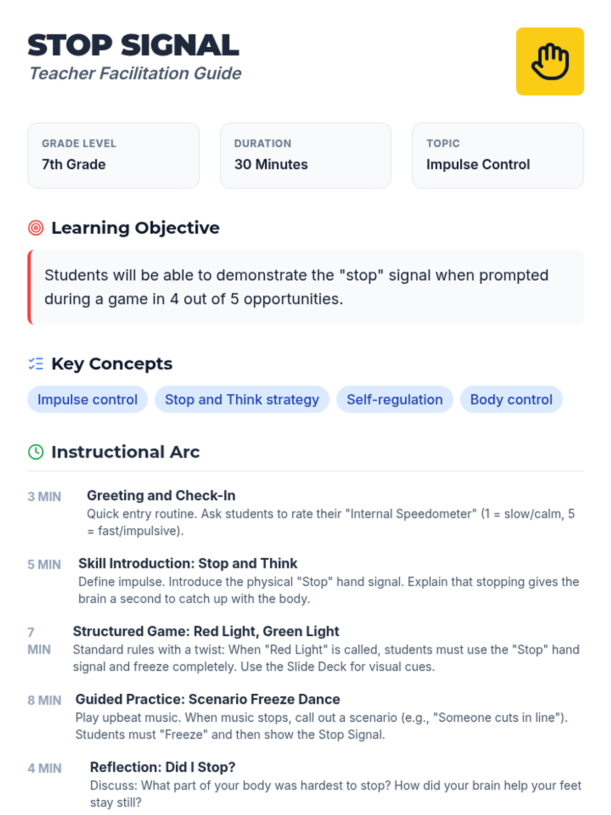 A 30-minute social-emotional learning lesson for 7th graders focused on impulse control using the 'Stop and Think' strategy through structured physical games.