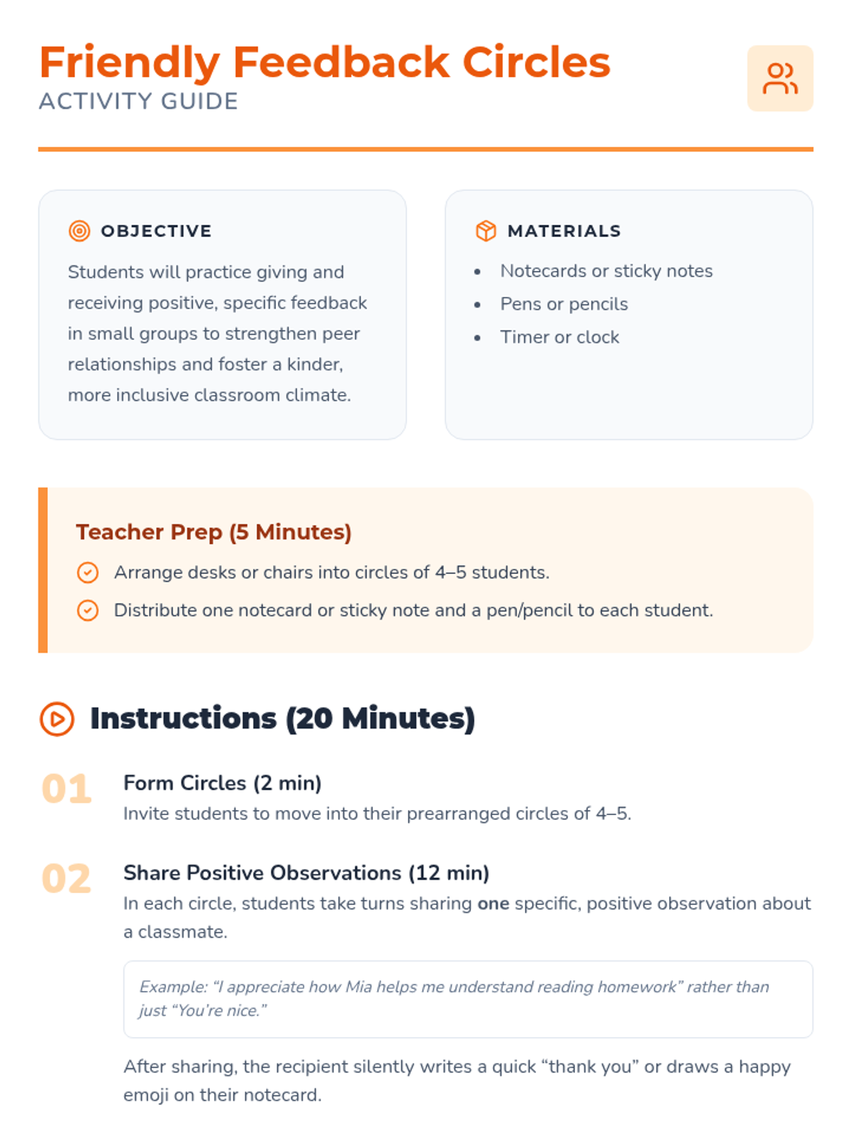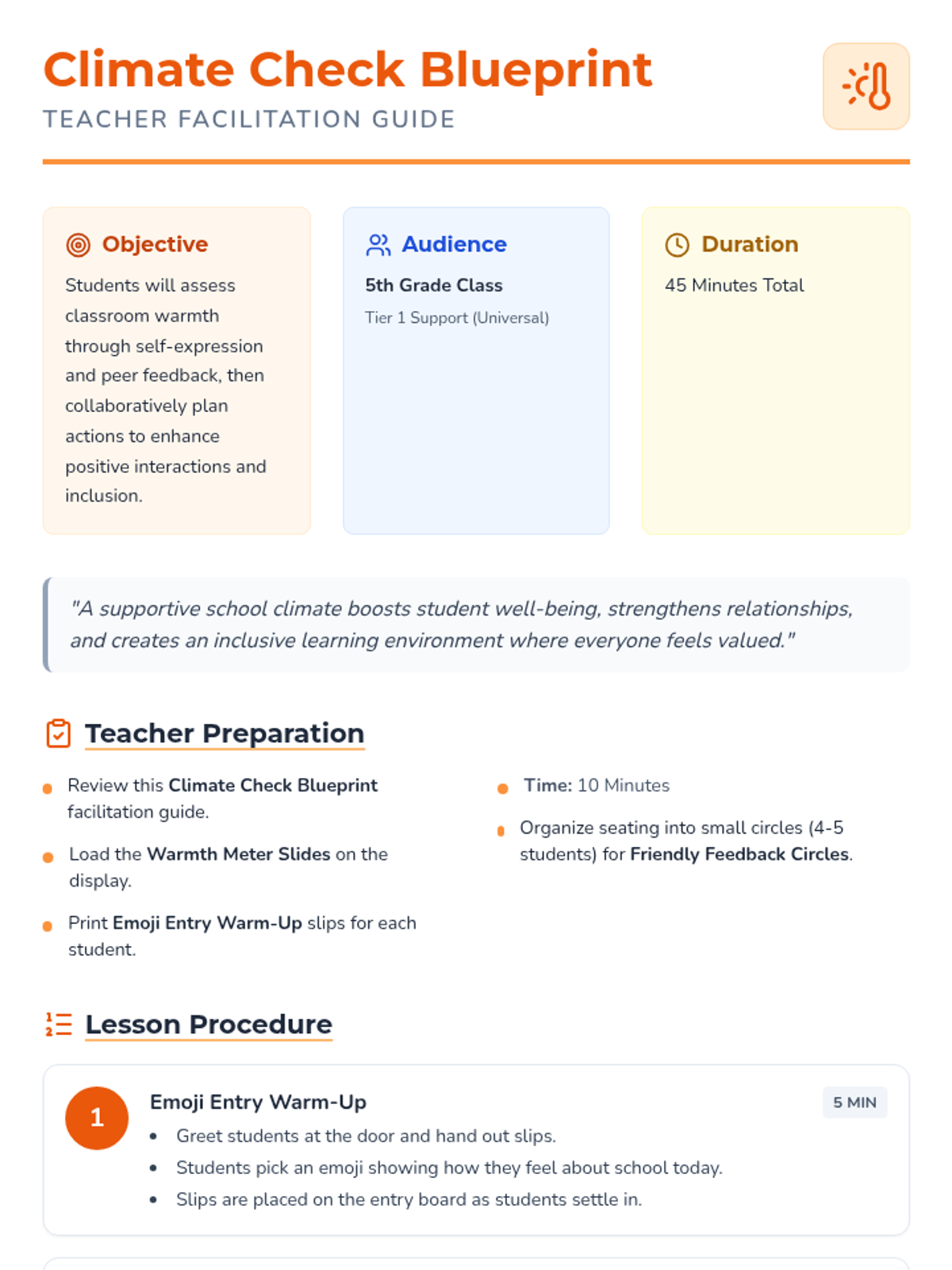 A 45-minute Tier 1 SEL lesson for 5th graders to assess and improve classroom climate through self-reflection, anonymous rating, and peer feedback circles.