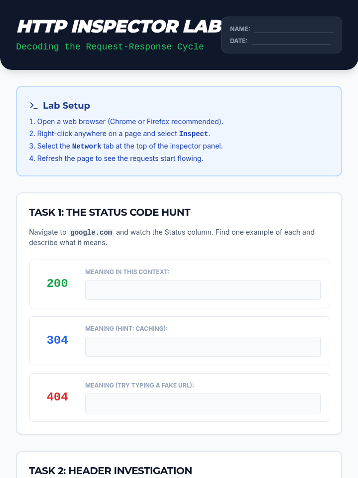 Students use browser developer tools to inspect HTTP headers. They learn the structure of GET and POST requests and decipher common status codes like 200, 404, and 500.