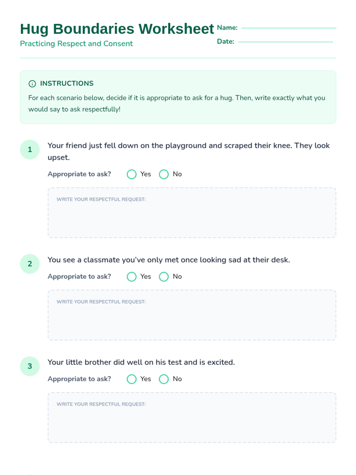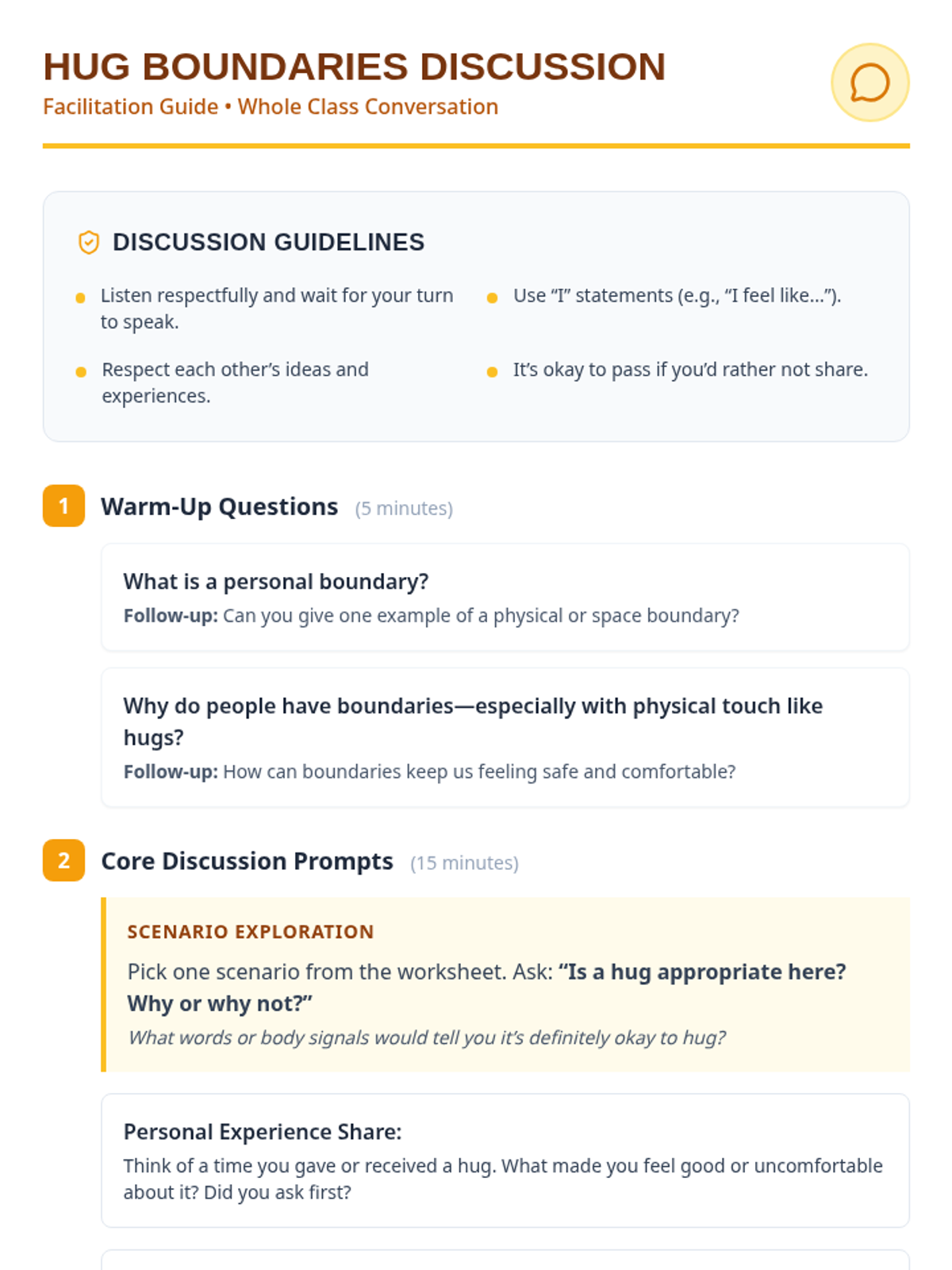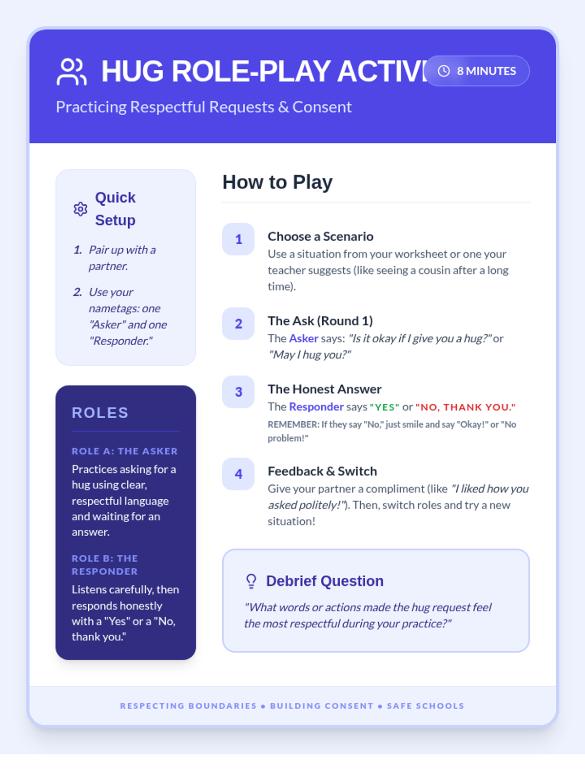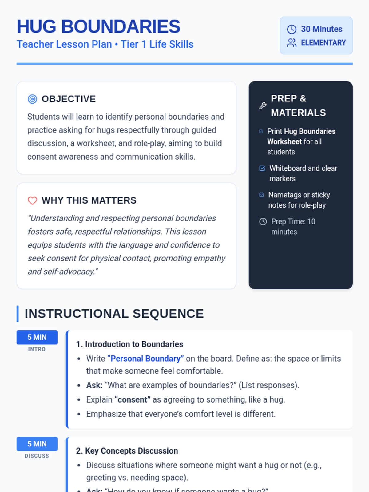 A 30-minute life skills lesson for elementary students focused on understanding personal boundaries, seeking consent for hugs, and practicing respectful communication.