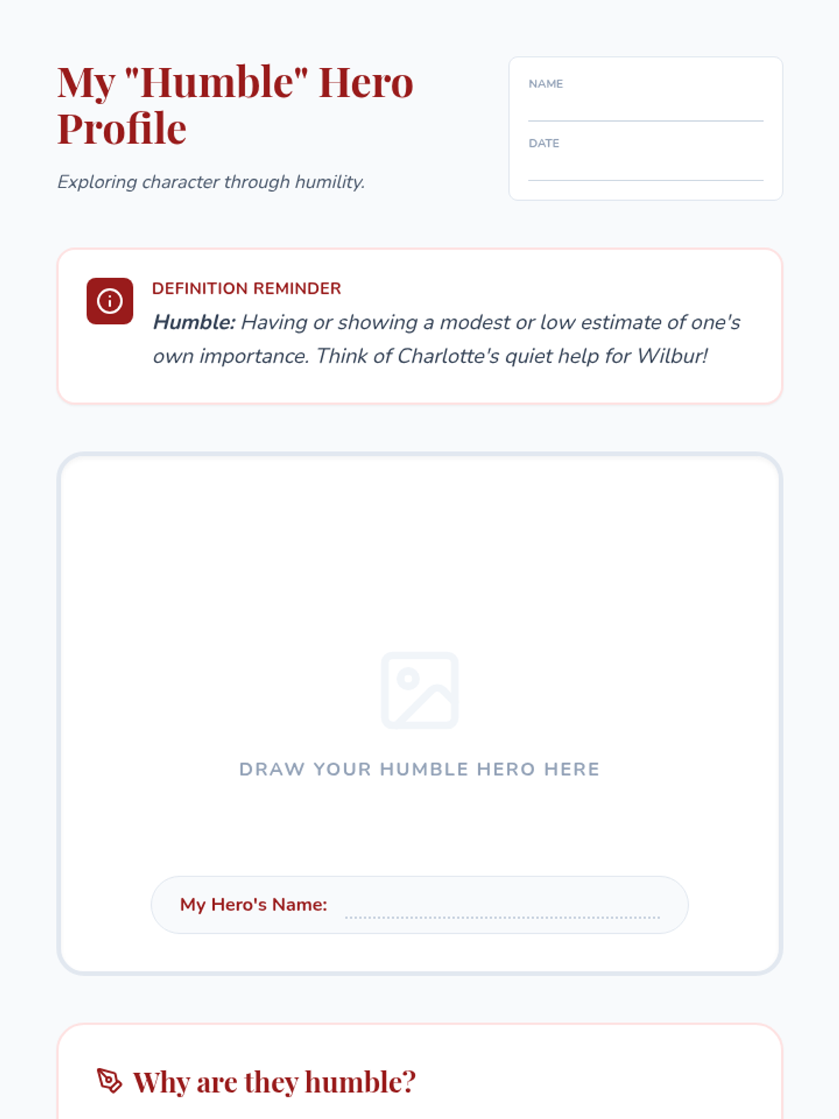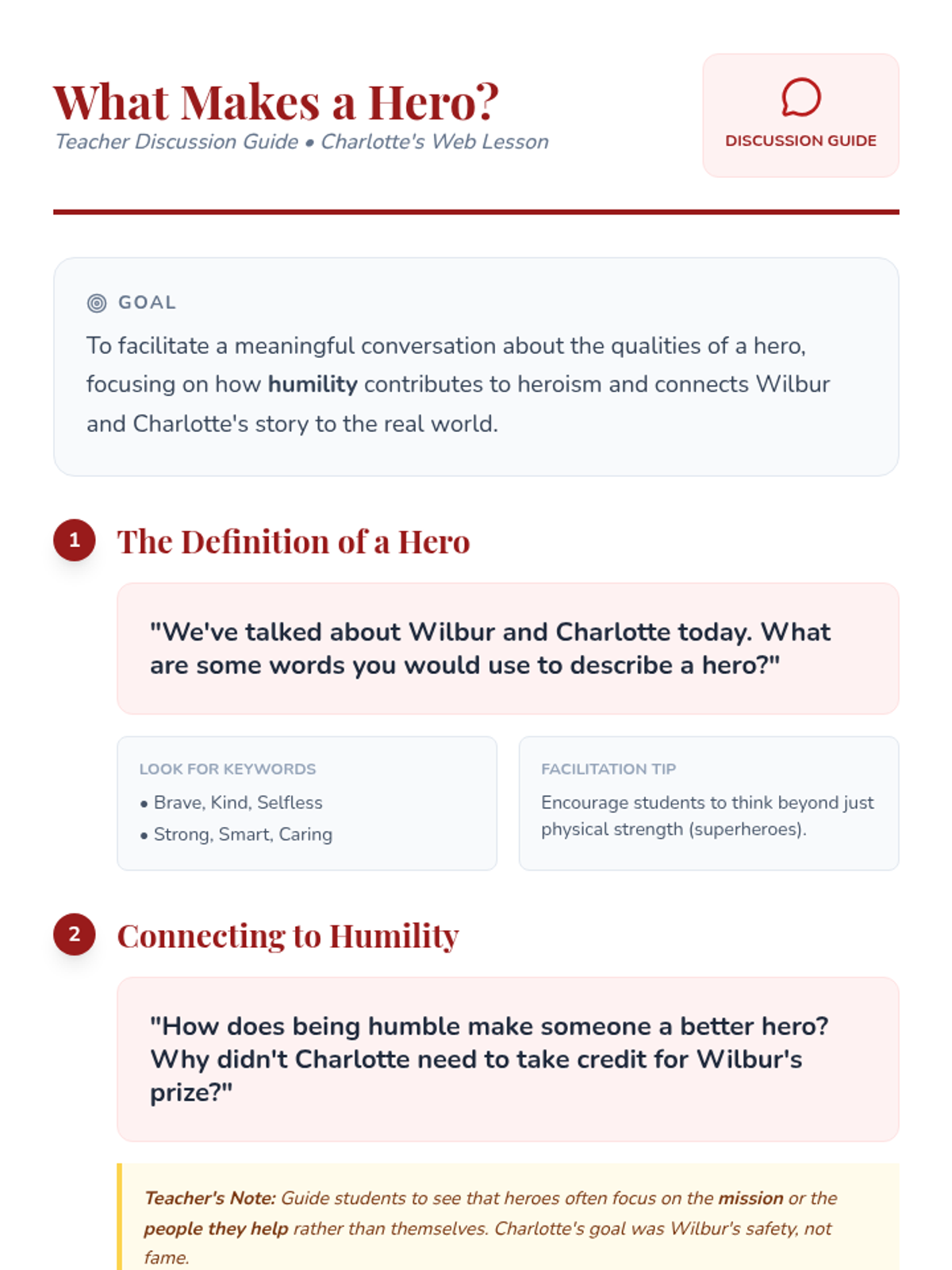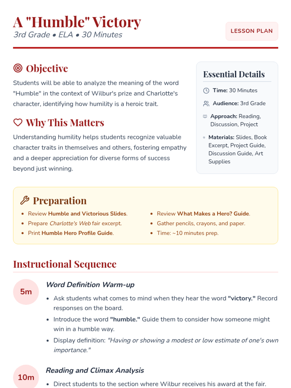 This 3rd-grade lesson explores the theme of humility through the climax of Charlotte's Web, helping students connect Wilbur's 'humble' victory and Charlotte's selfless actions to their own ideas of heroism.