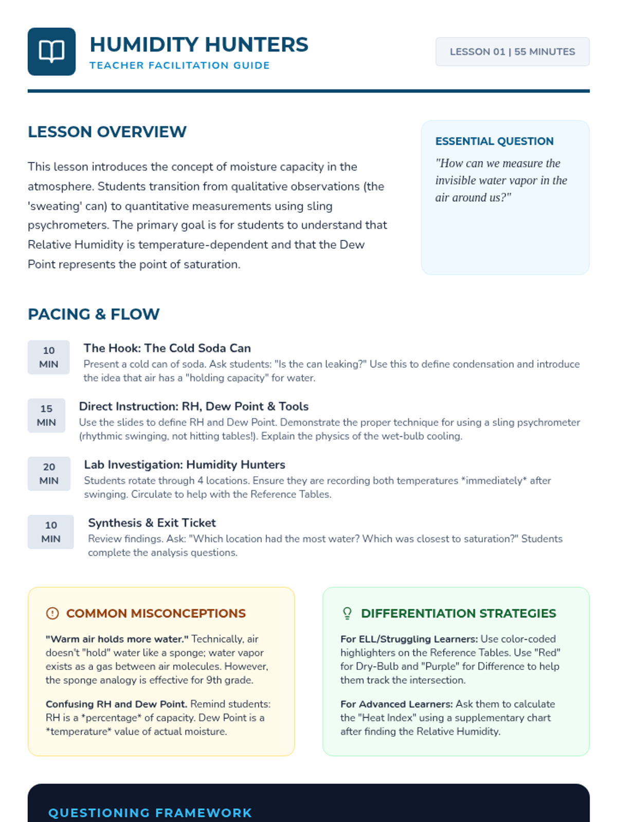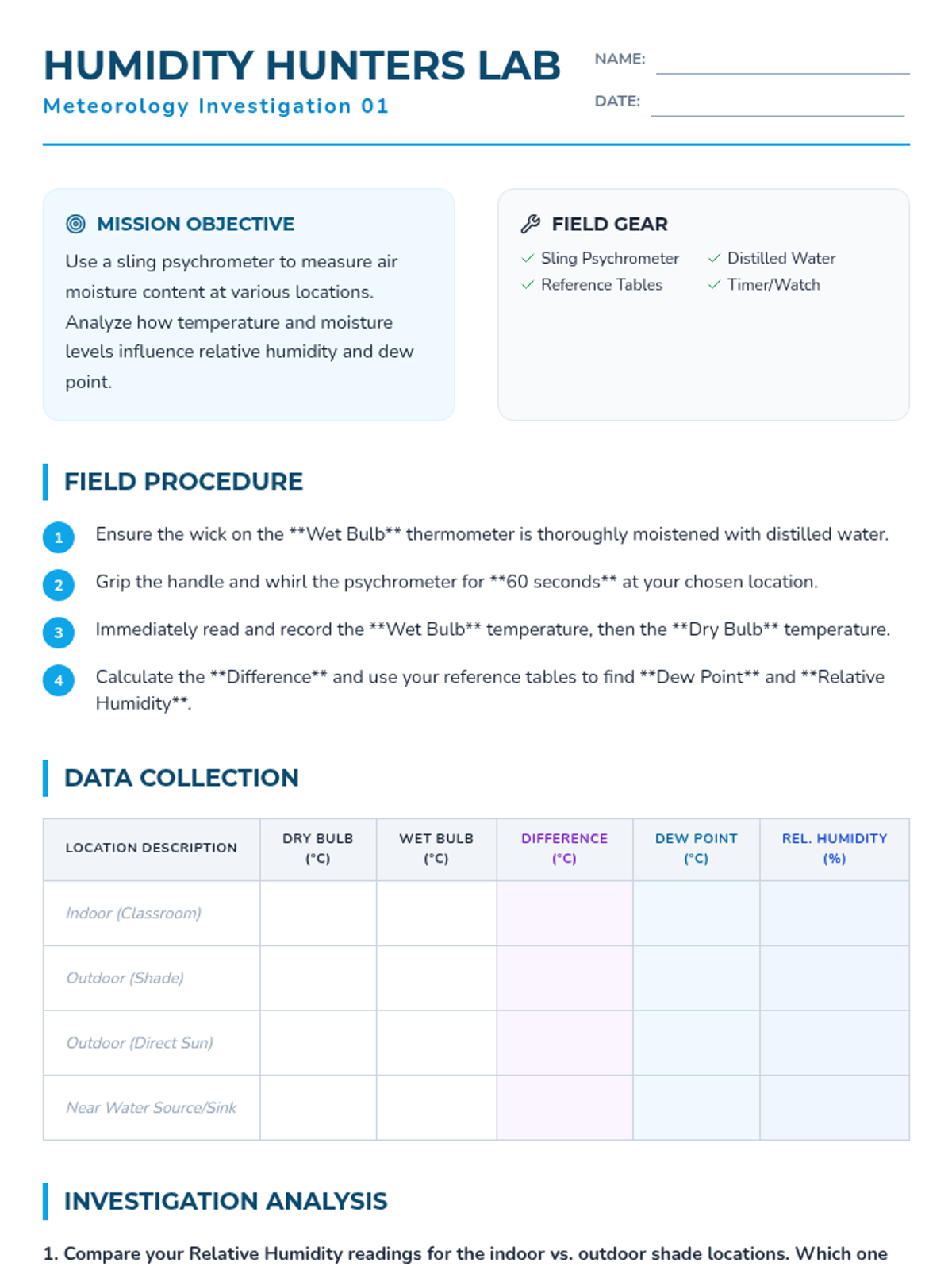 Students measure humidity and dew point using sling psychrometers and reference tables, exploring the relationship between air temperature and its capacity to hold water vapor.
