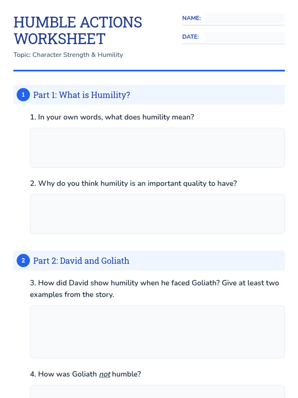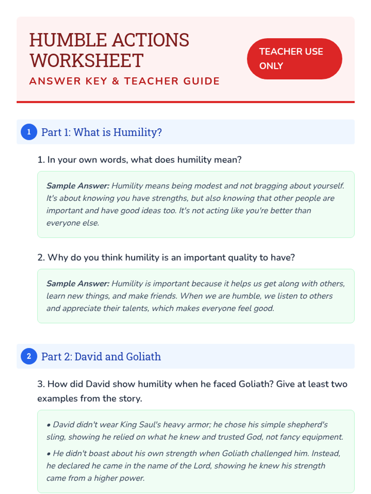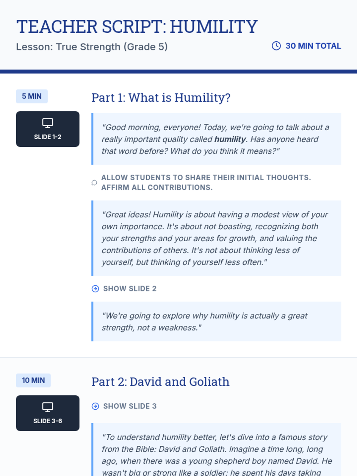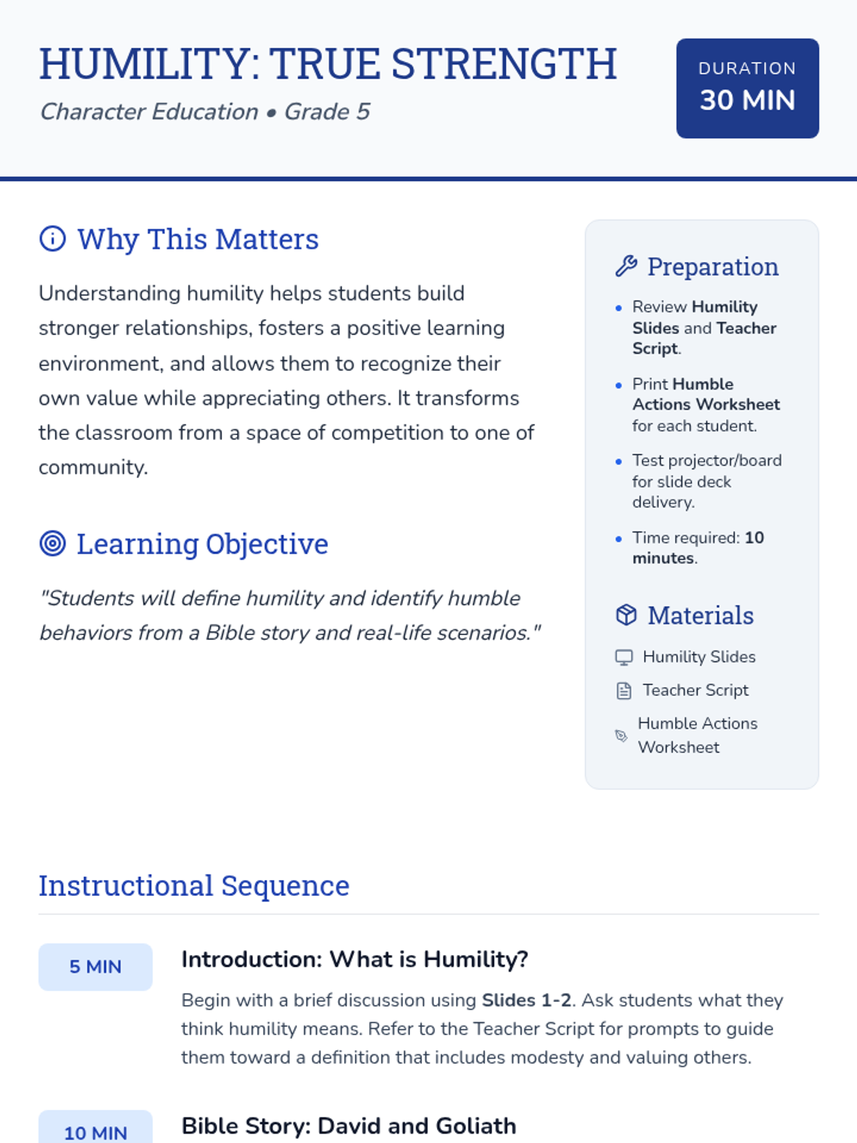 This single-session lesson introduces 5th-grade students to humility through the story of David and Goliath, teaching them that true strength involves valuing others and recognizing one's own growth areas.