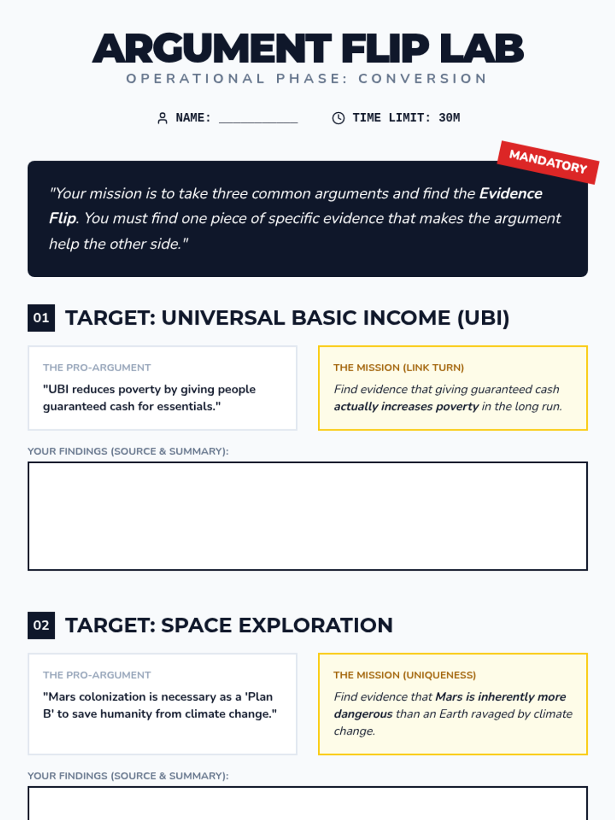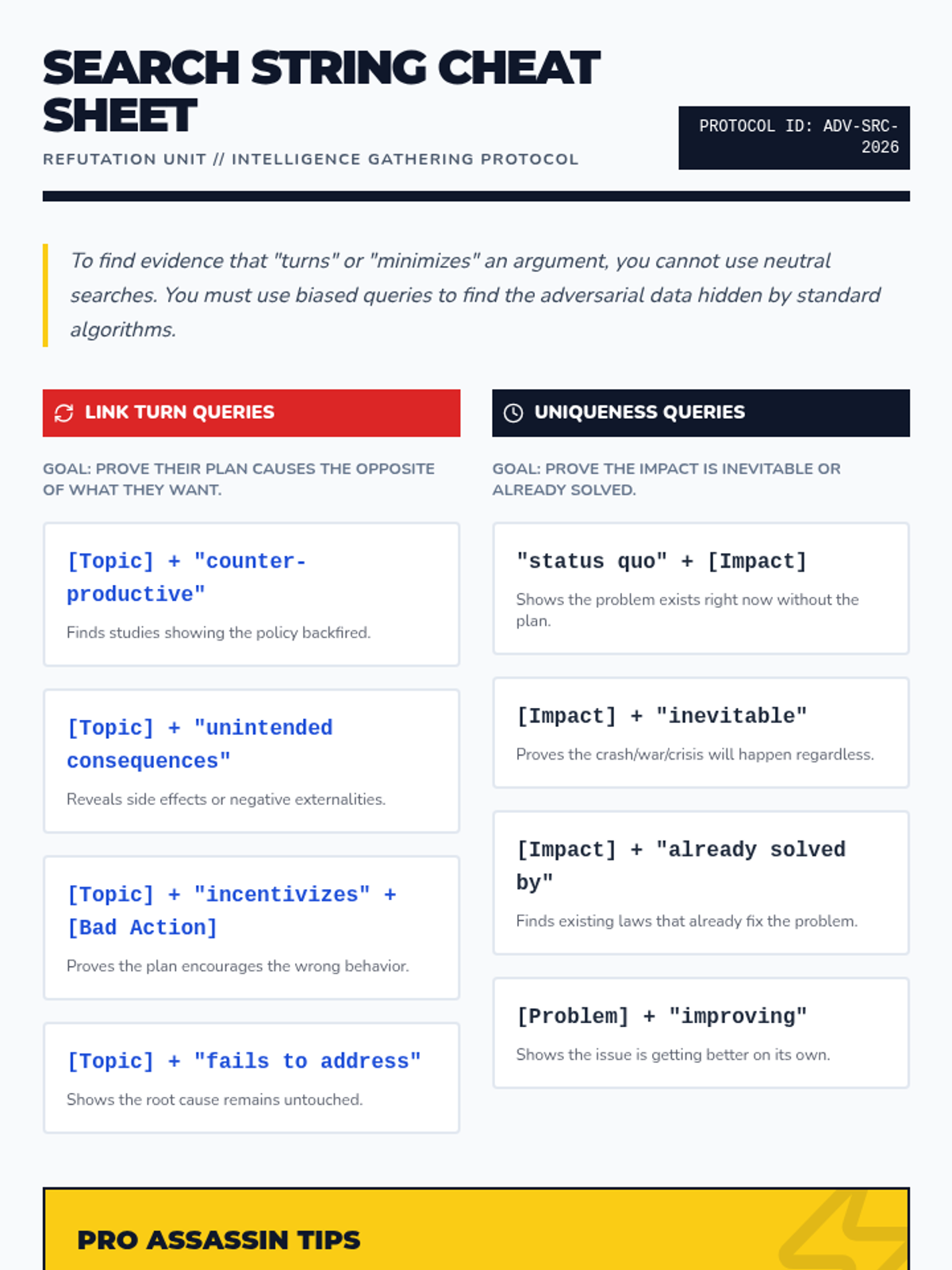 Students learn the concept of 'turns' (making the opponent's argument help your side) and 'uniqueness attacks' (proving the problem is already solved or inevitable). They practice specific search queries designed to flip an argument.