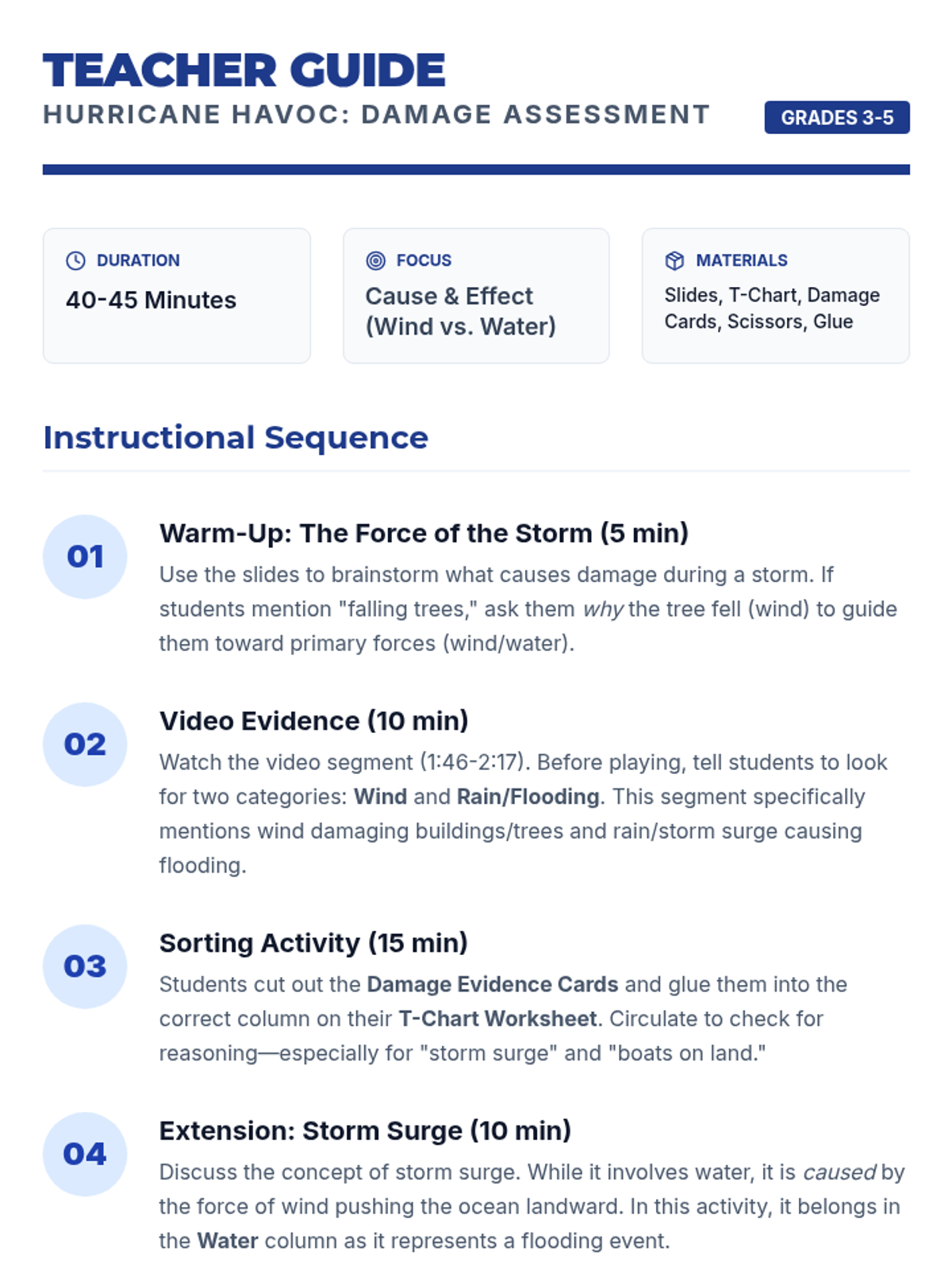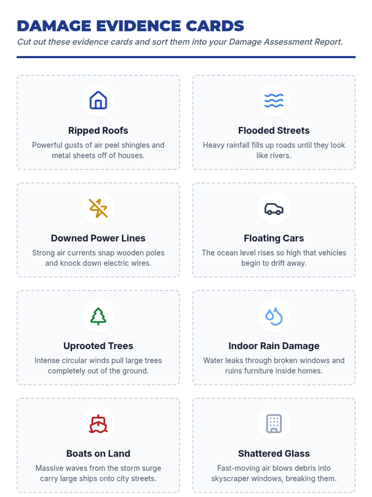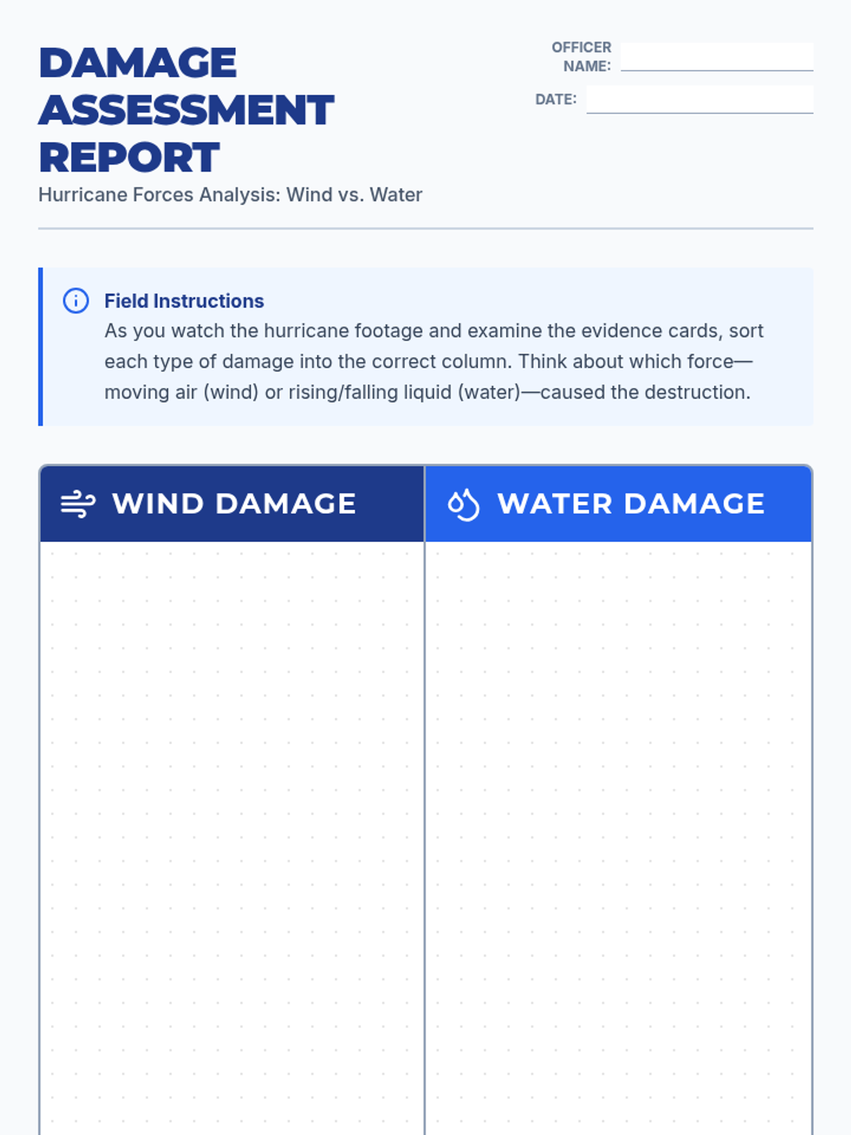 Students will distinguish between wind and water damage caused by hurricanes using video evidence and a hands-on sorting activity. They will explore how different forces within a storm impact buildings, nature, and infrastructure.