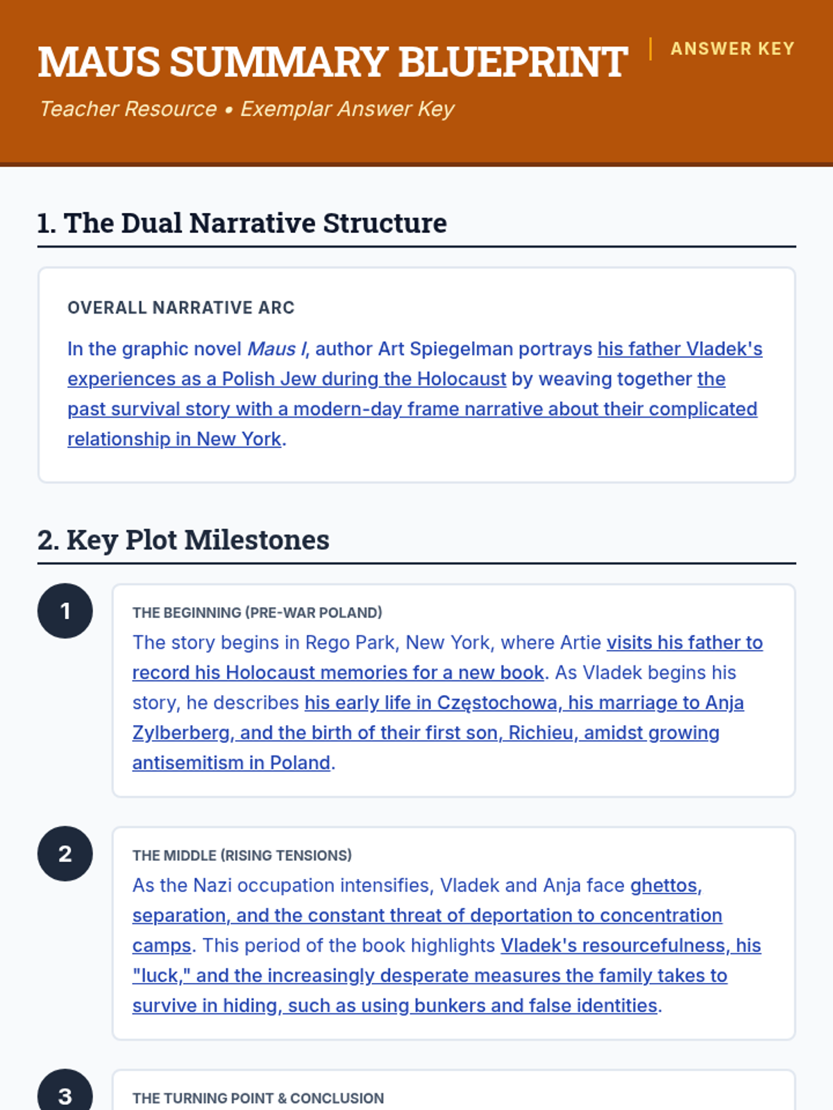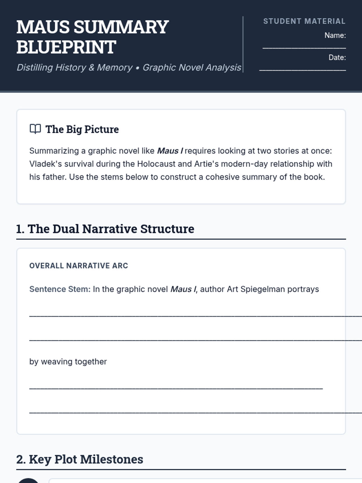 A lesson focused on distilling the complex, dual-narrative structure of Art Spiegelman's Maus I into a concise summary using structured graphic organizers and sentence stems.