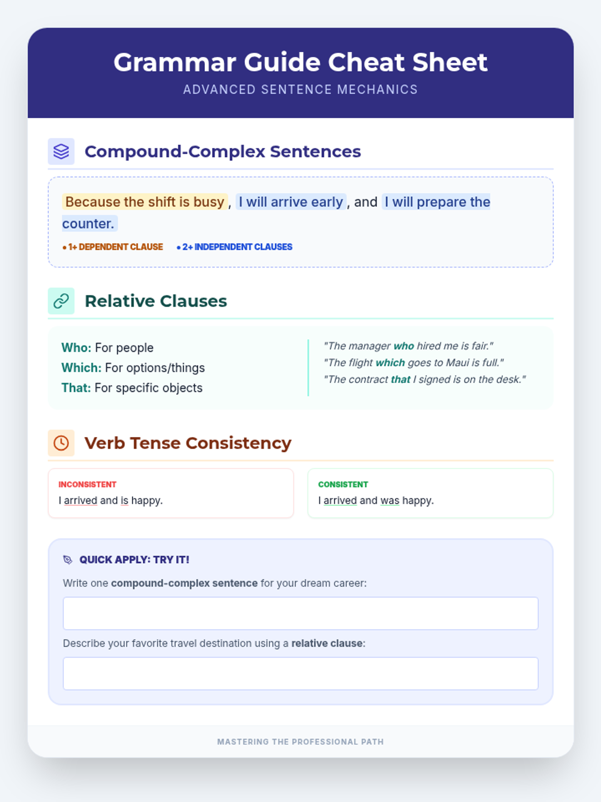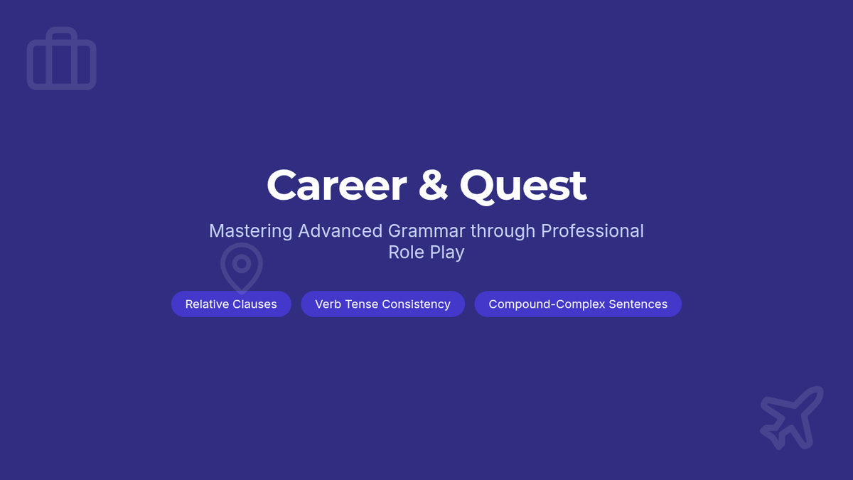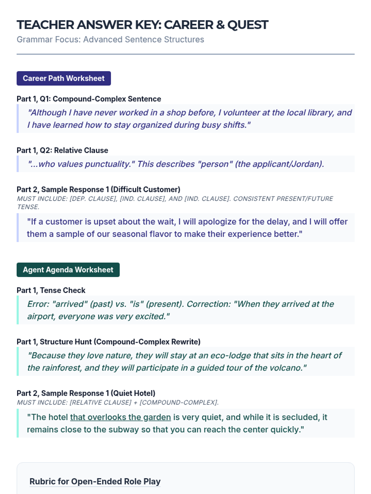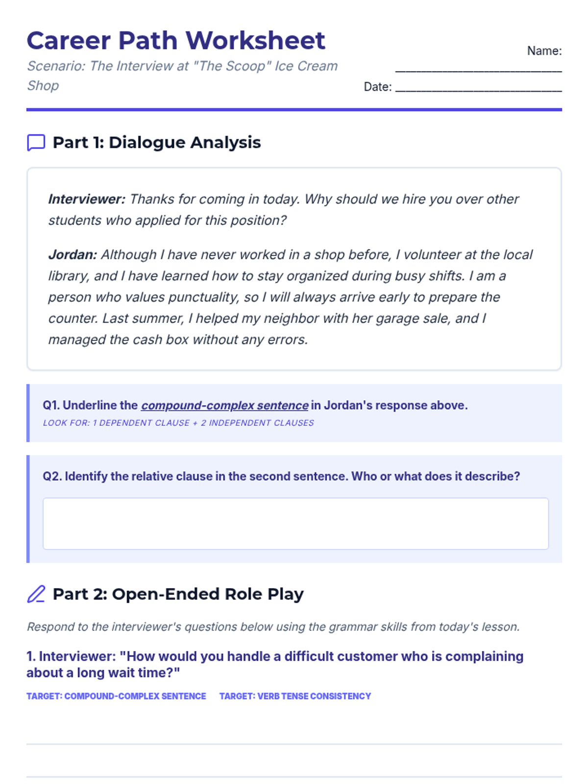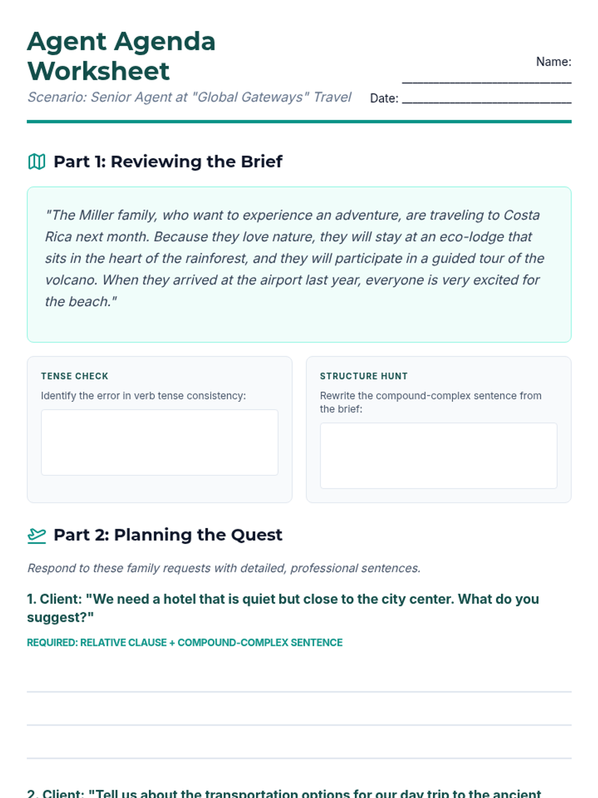 A grammar-focused lesson set in professional and travel contexts, teaching middle schoolers to use compound-complex sentences, relative clauses, and consistent verb tenses through role-play scenarios.