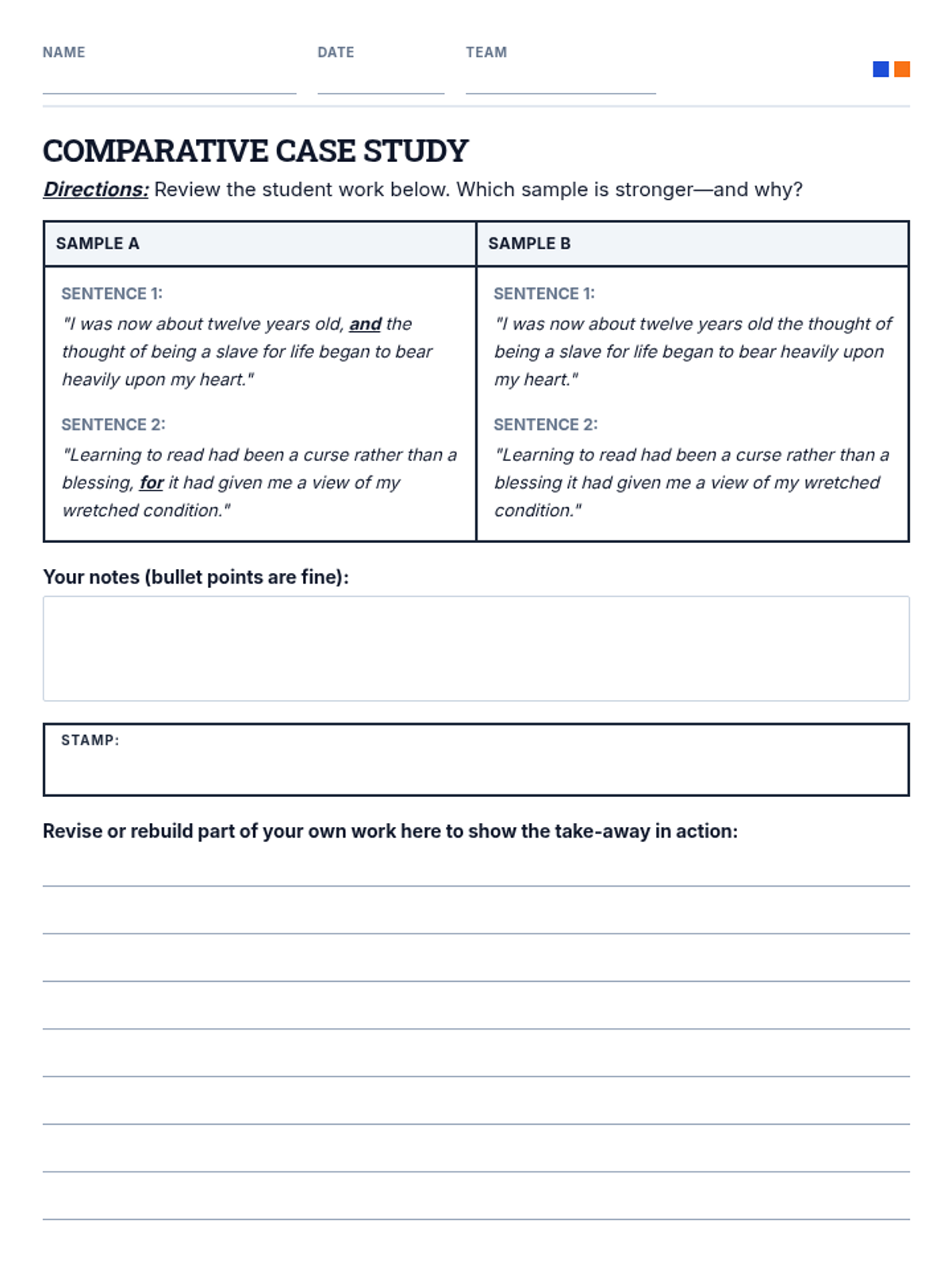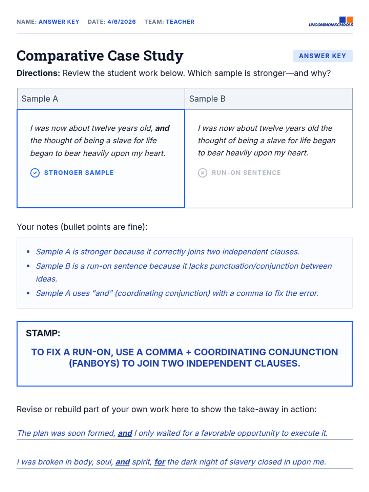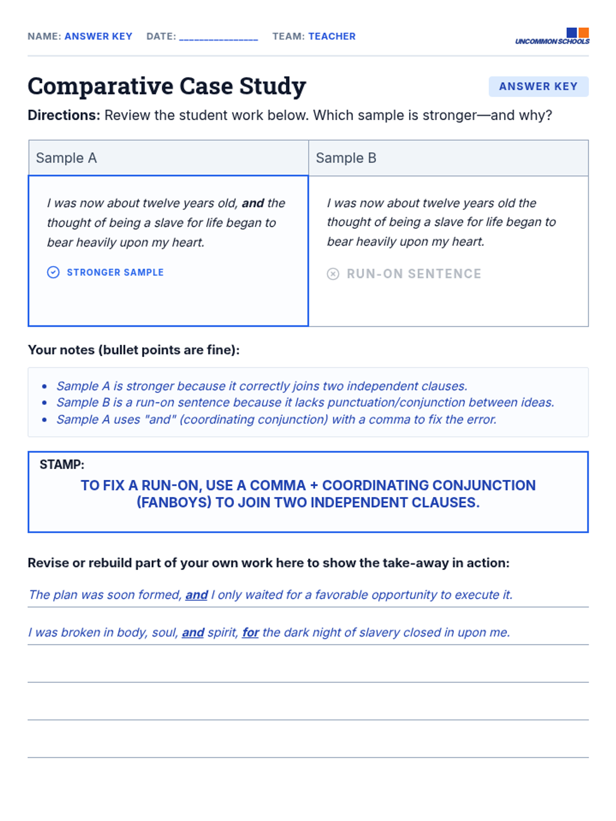 A targeted grammar lesson focused on identifying and correcting run-on sentences using coordinating conjunctions (FANBOYS) within the context of Frederick Douglass's narrative.