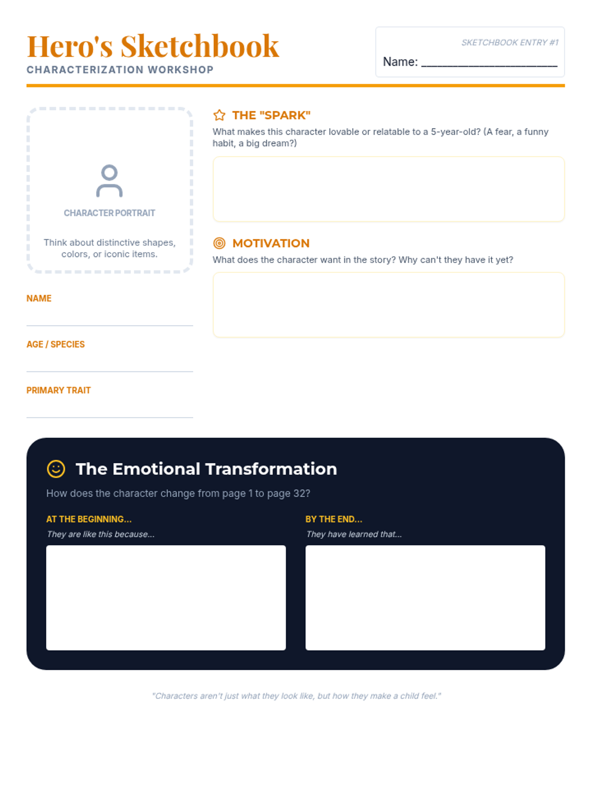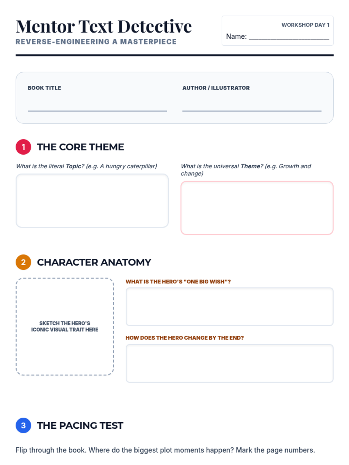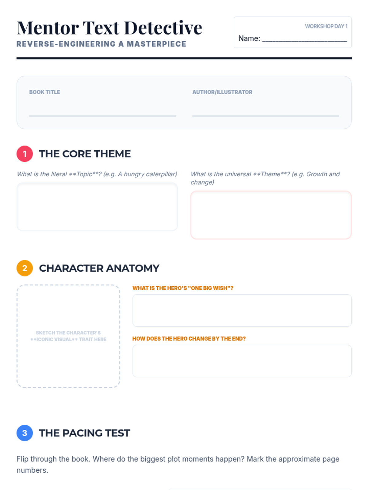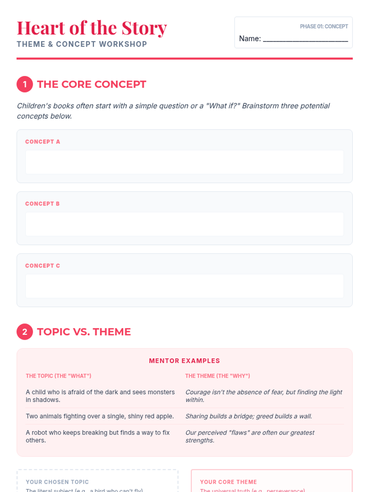 Focuses on the foundational elements of a children's book: establishing a meaningful theme and creating relatable characters for a young audience.