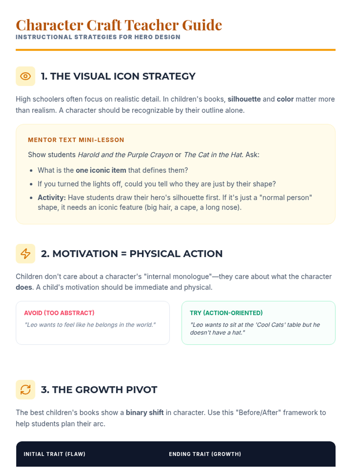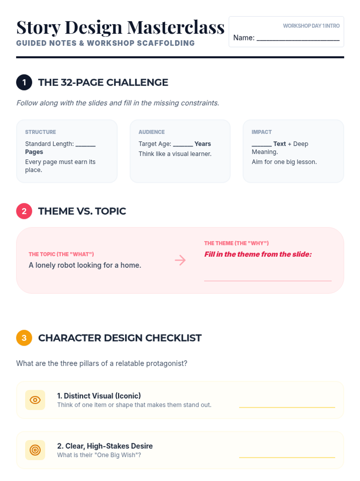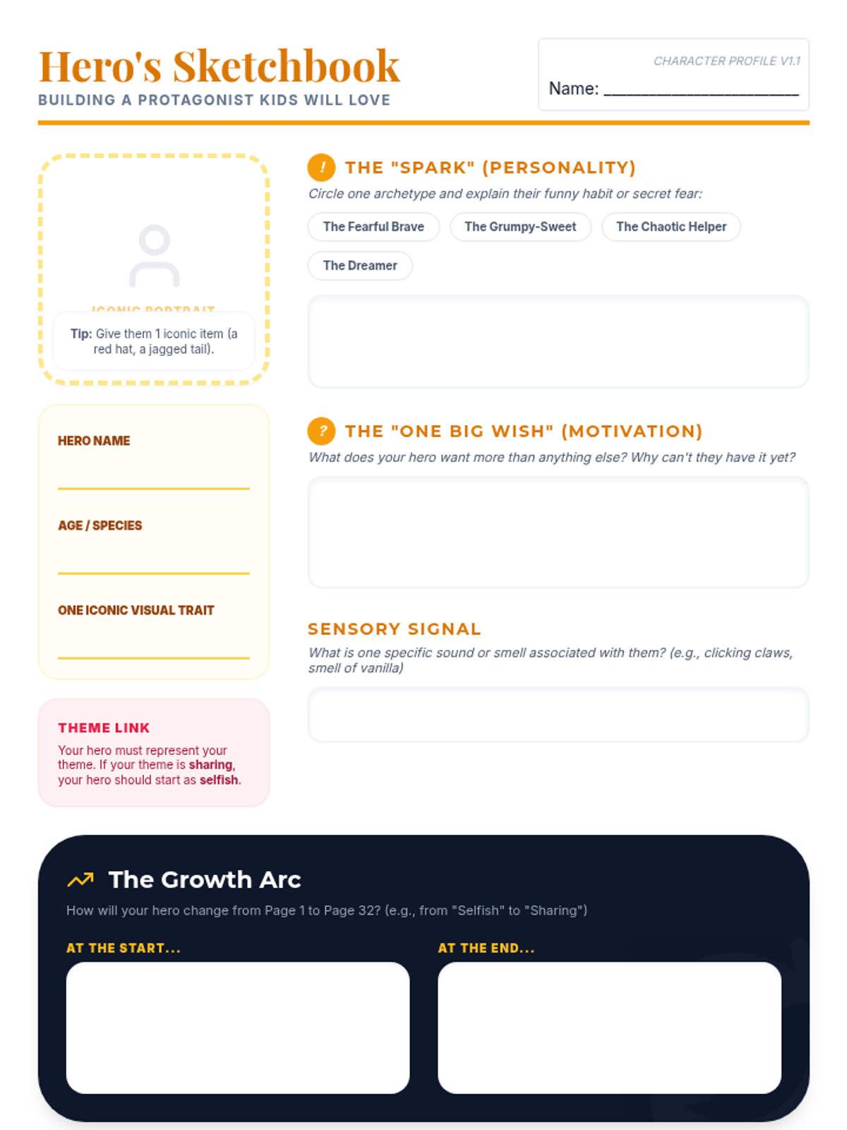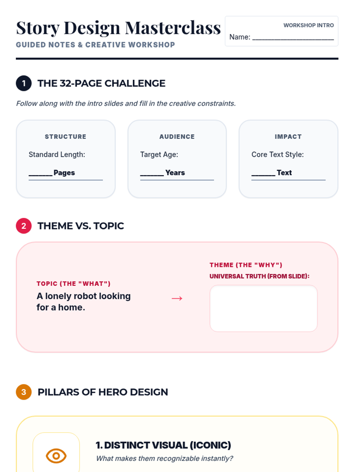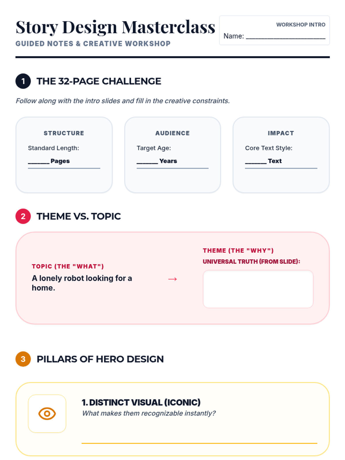 Focuses on the foundational elements of a children's book: establishing a meaningful theme and creating relatable characters for a young audience.