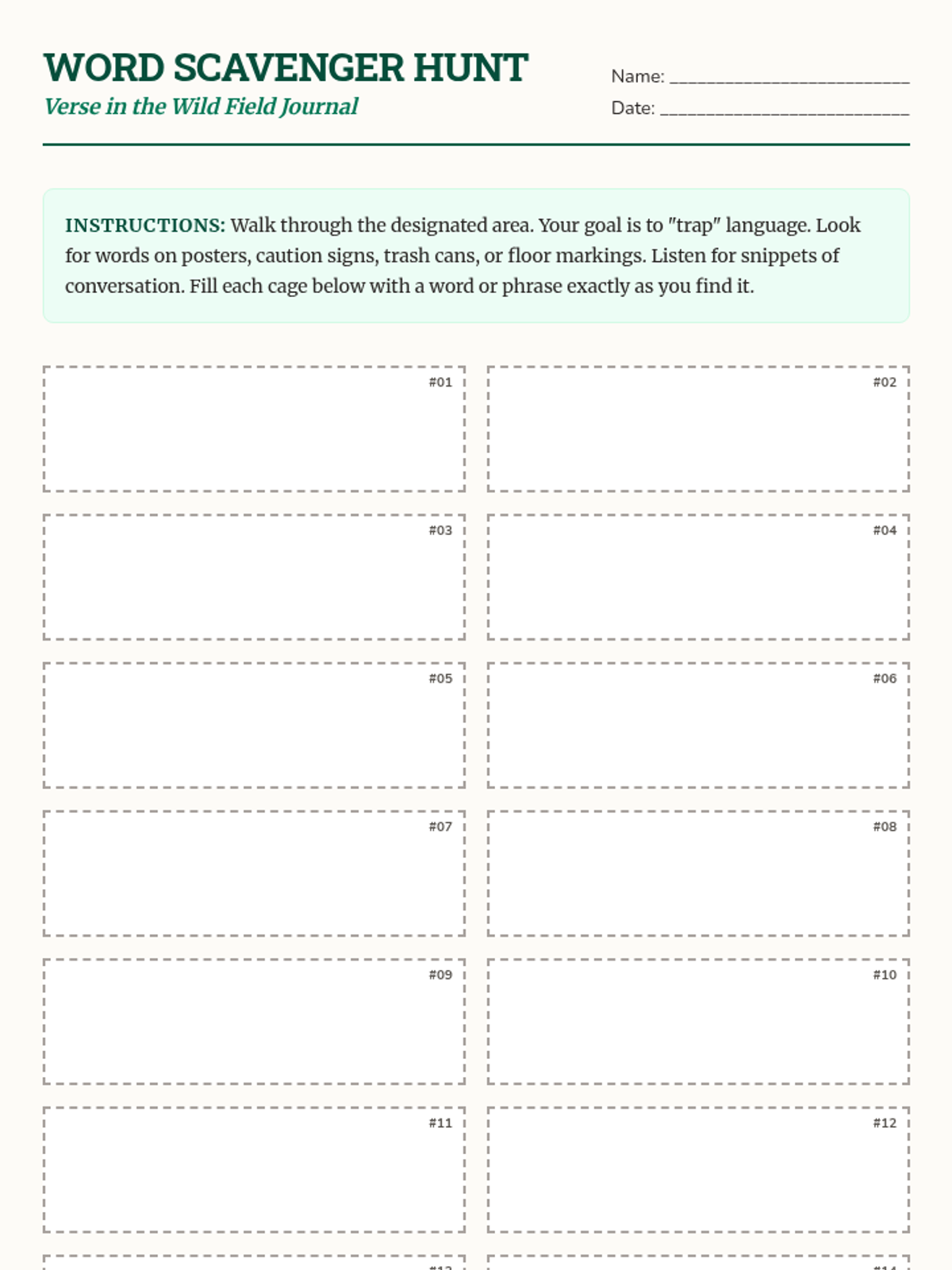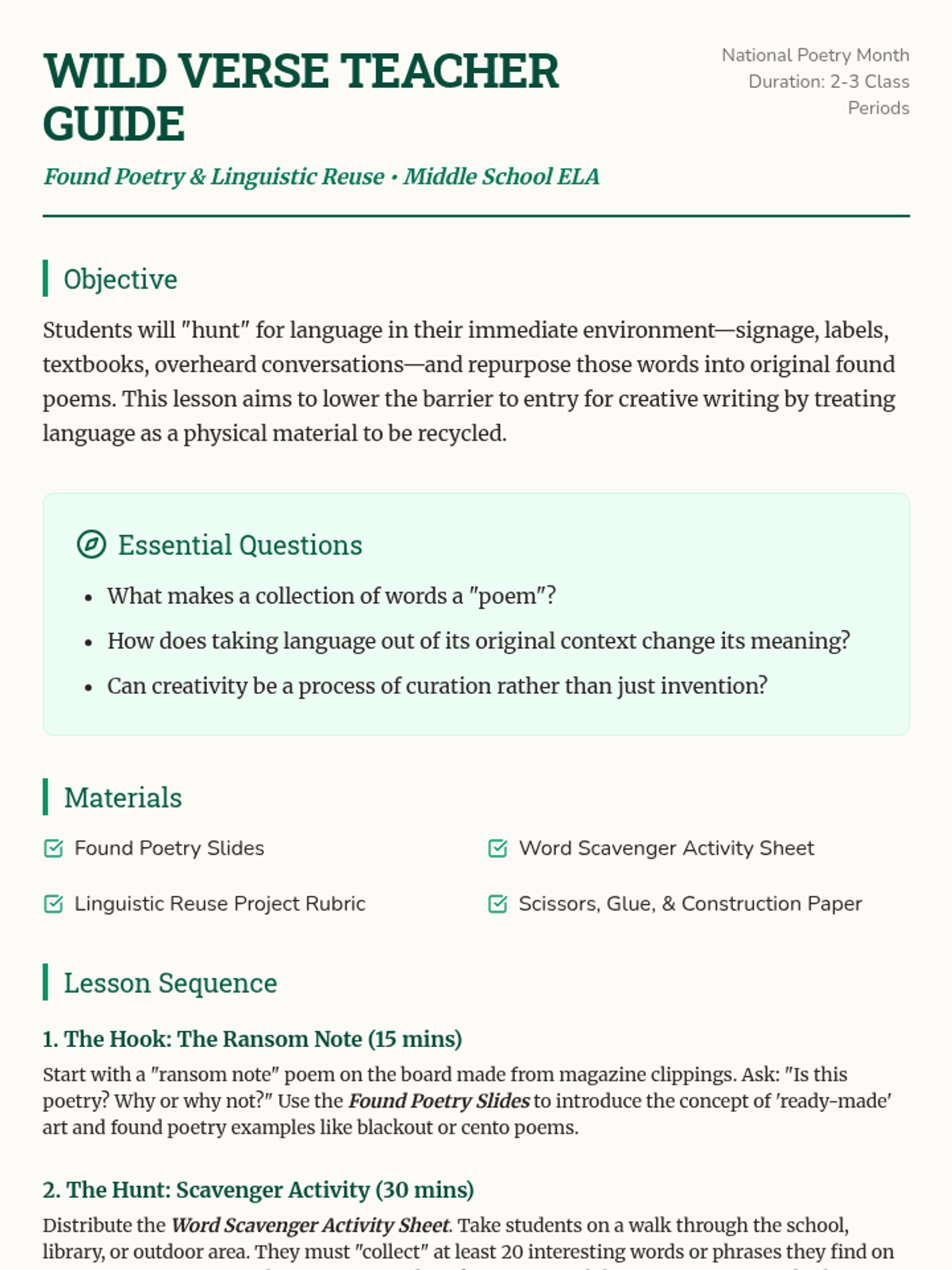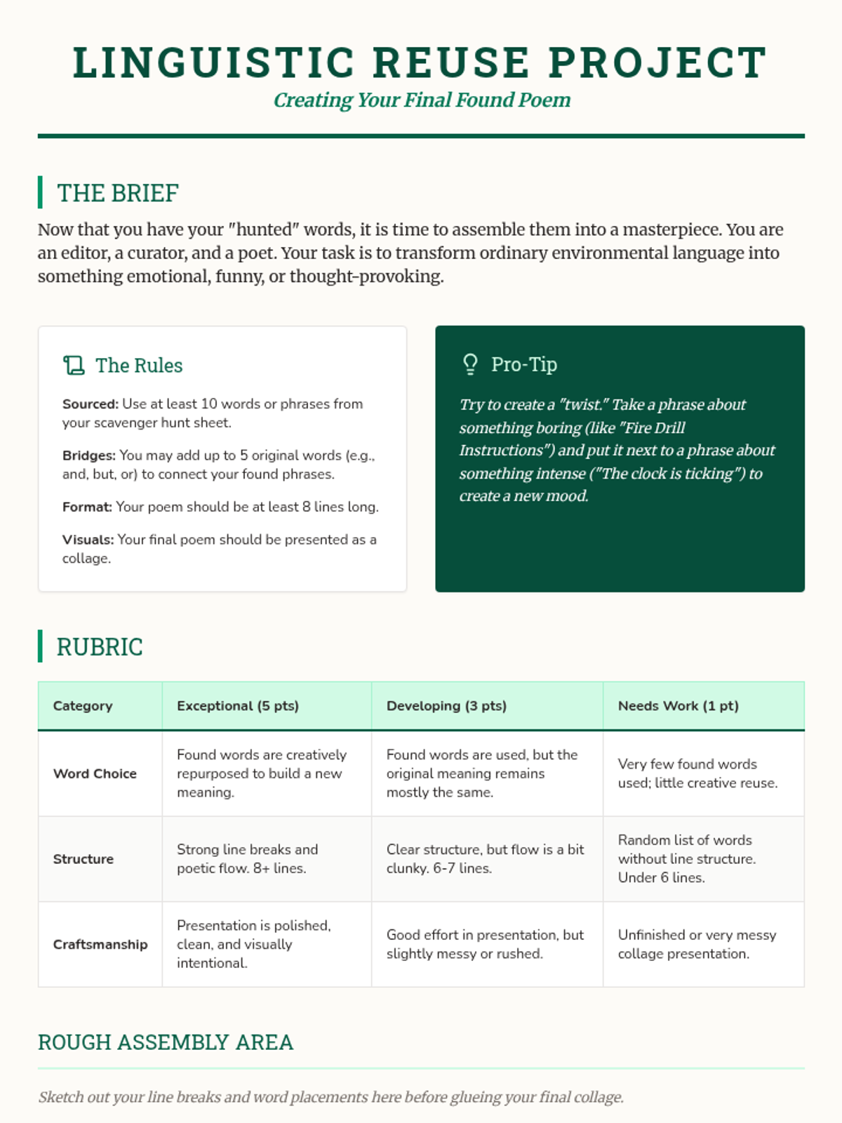 A creative exploration of found poetry for middle schoolers, focusing on sourcing linguistic materials from their environment to demystify the poetic process.