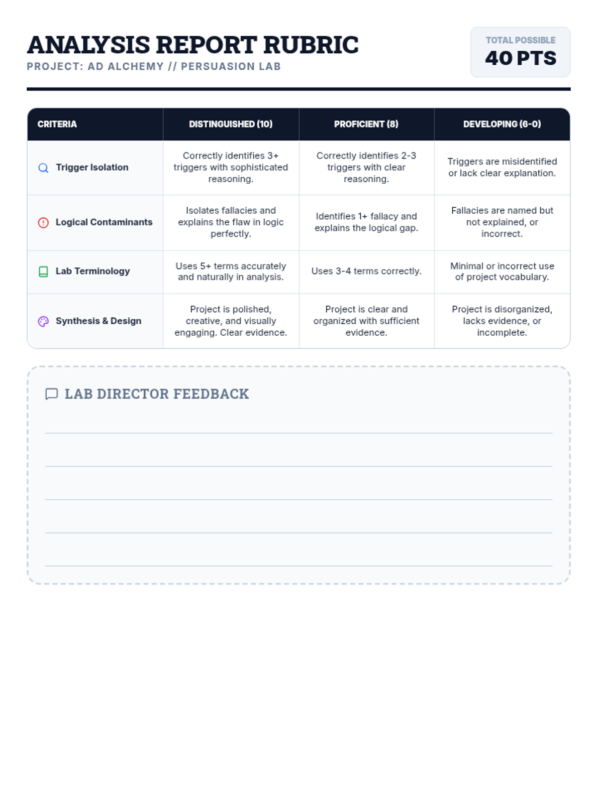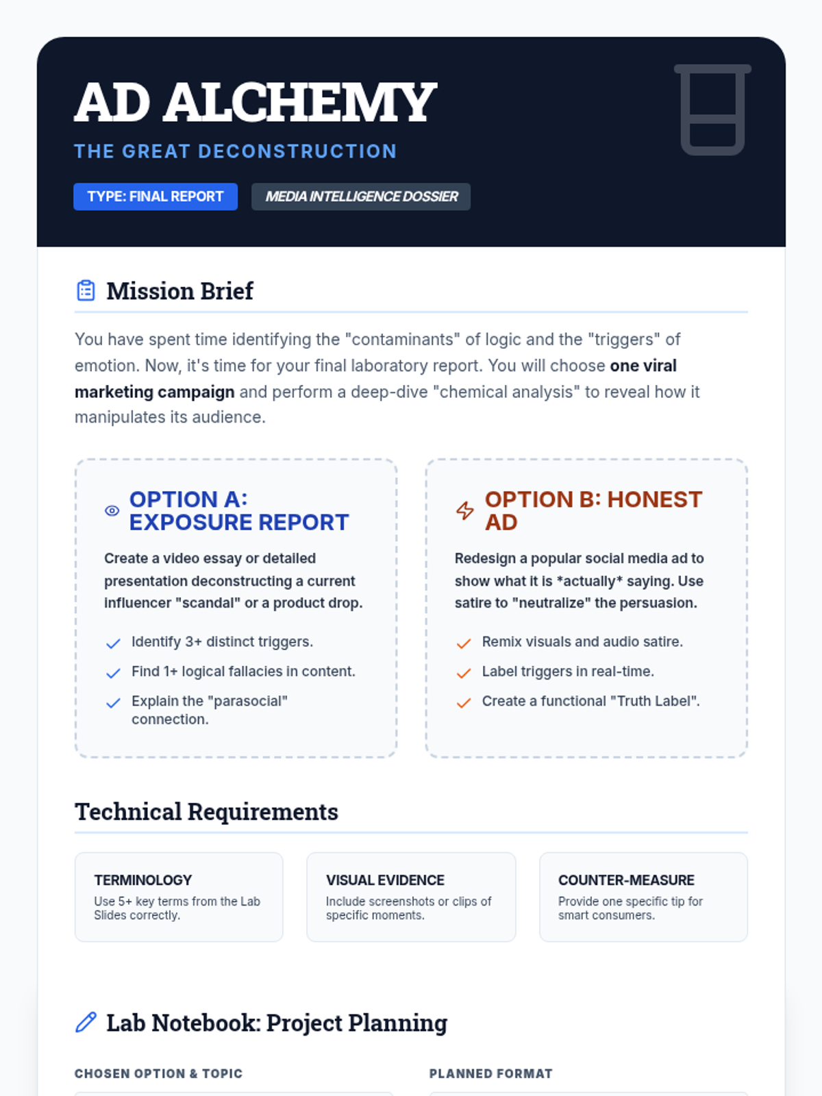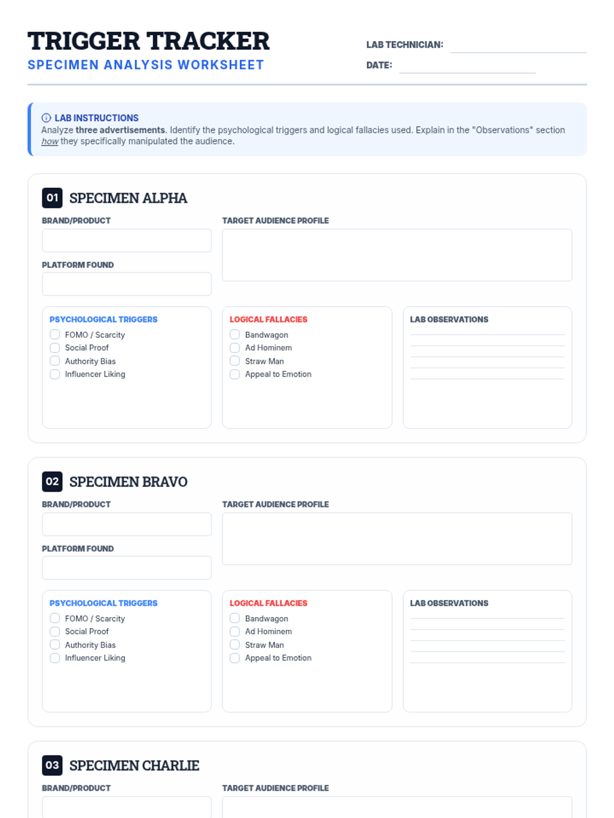 A middle school lesson where students act as media scientists, deconstructing the psychological triggers and logical fallacies found in modern social media advertising. Students will learn to identify manipulation tactics and develop critical thinking skills to become savvy consumers.