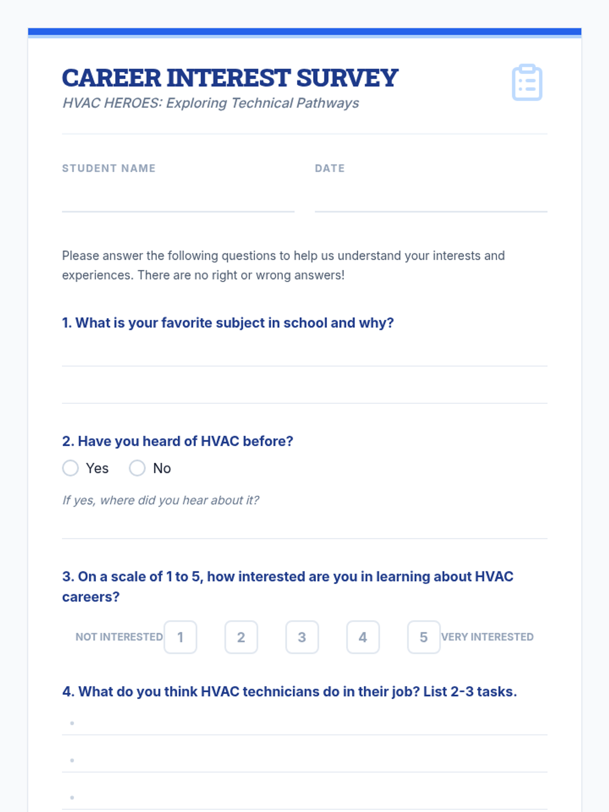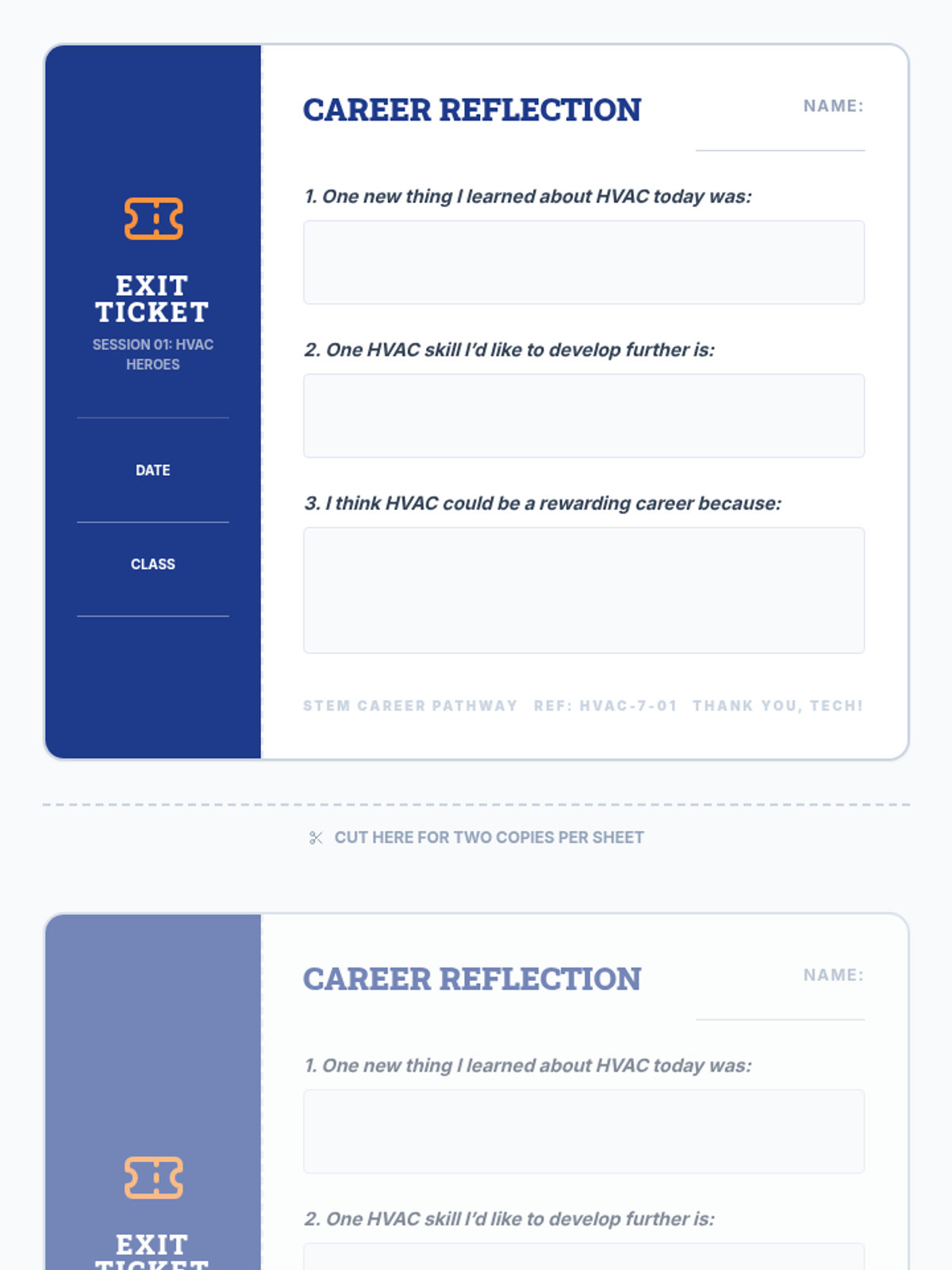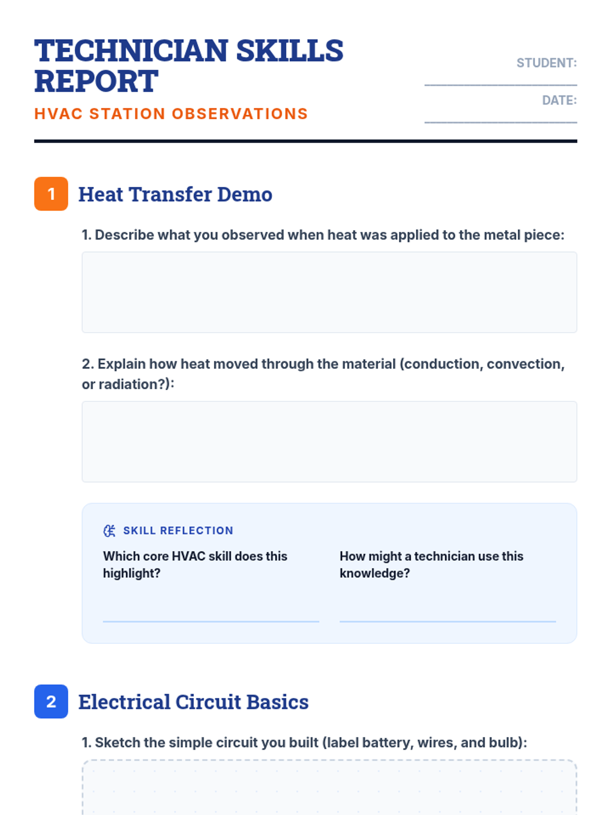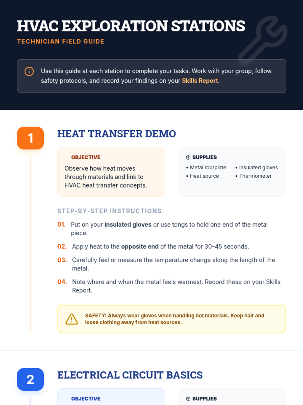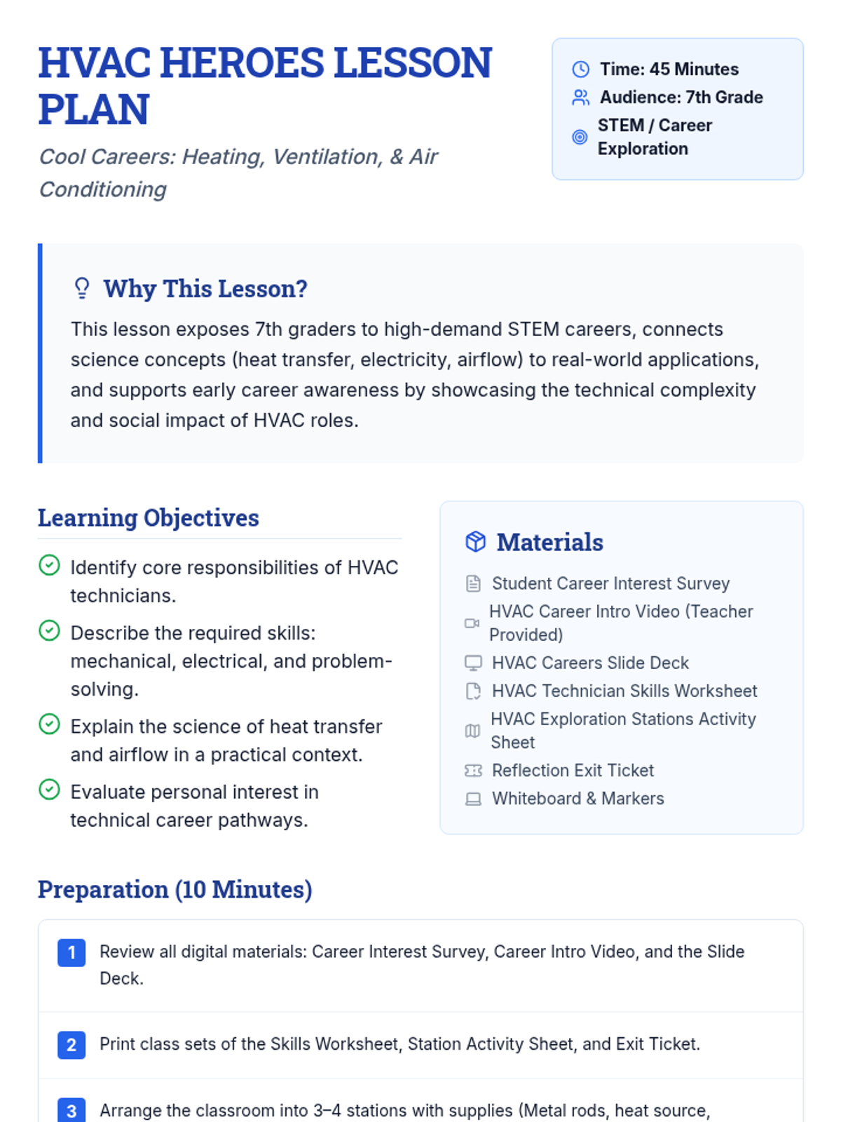 A one-session exploration of HVAC careers for 7th-grade students, connecting STEM concepts like heat transfer and electricity to real-world technical roles. Students engage with hands-on stations and career reflection.