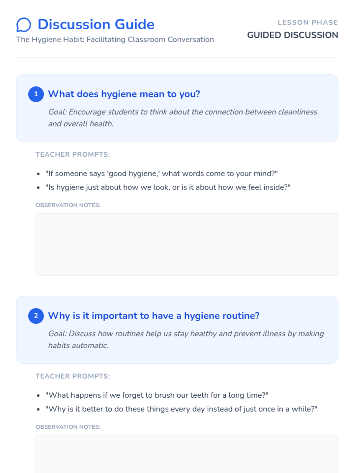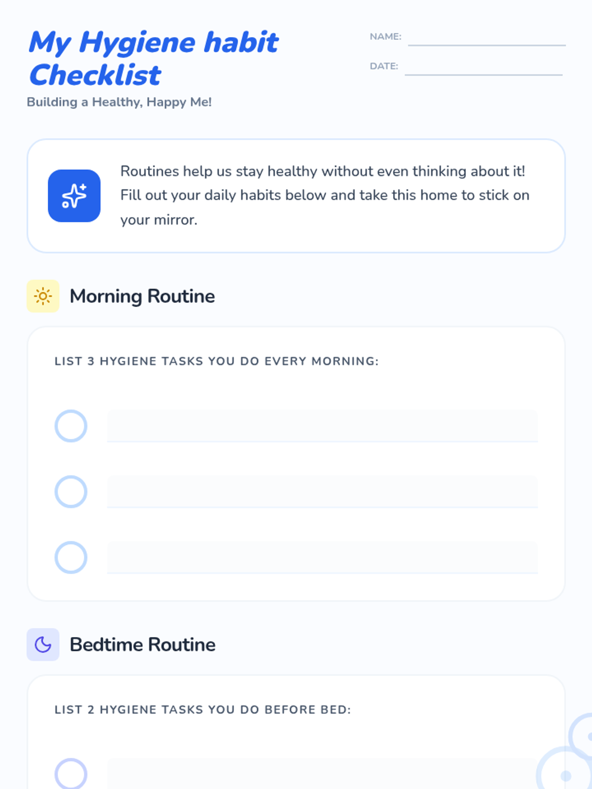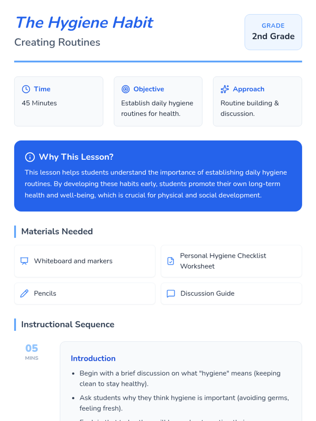 A 45-minute lesson for 2nd graders to understand hygiene and establish their own daily routines through discussion and checklist creation.