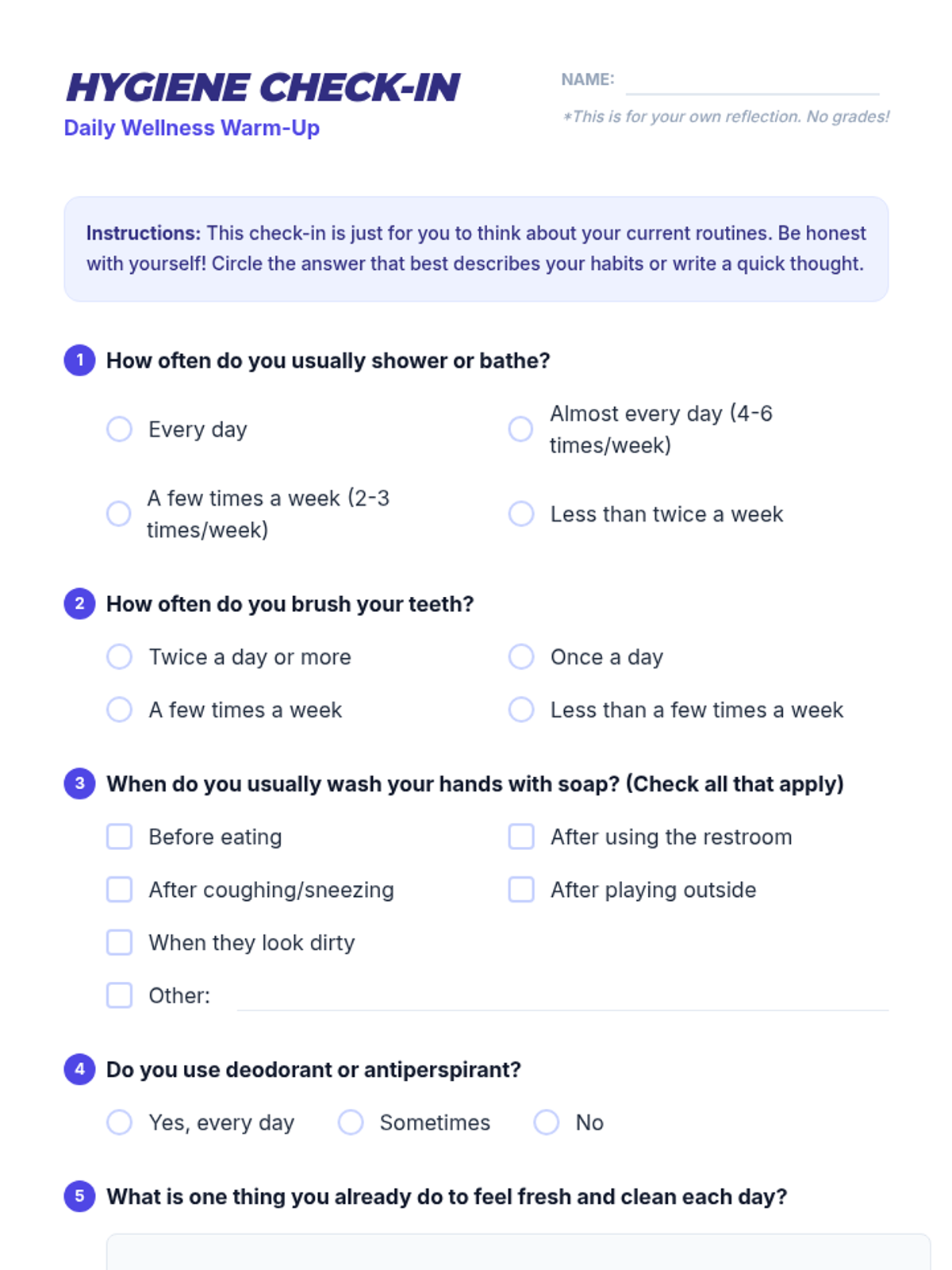 A collection of hygiene reference postcards tailored for elementary, middle school, high school, and adults. Each double-sided card provides empathetic, age-appropriate guidance on essential daily routines to support health and confidence.