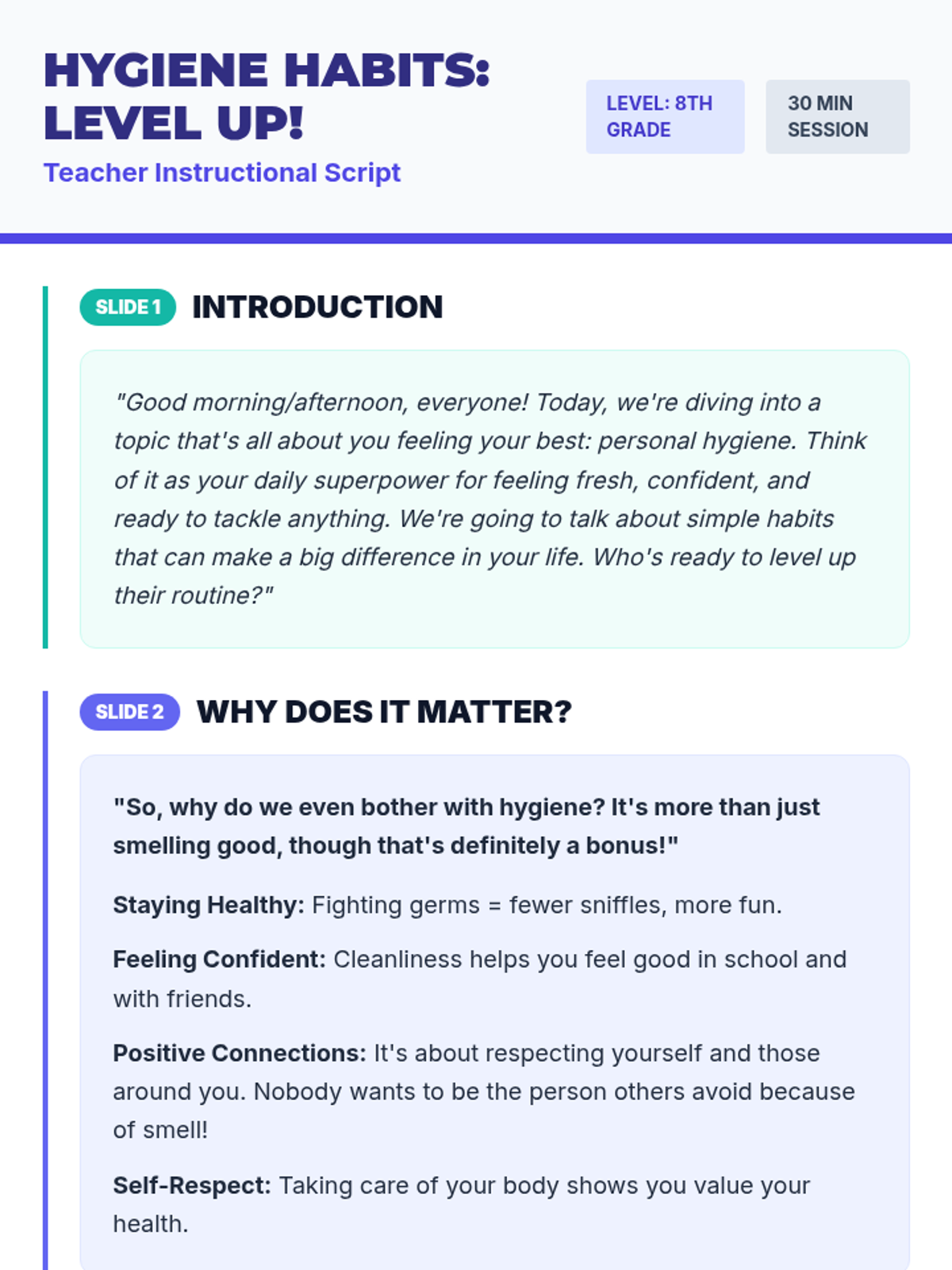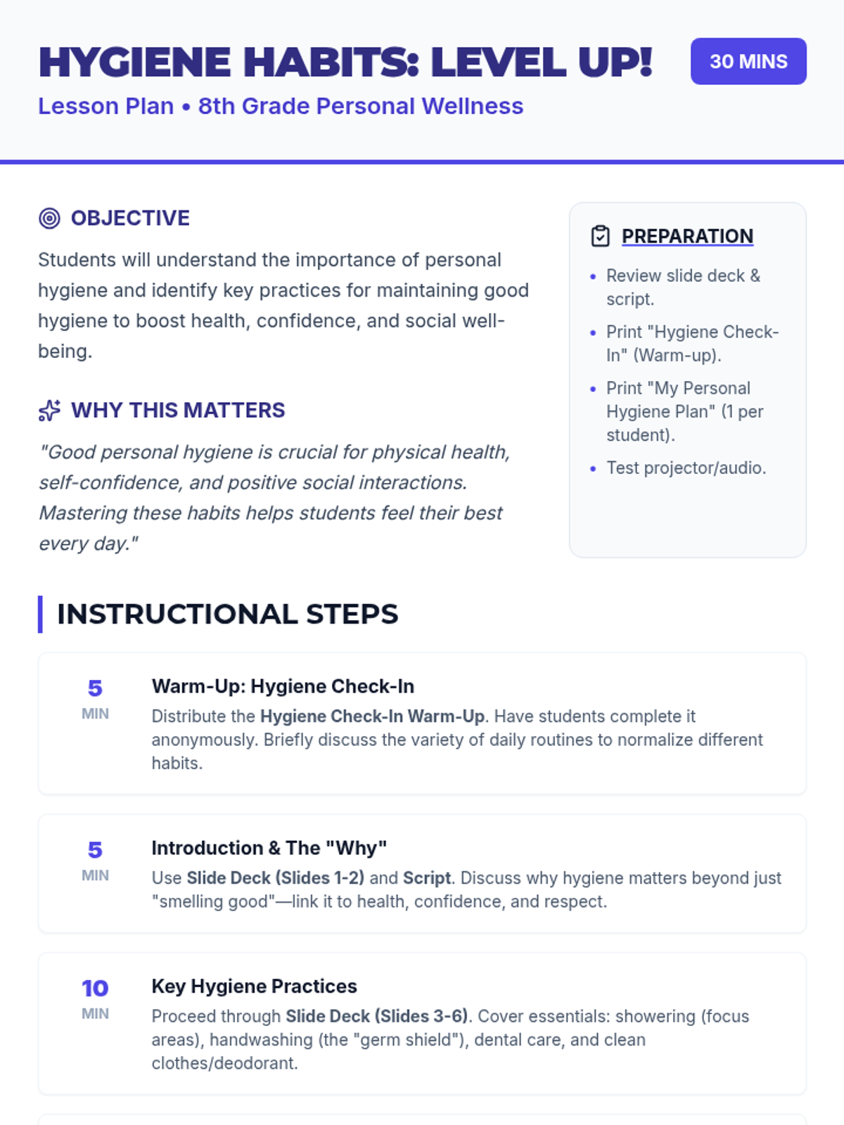 This lesson empowers 8th-grade students with practical knowledge and positive attitudes towards personal hygiene, linking it to self-respect, social comfort, and overall well-being.