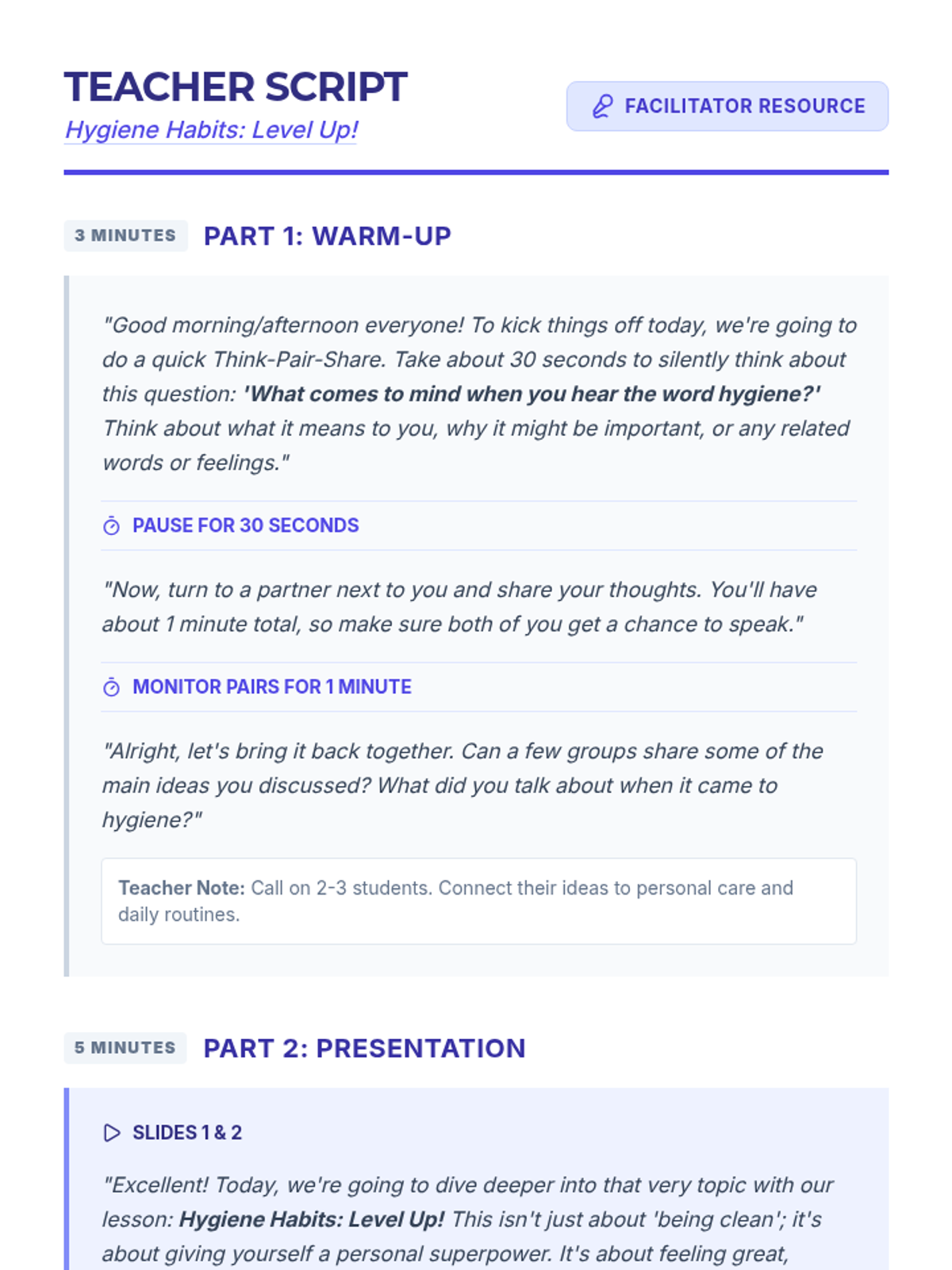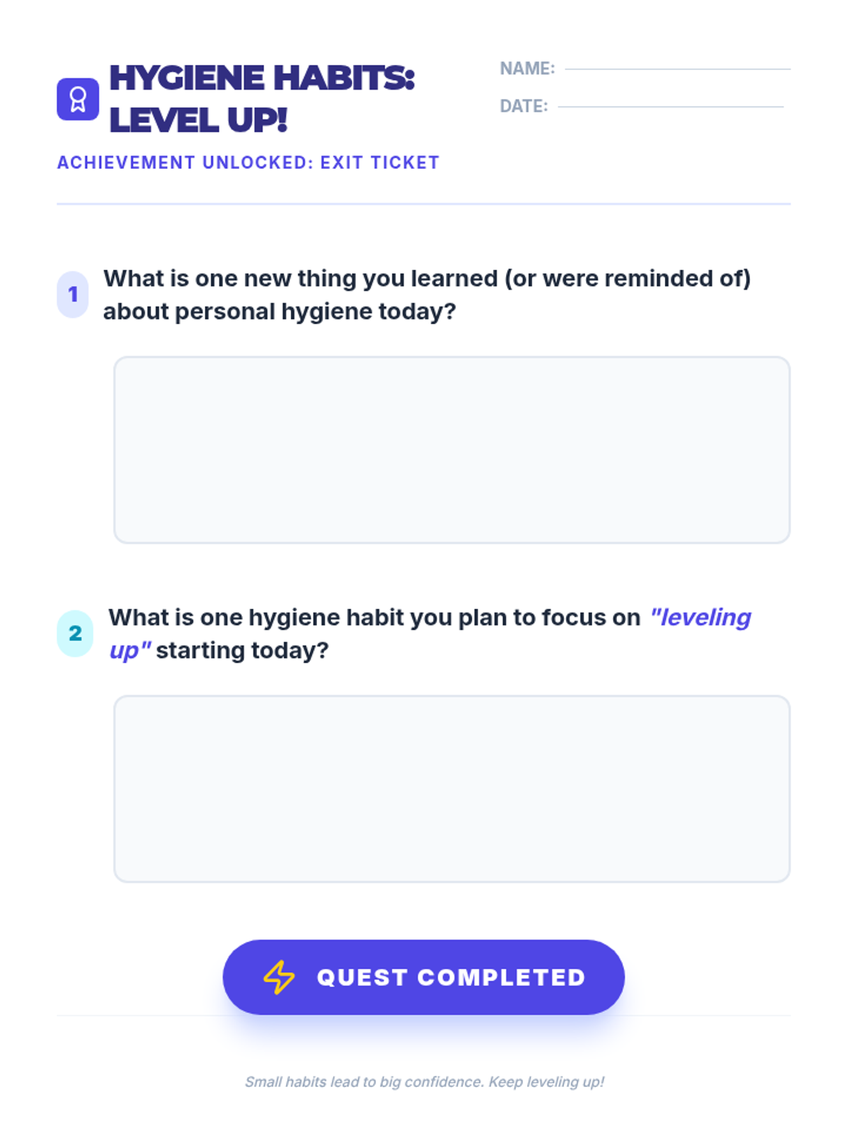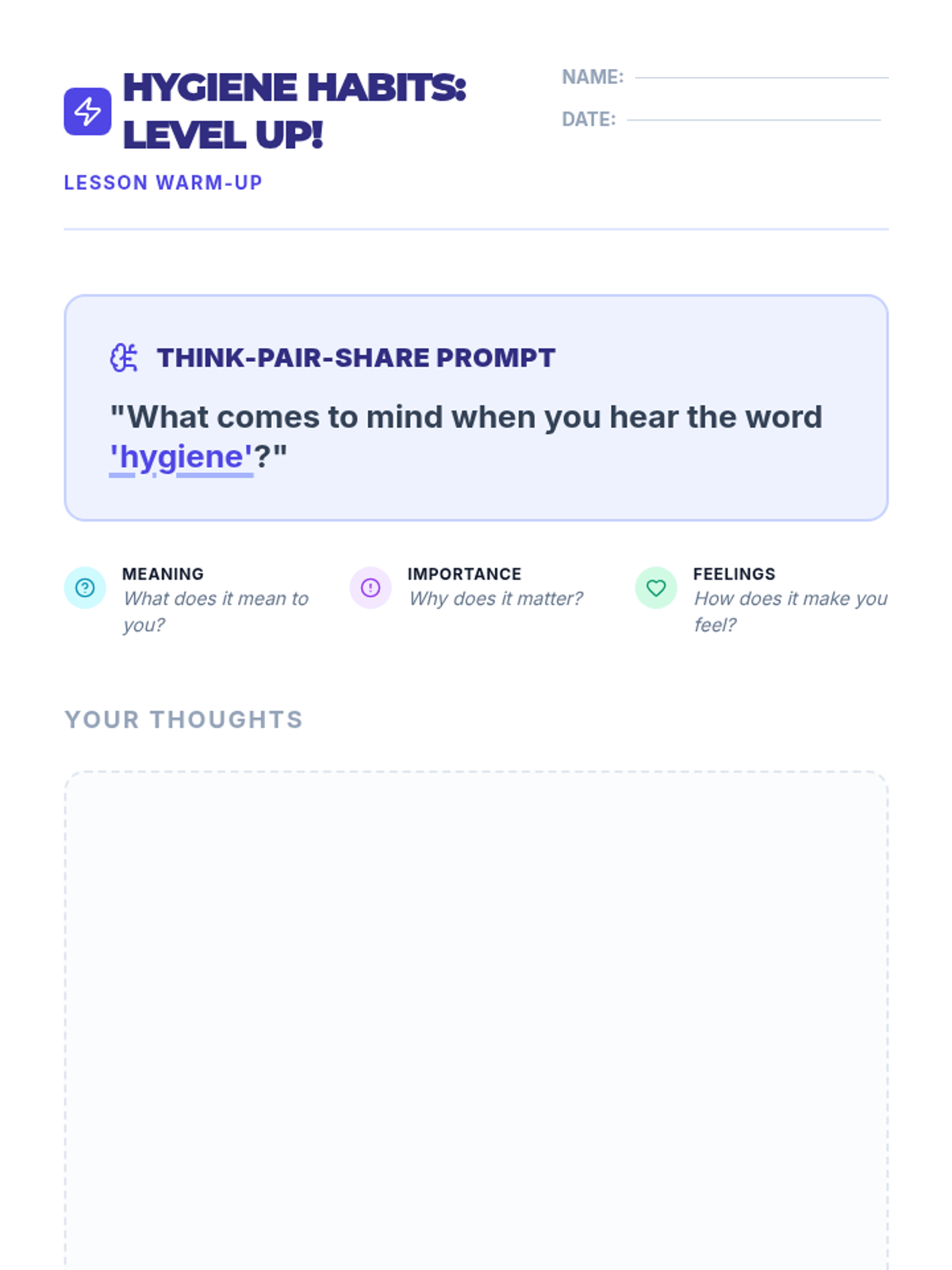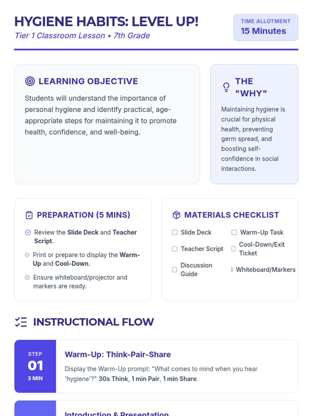 A 15-minute Tier 1 lesson for 7th graders on the importance of personal hygiene, focusing on health, confidence, and social well-being through practical, 'level-up' habits.