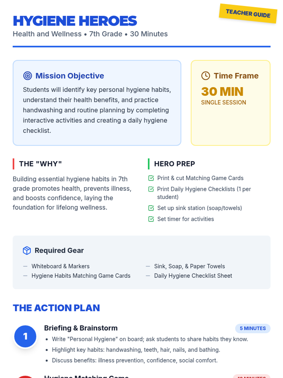 A 30-minute lesson for 7th graders focused on essential personal hygiene habits, their health benefits, and establishing daily routines for lifelong wellness.