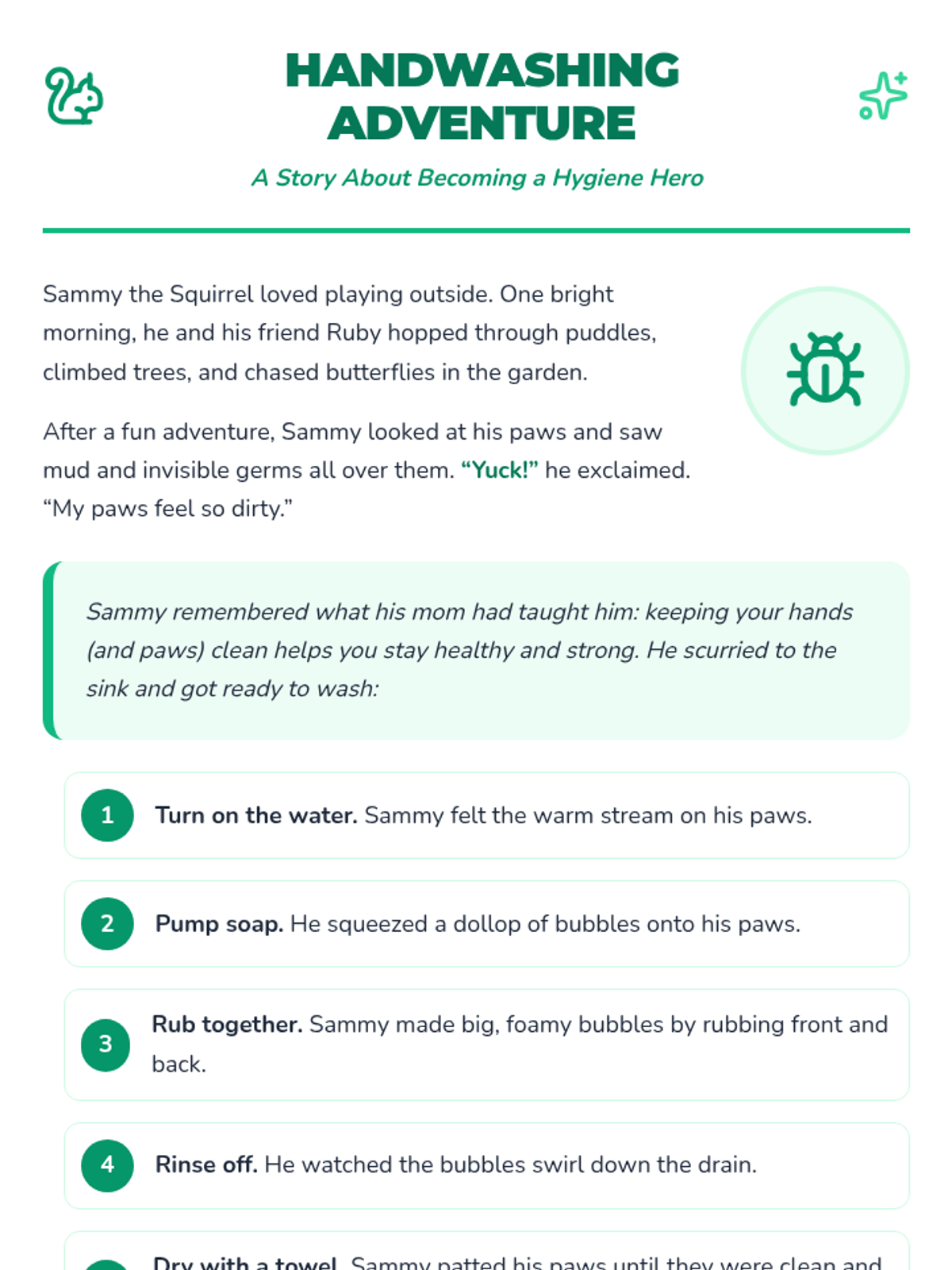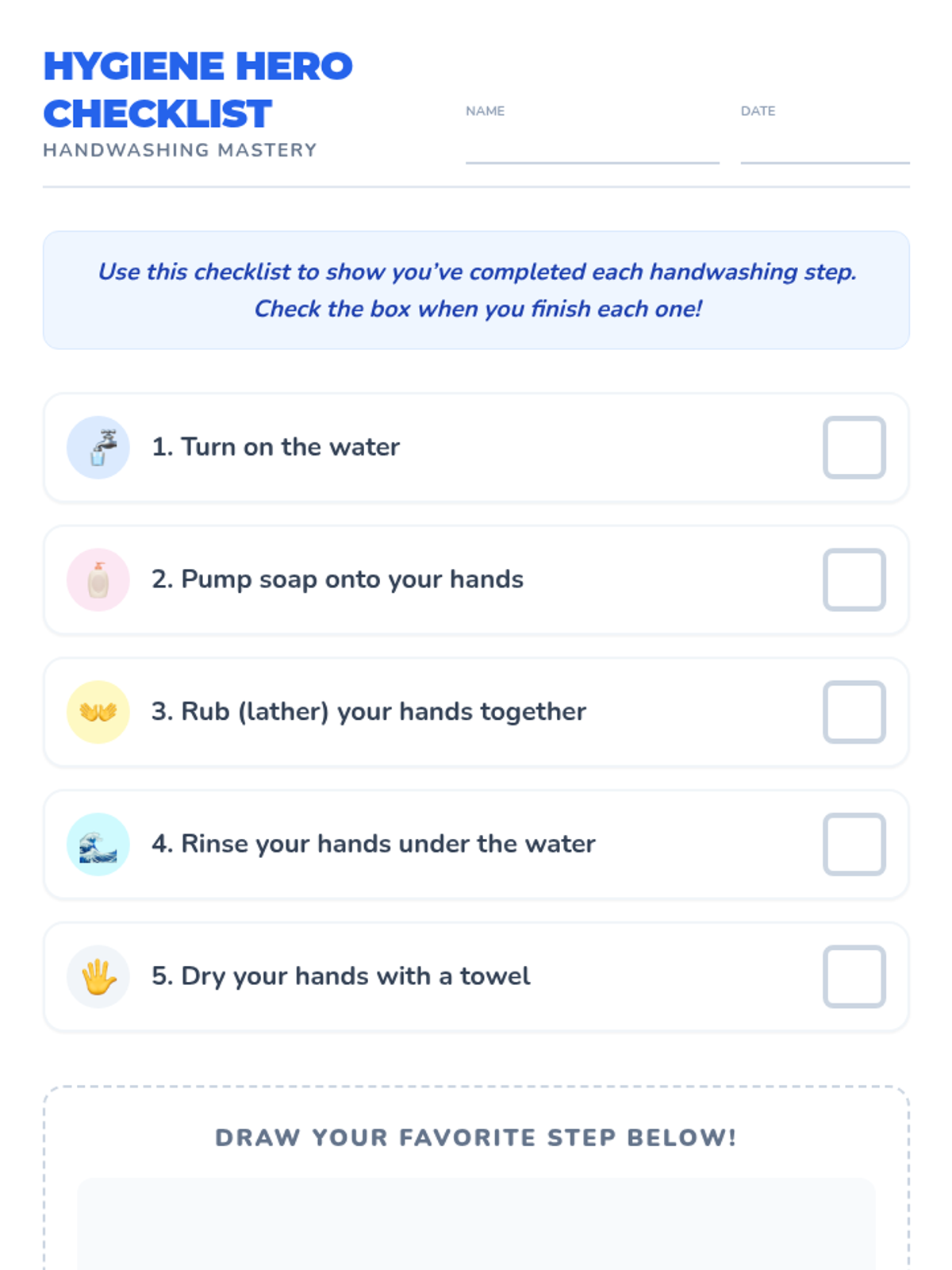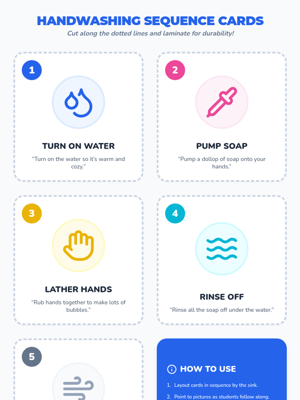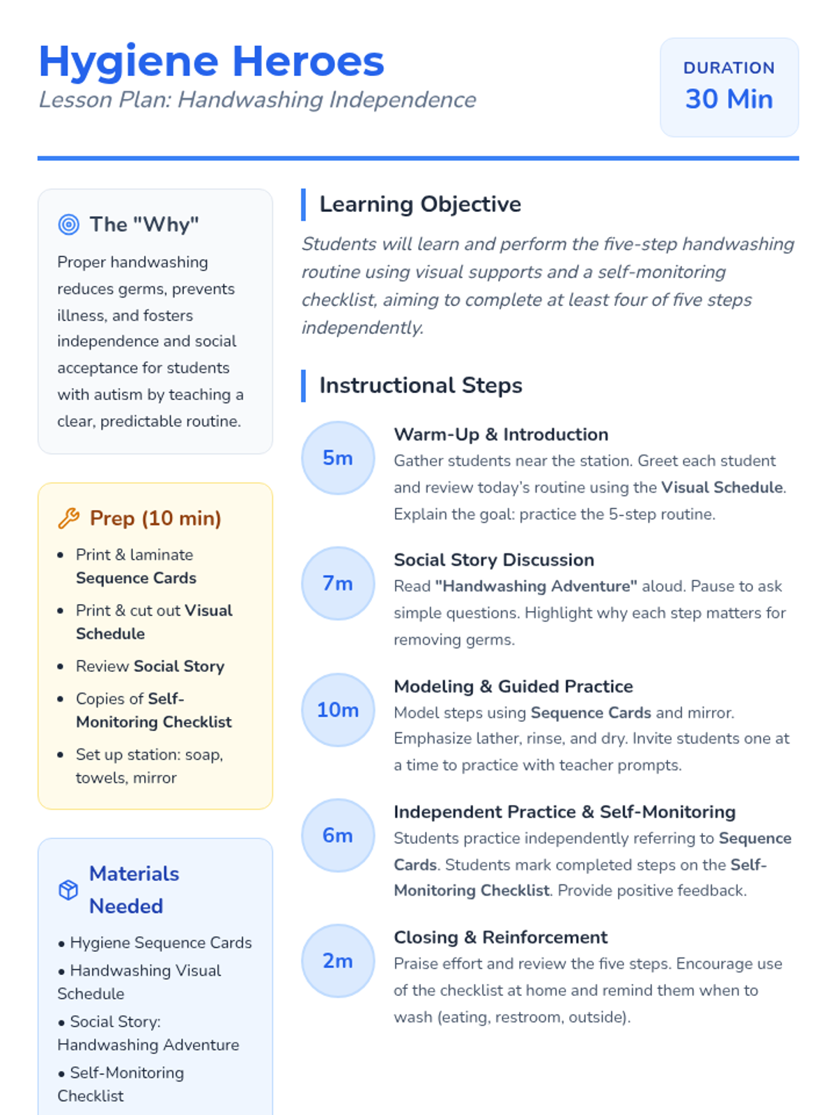 In this 30-minute Tier 2 group session, 2nd graders with autism learn the essential 5-step handwashing routine through visual supports, a social story, and guided practice. The lesson focuses on building independence and confidence in personal hygiene routines.