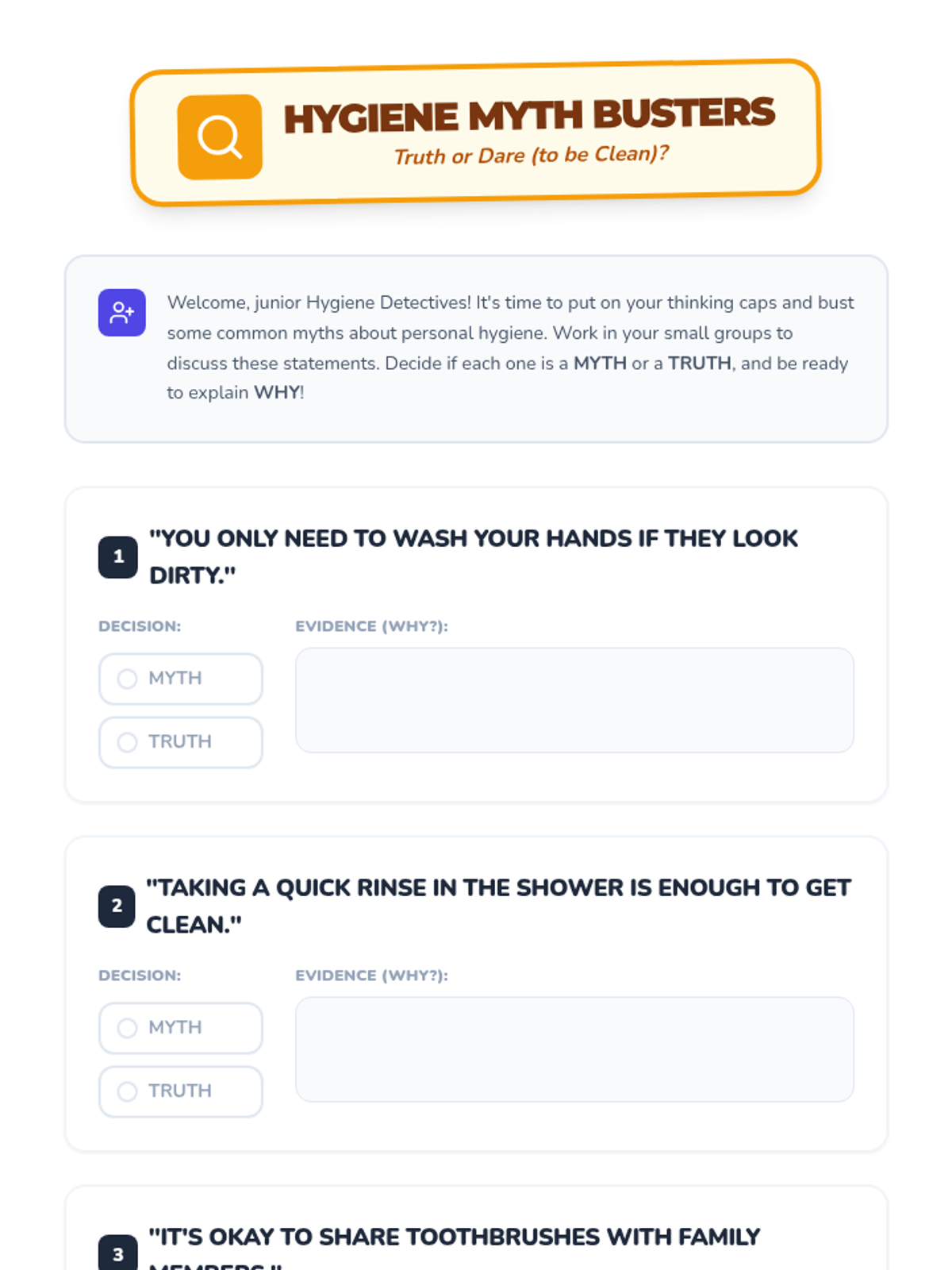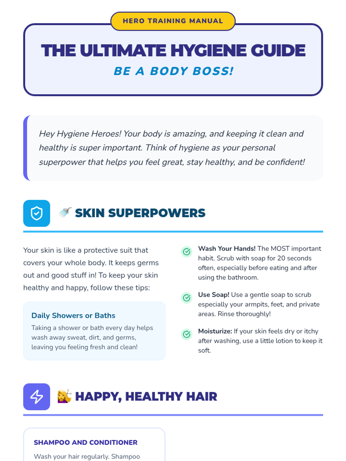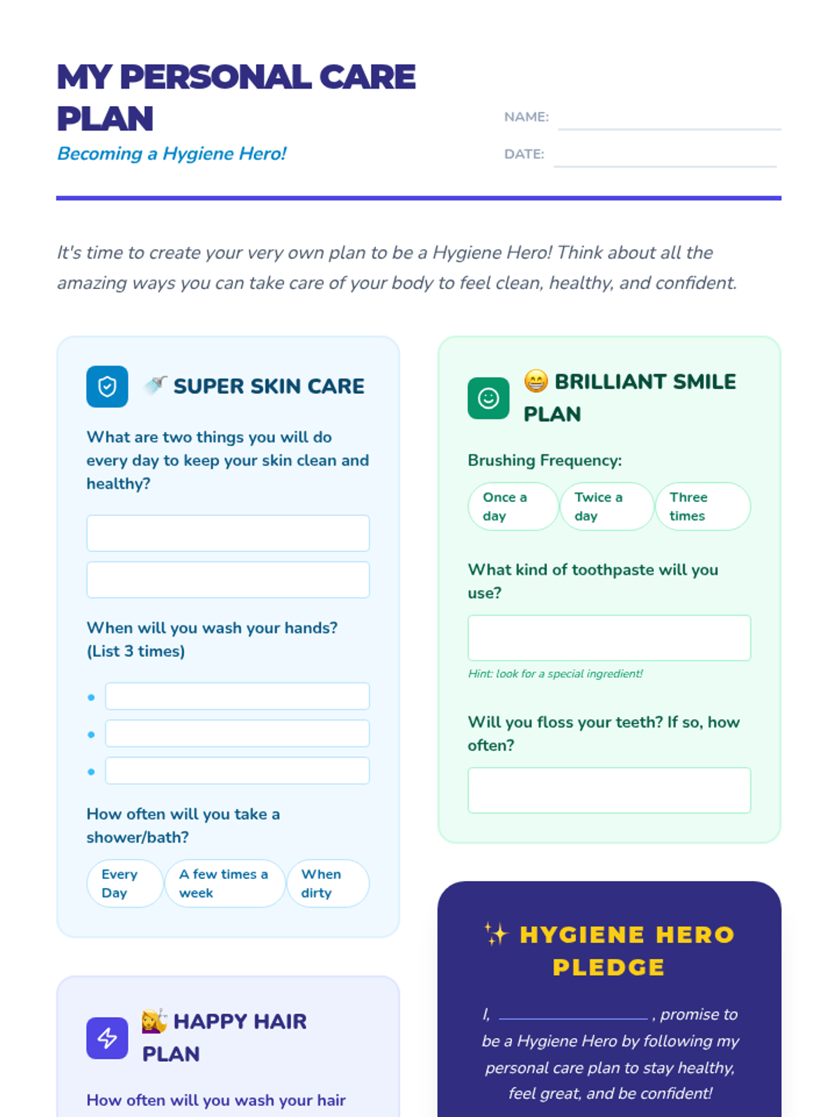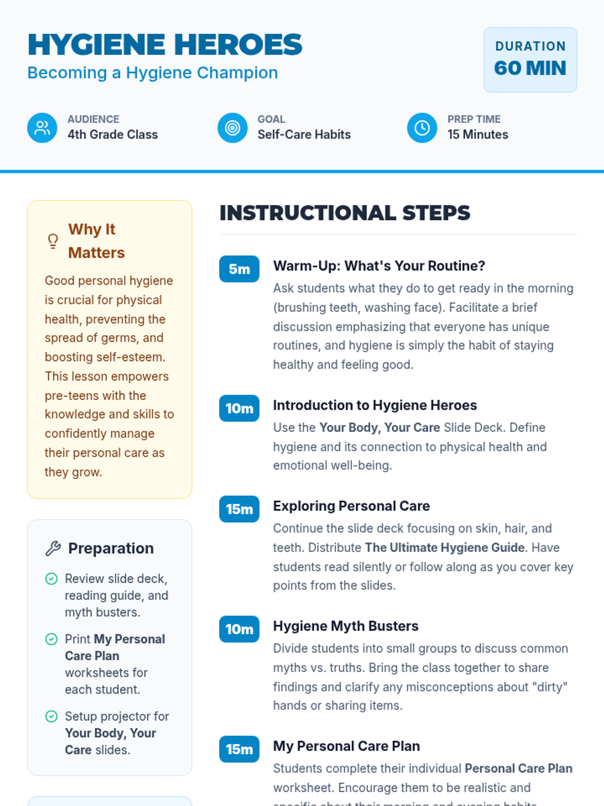 A comprehensive lesson on personal hygiene for pre-teens, covering skin, hair, and dental care through interactive activities and a personal planning worksheet. Students learn to become 'Hygiene Heroes' to boost health and confidence during puberty.