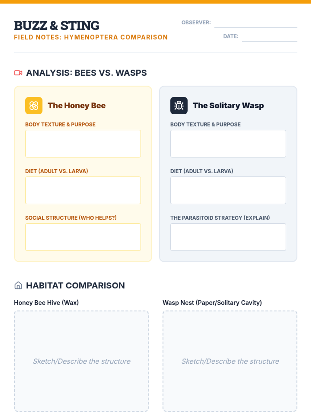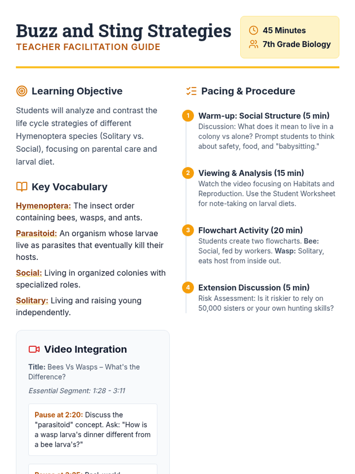 A 7th-grade biology lesson comparing the social and solitary life strategies of Hymenoptera (bees and wasps), focusing on feeding habits and reproductive cycles.