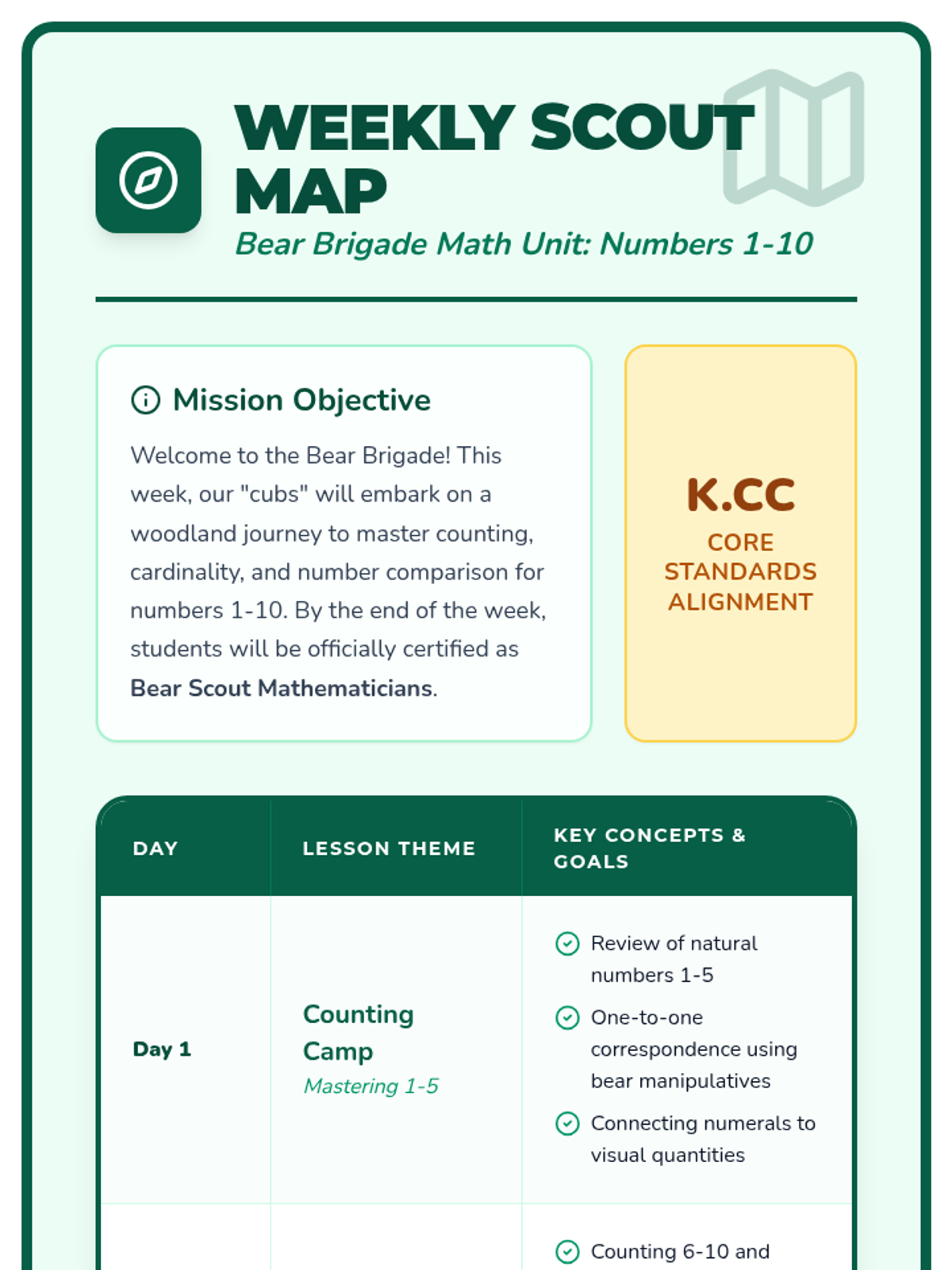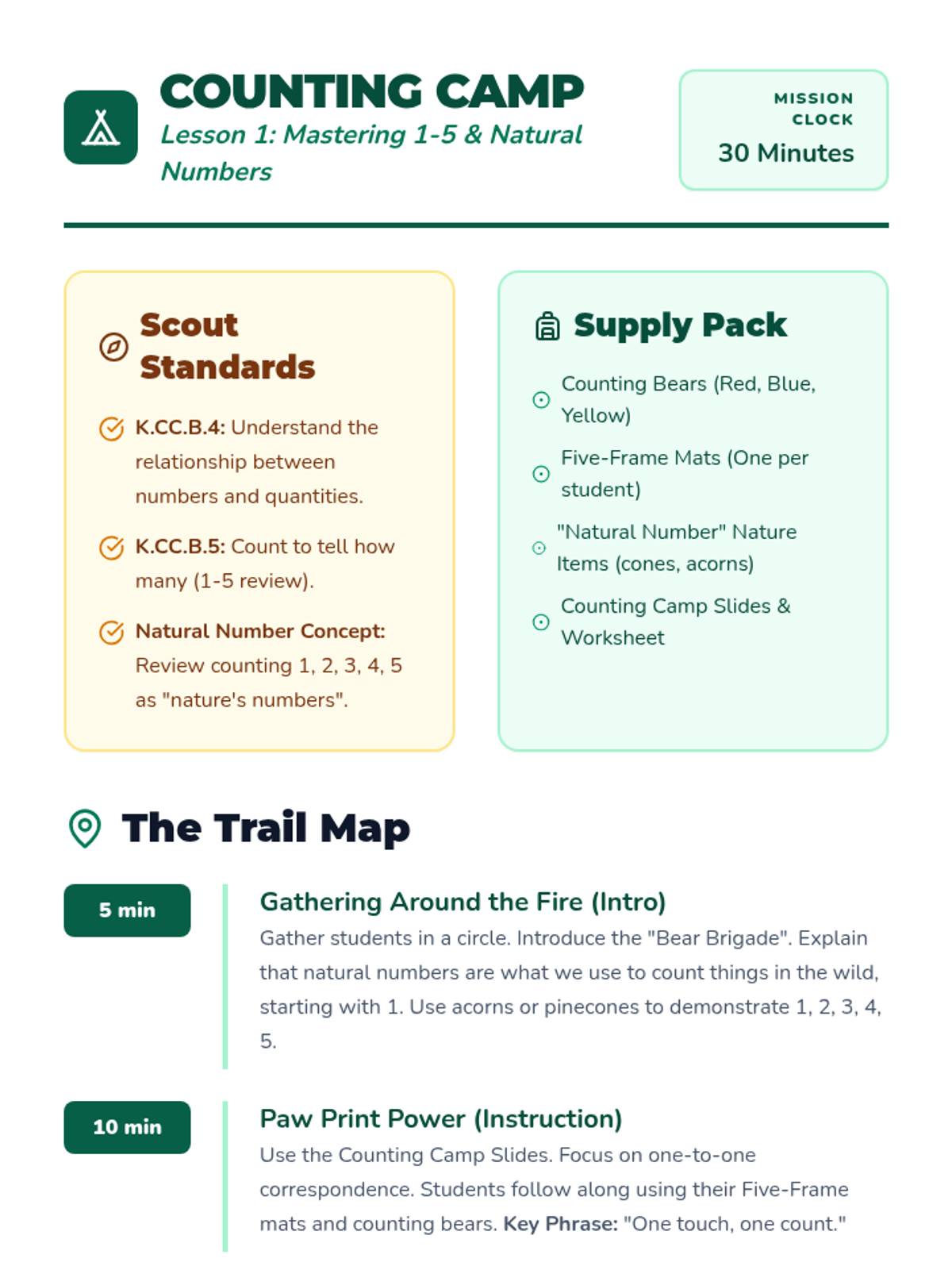 The introductory lesson of the Bear Brigade Math sequence, focusing on mastering counting and one-to-one correspondence for numbers 1-5 using counting bears and nature-themed visuals.