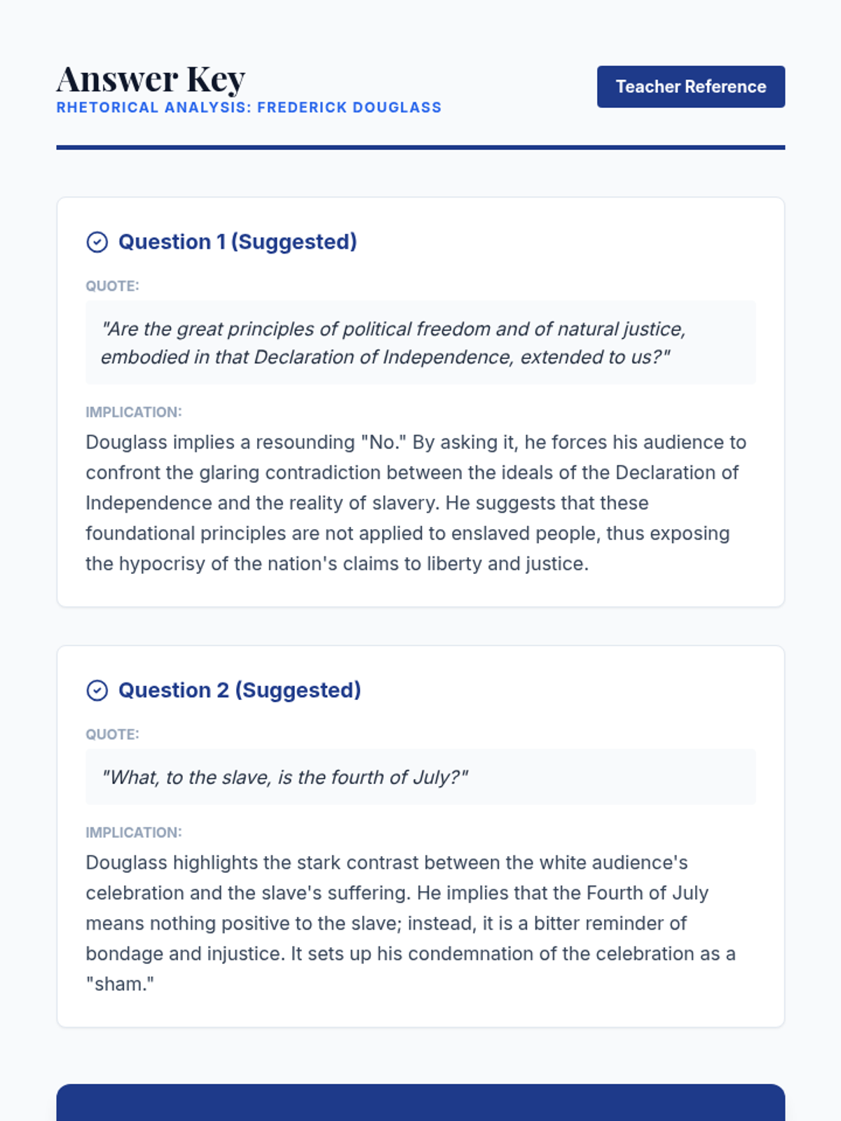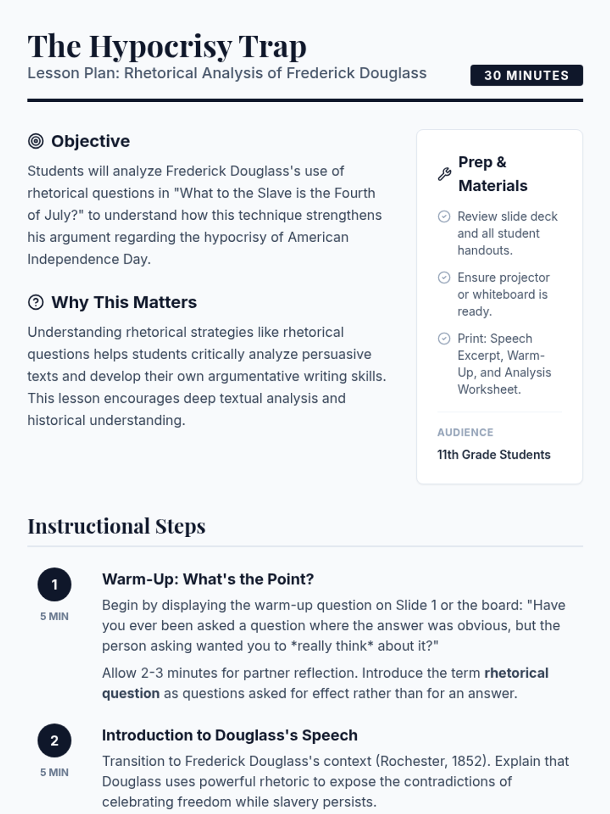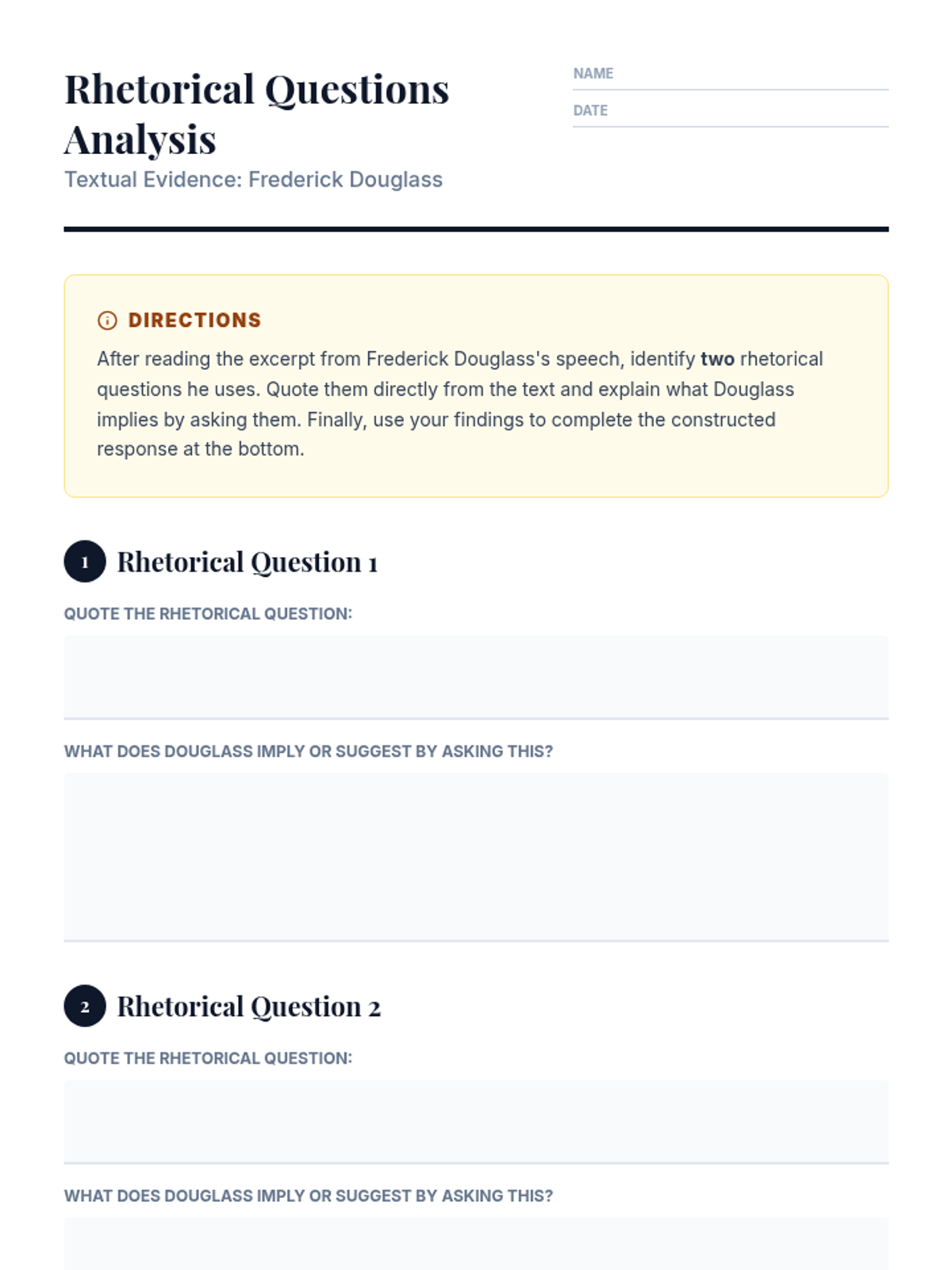 A 30-minute exploration of Frederick Douglass's use of rhetorical questions to expose the hypocrisy of American Independence Day. Students identify and analyze specific rhetorical strategies in his famous 1852 speech.